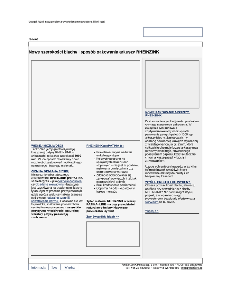Uwaga! Jeżeli masz problem z wyświetlaniem newslettera, kliknij tutaj. 2014.06 Nowe szerokości blachy i sposób pakowania arkuszy RHEINZINK NOWE PAKOWANIE ARKUSZY RHEINZINK WIĘCEJ MOŻLIWOŚCI Teraz oferujemy grafitową wersję klasycznej patyny RHEINZINK w arkuszach i rolkach o szerokości 1000 mm. W ten sposób stwarzamy nowe możliwości zastosowań i aplikacji tego naturalnego i trwałego materiału. CIEMNA ODMIANA CYNKU Niezależnie od ostatecznego zastosowania RHEINZINK prePATINA schiefergrau – jakopokrycie dachowe czyokładzina elewacyjna - ta patyna jest uzyskiwana na powierzchni blachy tytan- cynk w procesie przyspieszonym, gdzie oprócz wielu czynników brane są pod uwagę naturalne czynniki powstawania patyny . Ponieważ nie jest to powłoka, malowana powierzchnia czy fosforowana warstwa - wszystkie pozytywne właściwości naturalnej warstwy patyny pozostają zachowane. Informacja Idea Wypisz RHEINZINK prePATINA to: Prawdziwa patyna na bazie unikalnego stopu Kolorystyka oparta na specjalnych składnikach stopowych – nie jest to powłoka, malowana powierzchnia czy fosforanowana warstwa Zdolność odbudowania się zarysowań powierzchni tak jak na prawdziwej patynie Brak kredowienia powierzchni Odporna na odciski palców w trakcie montażu Tylko materiał RHEINZINK w wersji PATINA- LINE ma trzy prawdziwie i naturalne odmiany klasycznej powierzchni cynku! Dostarczanie wysokiej jakości produktów wymaga starannego pakowania. W związku z tym ponownie zoptymalizowaliśmy nasz sposób pakowania pełnych palet (~1000 kg) arkuszy blachy. Zastosowaliśmy ochronę obwodową krawędzi wykonaną z twardego kartonu o gr. 2 mm, która całkowicie obejmuje brzegi arkuszy oraz użyliśmy stabilnego, powlekanego polietylenem papieru, który skutecznie chroni arkusze przed wilgocią i zarysowaniem. Użycie ochraniaczy krawędzi oraz kilku taśm stalowych umożliwia łatwe mocowane arkuszy do palety i ich bezpieczny transport. WYŚLIJ PROJEKT DO WYCENY Chcesz poznać koszt dachu, elewacji, obróbek czy odwodnienia z blachy RHEINZINK? Nic prostszego! Wyślij projekt, a w oparciu o niego przygotujemy bezpłatnie ofertę wraz z Serwisem na budowie. Więcej >> Zamów próbki blach >> RHEINZINK Polska Sp. z o.o. · Majdan 105 · PL 05-462 Wiązowna tel.: +48 22 7899191 · faks: +48 22 7899199 · [email protected]