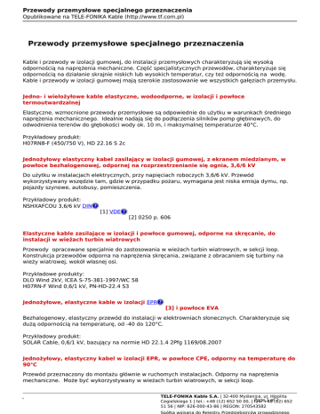 Przewody przemysłowe specjalnego przeznaczenia Opublikowane na TELE-FONIKA Kable (http://www.tf.com.pl) Przewody przemysłowe specjalnego przeznaczenia Kable i przewody w izolacji gumowej, do instalacji przemysłowych charakteryzują się wysoką odpornością na naprężenia mechaniczne. Część specjalistycznych przewodów, charakteryzuje się odpornością na działanie skrajnie niskich lub wysokich temperatur, czy też odpornością na wodę. Kable i przewody w izolacji gumowej mają szerokie zastosowanie we wszystkich gałęziach przemysłu. Jedno- i wielożyłowe kable elastyczne, wodoodporne, w izolacji i powłoce termoutwardzalnej Elastyczne, wzmocnione przewody przemysłowe są odpowiednie do użytku w warunkach średniego naprężenia mechanicznego. Idealnie nadają się do podłączenia silników pomp głębinowych, do odwodnienia terenów do głębokości wody ok. 10 m, i maksymalnej temperaturze 40°C. Przykładowy produkt: H07RN8-F (450/750 V), HD 22.16 S 2c Jednożyłowy elastyczny kabel zasilający w izolacji gumowej, z ekranem miedzianym, w powłoce bezhalogenowej, odpornej na rozprzestrzenianie się ognia, 3,6/6 kV Do użytku w instalacjach elektrycznych, przy napięciach roboczych 3,6/6 kV. Przewód wykorzystywany wszędzie tam, gdzie w przypadku pożaru, wymagana jest niska emisja dymu, np. pojazdy szynowe, autobusy, pomieszczenia. Przykładowy produkt: NSHXAFCOU 3,6/6 kV DIN [1] VDE [2] 0250 p. 606 Elastyczne kable zasilające w izolacji i powłoce gumowej, odporne na skręcanie, do instalacji w wieżach turbin wiatrowych Przewody opracowane specjalnie do zastosowania w wieżach turbin wiatrowych, w sekcji loop. Konstrukcja przewodów odporna na naprężenia skręcania, związane z obracaniem się turbiny na wieży wiatrowej, wokół własnej osi. Przykładowe produkty: DLO Wind 2kV, ICEA S-75-381-1997/WC 58 H07RN-F Wind 0,6/1 kV, PN-HD-22.4 S3 Jednożyłowe, elastyczne kable w izolacji EPR [3] i powłoce EVA Bezhalogenowy, elastyczny przewód do instalacji w elektrowniach słonecznych. Charakteryzuje się dużą odpornością na temperaturę, od -40 do 120°C. Przykładowy produkt: SOLAR Cable, 0,6/1 kV, bazujący na normie HD 22.1.4 2Pfg 1169/08.2007 Jednożyłowy, elastyczny kabel w izolacji EPR, w powłoce CPE, odporny na temperaturę do 90°C Przewód przeznaczony do montażu głównie w ruchomych instalacjach. Odporny na naprężenia mechaniczne. Może być wykorzystywany w wieżach turbin wiatrowych, w sekcji loop. TELE-FONIKA Kable S.A. | 32-400 Myślenice, ul. Hipolita Page+48 1 of(12) 2 652 Cegielskiego 1 | tel.: +48 (12) 652 50 00, | fax: 51 56 | NIP: 626-000-43-86 | REGON: 270543582 Przewody przemysłowe specjalnego przeznaczenia Opublikowane na TELE-FONIKA Kable (http://www.tf.com.pl) Przykładowy produkt: AL-EPR-CPE 0,6/1 kV, bazujący na normie IEC 60502-1 Adres URL źródła: http://www.tf.com.pl/pl/kable-i-przewody-w-izolacji-gumowej/przewody-przemyslowe-specjalnego-prz eznaczenia.html Odnośniki: [1] http://www.tf.com.pl/pl/techniczne/slownik.html#DIN [2] http://www.tf.com.pl/pl/techniczne/slownik.html#VDE [3] http://www.tf.com.pl/pl/techniczne/slownik.html#EPR TELE-FONIKA Kable S.A. | 32-400 Myślenice, ul. Hipolita Page+48 2 of(12) 2 652 Cegielskiego 1 | tel.: +48 (12) 652 50 00, | fax: 51 56 | NIP: 626-000-43-86 | REGON: 270543582 Powered by TCPDF (www.tcpdf.org)