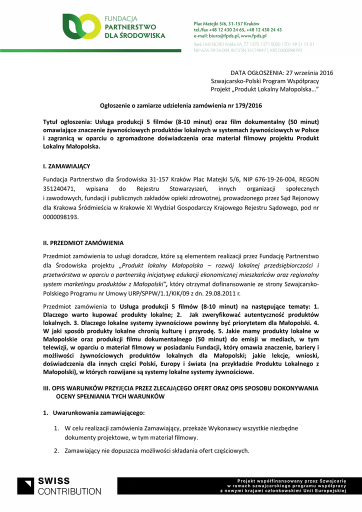 DATA OGŁOSZENIA: 27 września 2016 Szwajcarsko-Polski Polski Program Współpracy Projekt „Produkt Lokalny Małopolska…” Ogłoszenie o zamiarze udzielenia zamówienia nr 179/2016 /2016 Tytuł ogłoszenia: Usługa produkcji 5 filmów (8-10 (8 minut) oraz film dokumentalny (50 minut) omawiające znaczenie żywnościowych produktów lokalnych w systemach żywnościowych w Polsce i zagranicą w oparciu o zgromadzone doświadczenia oraz materiał filmowy projektu Produkt Lokalny Małopolska. I. ZAMAWIAJĄCY Fundacja Partnerstwo dla Środowiska 31-157 31 157 Kraków Plac Matejki 5/6, NIP 676-19-26-004, 676 REGON 351240471, wpisana do Rejestru Stowarzyszeń, innych organizacji społecznych i zawodowych, fundacji i publicznych zakładów opieki zdrowotnej, prowadzonego przez Sąd Rejonowy dla Krakowa Śródmieścia w Krakowie XI Wydział Gospodarczy Krajowego Rejestru Sądowego, pod nr 0000098193. II. PRZEDMIOT ZAMÓWIENIA Przedmiot zamówienia to usługi doradcze, które są elementem realizacji przez Fundację Partnerstwo dla Środowiska projektu „Produkt lokalny Małopolska – rozwój lokalnej przedsiębiorczości i przetwórstwa w oparciu o partnerską inicjatywę edukacji ekonomicznej ekonomicznej mieszkańców oraz regionalny system marketingu produktów z Małopolski”, Małopolski” który otrzymał dofinansowanie ze strony SzwajcarskoSzwajcarsko Polskiego Programu nr Umowy URP/SPPW/1.1/KIK/09 z dn. 29.08.2011 r. Przedmiot zamówienia to Usługa produkcji 5 filmów (8-10 (8 minut) na następujące tematy: 1. Dlaczego warto kupować produkty lokalne; 2. Jak zweryfikować autentyczność produktów lokalnych. 3. Dlaczego lokalne systemy żywnościowe powinny być priorytetem dla Małopolski. 4. W jaki sposób produkty lokalne chronią kulturę i przyrodę. przyrodę. 5. Jakie mamy produkty lokalne w Małopolskie oraz produkcji filmu dokumentalnego (50 minut) do emisji w mediach, w tym telewizji, w oparciu o materiał filmowy w posiadaniu Fundacji, który omawia znaczenie, bariery i możliwości żywnościowych produktów lokalnych dla Małopolski; jakie lekcje, wnioski, doświadczenia dla innych części Polski, Europy i świata (na przykładzie Produktu Lokalnego z Małopolski), w których rozwijane są systemy lokalne systemy żywnościowe. III. OPIS WARUNKÓW PRZYJĘCIA CIA PRZEZ P ZLECAJĄCEGO CEGO OFERT ORAZ OPIS SPOSOBU DOKONYWANIA OCENY SPEŁNIANIA TYCH WARUNKÓW 1. Uwarunkowania zamawiającego: 1. W celu realizacji zamówienia Zamawiający, przekaże Wykonawcy wszystkie niezbędne dokumenty projektowe, w tym materiał filmowy. 2. Zamawiający cy nie dopuszcza możliwości składania ofert częściowych. 3. Rozliczenia między dzy Zamawiającym Zamawiaj a Wykonawcą będą prowadzone w PLN. 4. Zapytanie ofertowe jest przeprowadzane zgodnie z obowiązującym w Fundacji Partnerstwo dla Środowiska Regulaminem Zamówień, które uwzględnia wymogi Szwajcarsko-Polskiego Szwajcarsko Programu Współpracy. 2. Wymagania wobec oferenta 1. Udokumentowane doświadczenie w produkcji filmów o tematyce związanej z żywnością lokalną. 2. Dysponowanie sprzętem i zapleczem technicznym (przykładowo sprzęt o następujących parametrach: kamera s35 np. Sony FS7, statyw sachtler video 25, slider, optyka: canon 24-70 24 f2,8 i canon 70-200 200 f2,8, dzwięk: sennheiser ME 66, mikroport EW112P G2, Zdjęcia w formacie FHD, Apple PRORES 422 HQ, 1920X 1080i 25fps, korekcja korekcja barwna, grafika 2D, 3D, korekcja dźwięku, podstawowe oświetlenie np. typu LED) LED 3. Zaproponowanie formy promocji i emisji filmów informacyjnych oraz filmu dokumentalnego, w tym w telewizji publicznej lub niepublicznej. 4. Zaproponowanie wstępnego scenariusza scenariusza filmów informacyjnych oraz filmu dokumentalnego. 3. Terminy wykonania zamówienia. Zamówienie obejmuje okres do o końca 20.12.2016. 20 IV. OPIS SPOSOBU PRZYGOTOWANIA OFERTY. a. Oferta powinna: • • • • • • posiadać datę sporządzenia, zawierać adres lub siedzibę oferenta, numer telefonu, numer NIP, podpisana czytelnie przez wykonawcę, zawierać proponowane wynagrodzenie miesięczne (brutto) zawierać dokumentację potwierdzającą wymagania wobec oferenta zawierać datę ważności oferty. b. Zaoferowane wynagrodzenie brutto oferenta za realizację usługi w okresie od podpisania umowy do 20.12.2016,, z wyszczególnieniem kosztów oraz harmonogramu realizacji; I. Analiza dokumentacji PLM (w posiadaniu Fundacji oraz jej partnerów) pod kątem filmów, które re mają złożyć się w jedną całość II. Przygotowanie scenariuszy dla każdego z 5 filmów oraz filmu dokumentalnego III. Realizacja zdjęć w celu uzupełnienia materiału filmowego już w posiadaniu Fundacji oraz jej partnerów. IV. Montaż/produkcja 5 filmów oraz filmu dokumentalnego V. Dystrybucja i emisja c. Wynagrodzenie brutto należży wyrazić w jednostkach pieniężnych nych tj. z dokładnością dokładno do dwóch miejsc po przecinku. d. Zamawiający nie ma obowiązku uzasadnienia dokonanego wyboru. V. MIEJSCE ORAZ TERMIN SKŁADANIA OFERT 1. Oferta powinna być przesłana za pośrednictwem: poczty elektronicznej na adres: [email protected], poczty, kuriera lub też dostarczona osobiście na adres: „Produkt Lokalny Małopolska” Fundacja Partnerstwo dla Środowiska Plac Matejki 5/6 31-157 Kraków Do czwartku 5 października 2016 (godz 12.00) wraz z załączoną kserokopią w wypadku firm wypisu z rejestru przedsiębiorców lub zaświadczenia z ewidencji działalności gospodarczej, wystawione w dacie nie wcześniejszej niż sześćć miesięcy przed datą złożenia oferty. 2. Ocena, wyniki yniki i wybór najkorzystniejszej oferty zostanie ogłoszony na stronie internetowej pod adresem www.fpds.pl 3. Oferty złożone po terminie nie będą rozpatrywane. 4. Oferent może przed upływem terminu składania ofert zmienić lub wycofać swoją ofertę. 5. W toku badania i oceny ofert Zamawiający może żądać od oferentów wyjaśnień dotyczących