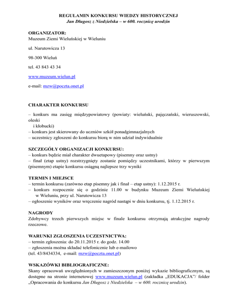 REGULAMIN KONKURSU WIEDZY HISTORYCZNEJ Jan Długosz z Niedzielska – w 600. rocznicę urodzin ORGANIZATOR: Muzeum Ziemi Wieluńskiej w Wieluniu ul. Narutowicza 13 98-300 Wieluń tel. 43 843 43 34 www.muzeum.wielun.pl e-mail: [email protected] CHARAKTER KONKURSU – konkurs ma zasięg międzypowiatowy (powiaty: wieluński, pajęczański, wieruszowski, oleski i kłobucki) – konkurs jest skierowany do uczniów szkół ponadgimnazjalnych – uczestnicy zgłoszeni do konkursu biorą w nim udział indywidualnie SZCZEGÓŁY ORGANIZACJI KONKURSU: – konkurs będzie miał charakter dwuetapowy (pisemny oraz ustny) – finał (etap ustny) rozstrzygnięty zostanie pomiędzy uczestnikami, którzy w pierwszym (pisemnym) etapie konkursu osiągną najlepsze trzy wyniki TERMIN I MIEJSCE – termin konkursu (zarówno etap pisemny jak i finał – etap ustny): 1.12.2015 r. – konkurs rozpocznie się o godzinie 11.00 w budynku Muzeum Ziemi Wieluńskiej w Wieluniu, przy ul. Narutowicza 13 – ogłoszenie wyników oraz wręczenie nagród nastąpi w dniu konkursu, tj. 1.12.2015 r. NAGRODY Zdobywcy trzech pierwszych miejsc w finale konkursu otrzymają atrakcyjne nagrody rzeczowe. WARUNKI ZGŁOSZENIA UCZESTNICTWA: – termin zgłoszenia: do 20.11.2015 r. do godz. 14.00 – zgłoszenia można składać telefonicznie lub e-mailowo (tel. 43/8434334, e-mail: [email protected]) WSKAZÓWKI BIBLIOGRAFICZNE: Skany opracowań uwzględnionych w zamieszczonym poniżej wykazie bibliograficznym, są dostępne na stronie internetowej www.muzeum.wielun.pl (zakładka „EDUKACJA”/ folder „Opracowania do konkursu Jan Długosz z Niedzielska – w 600. rocznicę urodzin). BIBLIOGRAFIA: *Długossiana, Studia historyczne w pięćsetlecie śmierci Jana Długosza, Warszawa 1980, red. S. Gawęda – B. Przybyszewski, Kapituła Krakowska za kanonikatu Jana Długosza (1436 – 1480) – A. Buczek, Mecenat artystyczny Jana Długosza w dziedzinie architektury – M. Biskup, Działalność dyplomatyczna Jana Długosza w sprawach pruskich w latach 1454 – 1466 – S. Cynarski, Uwagi nad problemem recepcji „Historii” Jana Długosza w Polsce XVI i XVII w. *Ecclesia regnum fontes. Studia z dziejów średniowiecza, Warszawa 2014, red. B. Działoszyński – M. Antoniewicz, O pochodzeniu rodziny Długoszów herbu Wieniawa – czyli tropy w poszukiwaniu przodków wielkiego historyka *Zeszyty Długoszowskie, Kłobuck 2002, Nr I – J. Wyrozumski, Znaczenie Jana Długosza w historiografii polskiej – K. Baczkowski, Religijność Jana Długosza i jego fundacje kościelne – M. Antoniewicz, Pochodzenie, krąg rodzinny i związki Jana Długosza z pograniczem wieluńskomałopolskim *Zeszyty Długoszowskie, Kłobuck 2003, Nr II – J. Wyrozumski, O dziełku Jana Długosza Banderia Prutenorum – A. Jackowski, I. Sołjan, Jan Długosz jako geograf *Zeszyty Długoszowskie, Kłobuck 2004, Nr III – ks. J. Związek, Relacje Jana Długosza o Częstochowie i klasztorze jasnogórskim – H. Samsonowicz, Europa czasów Jana Długosza – A. Chwalba, Studenci Akademii Krakowskiej czasów Długosza a studenci współczesnej Alma Mater Jagiellonica – K. Baczkowski, Obraz społeczeństwa polskiego w Rocznikach i Kronikach Jana Długosza *Zeszyty Długoszowskie, Kłobuck 2005, Nr IV – K. Baczkowski, T. Graff, D. Jach, J. Smołucha, U kresu reedycji Annales Jana Długosza – P. Korba, Królowie i książęta w oczach Jana Długosza *Zeszyty Długoszowskie, Kłobuck 2006, Nr V – Z. Górczak, Jan Długosz jako administrator dóbr w służbie biskupa Zbigniewa Oleśnickiego *Zeszyty Długoszowskie, Kłobuck 2007, Nr VI – J. Wyrozumski, Skałka w narodowej tradycji – F. Ziejka, Od Hińczy do Wyspiańskiego *Zeszyty Długoszowskie, Kłobuck 2010, Nr IX – F. Ziejka, Drugi pogrzeb Jana Długosza i powstanie Krypty Zasłużonych na Skałce – K. Baczkowski, Opis bitwy grunwaldzkiej w Annales Jana Długosza w świetle wyników badań najnowszej historiografii *Zeszyty Długoszowskie, Kłobuck 2012, Nr XI – M. Starnawska, Rycerze w habitach w twórczości Jana Długosza – M. Antoniewicz, Rycerstwo z pogranicza małopolsko-wieluńskiego w wielkiej wojnie z Zakonem Krzyżackim w świetle relacji Jana Długosza *Zeszyty Długoszowskie, Kłobuck 2013, Nr XII – J. Szymczak, Broń w Rocznikach, czyli kronikach sławnego Królestwa Polskiego Jana Długosza – M. Antoniewicz, Problem recepcji herbu Wieniawa w Wielkim Księstwie Litewskim do początku XVI wieku *Zeszyty Długoszowskie, Kłobuck 2014, Nr XIII – ks. J. Marecki, Heraldyka w dziełach Jana Długosza – K. Stopka, Najnowsze informacje na temat dzieła Jana Długosza Banderia Prutenorum