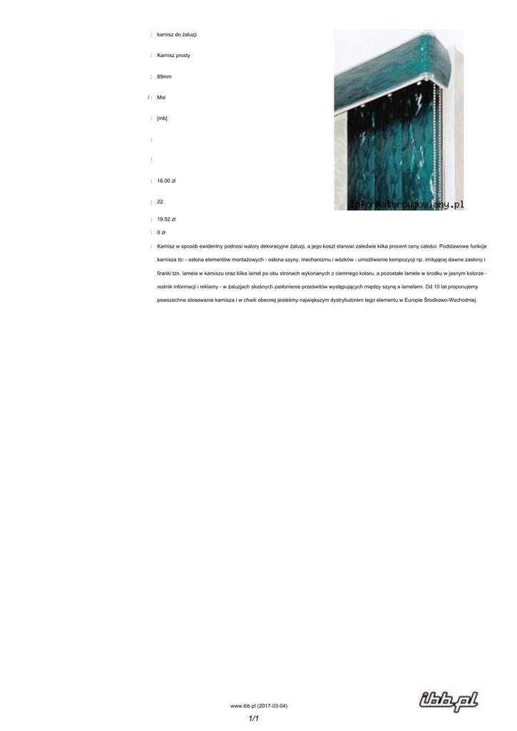 : karnisz do żaluzji : Karnisz prosty : 89mm / : Mol : [mb] : : : 16.00 zł : 22 : 19.52 zł : 0 zł : Karnisz w sposób ewidentny podnosi walory dekoracyjne żaluzji, a jego koszt stanowi zaledwie kilka procent ceny całości. Podstawowe funkcje karnisza to: - osłona elementów montażowych - osłona szyny, mechanizmu i wózków - umożliwienie kompozycji np. imitującej dawne zasłony i firanki tzn. lamela w karniszu oraz klika lamel po obu stronach wykonanych z ciemnego koloru, a pozostałe lamele w środku w jasnym kolorze nośnik informacji i reklamy - w żaluzjach skośnych zasłonienie prześwitów występujących między szyną a lamelami. Od 10 lat proponujemy powszechne stosowanie karnisza i w chwili obecnej jesteśmy największym dystrybutorem tego elementu w Europie Środkowo-Wschodniej. www.ibb.pl (2017-03-04) 1/1