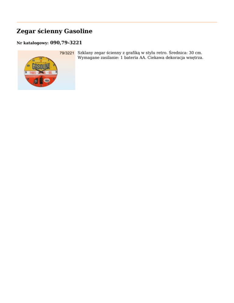 Zegar ścienny Gasoline Nr katalogowy: 090,79-3221 Szklany zegar ścienny z grafiką w stylu retro. Średnica: 30 cm. Wymagane zasilanie: 1 bateria AA. Ciekawa dekoracja wnętrza.
