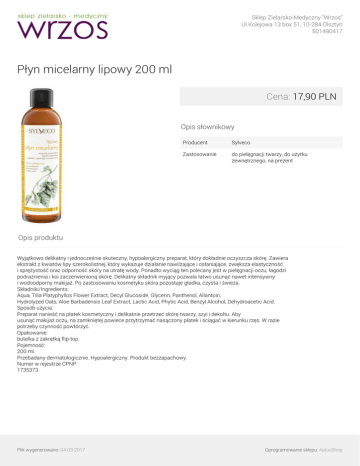 Sklep Zielarsko-Medyczny "Wrzos" Ul.Kolejowa 13 box 51, 10-284 Olsztyn 501490417 Płyn micelarny lipowy 200 ml Cena: 17,90 PLN Opis słownikowy Producent Sylveco Zastosowanie do pielęgnacji twarzy, do użytku zewnętrznego, na prezent Opis produktu Wyjątkowo delikatny i jednocześnie skuteczny, hypoalergiczny preparat, który dokładnie oczyszcza skórę. Zawiera ekstrakt z kwiatów lipy szerokolistnej, który wykazuje działanie nawilżające i osłaniające, zwiększa elastyczność i sprężystość oraz odporność skóry na utratę wody. Ponadto wyciąg ten polecany jest w pielęgnacji oczu, łagodzi podrażnienia i koi zaczerwienioną skórę. Delikatny składnik myjący pozwala łatwo usunąć nawet intensywny i wodoodporny makijaż. Po zastosowaniu kosmetyku skóra pozostaje gładka, czysta i świeża. Składniki/Ingredients: Aqua, Tilia Platyphyllos Flower Extract, Decyl Glucoside, Glycerin, Panthenol, Allantoin, Hydrolyzed Oats, Aloe Barbadensis Leaf Extract, Lactic Acid, Phytic Acid, Benzyl Alcohol, Dehydroacetic Acid. Sposób użycia: Preparat nanieść na płatek kosmetyczny i delikatnie przetrzeć skórę twarzy, szyi i dekoltu. Aby usunąć makijaż oczu, na zamkniętej powiece przytrzymać nasączony płatek i ściągać w kierunku rzęs. W razie potrzeby czynność powtórzyć. Opakowanie: butelka z zakrętką flip-top. Pojemność: 200 ml. Przebadany dermatologicznie. Hypoalergiczny. Produkt bezzapachowy. Numer w rejestrze CPNP: 1735373 Plik wygenerowano: 04-03-2017 Powered by TCPDF (www.tcpdf.org) Oprogramowanie sklepu: AptusShop