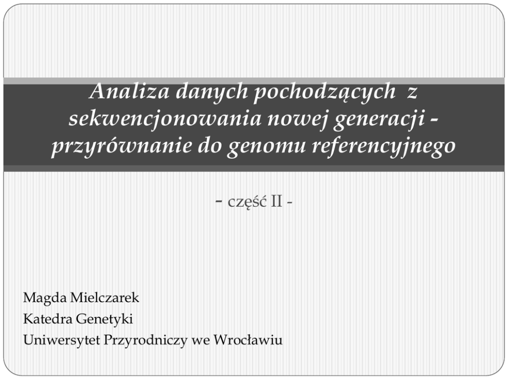 Analiza danych pochodzących z sekwencjonowania nowej generacji przyrównanie do genomu referencyjnego - część II - Magda Mielczarek Katedra Genetyki Uniwersytet Przyrodniczy we Wrocławiu Plan wykładów -------------------------------------------------------- część I --------------------Wstęp: - Sekwencjonowanie nowej generacji (NGS) - Przyrównanie do genomu referencyjnego - Formaty sekwencji (input) Wybór odpowiedniego środowiska i praca w nim Wizualizacja/ analiza sekwencji -------------------------------------------------------- część II -------------------Wybór programów do: - przyrównywania sekwencji - do wizualizacji przyrównania Formaty sekwencji (output) 2 Magda Mielczarek Analiza danych Przyrównanie do sekwencji referencyjnej złożenie krótkich fragmentów read ACTGGGGGGGAAAAA GGGAAAAATTTC GGGAACCTTTC CCTTTCTTTGGA ACTGGGGGGGAAAAATTTCAAAGGGAACCTTTCTTTGGAGGGTT reference *Reads – „podsekwencje” genomu referencyjnego 3 Magda Mielczarek Analiza danych Przyrównanie do sekwencji referencyjnej Single –end 1 plik z read’ami read 1 read 1 Paired – end (mate –pair) 2 pliki read 2 2 końce tej samej cząsteczki DNA informacja o fizycznym dystansie pomiędzy dwoma read’ami w genomie 4 Magda Mielczarek Analiza danych Pokrycie genomu read 1 b read 2 read 1 a read 2 read 1 sekwencja referencyjna 5 Magda Mielczarek Analiza danych read 2 Przyrównanie do sekwencji referencyjnej – programy BWA SOAPaligner Bowtie / Bowtie 2 BFAST CASHX SRmapper 6 Magda Mielczarek Analiza danych SOAPaligner 1. Budowanie indeksów 2bwt- builder – buduje indeksy 38.fasta – sekwencja referencyjna 8 Magda Mielczarek Analiza danych 9 Magda Mielczarek Analiza danych 2. Przyrównanie (single-end reads) -a -D -o 10 query file, for SE reads alignment or one end of PE reads prefix name for reference index [*.index]. output file for alignment results Magda Mielczarek Analiza danych 11 Magda Mielczarek Analiza danych 12 Magda Mielczarek Analiza danych Output SOAPaligner 13 Magda Mielczarek Analiza danych Bowtie 2 1. Budowanie indeksów 1 2 15 Magda Mielczarek Analiza danych 2. Przyrównanie, statystyki 1 2 16 Magda Mielczarek Analiza danych Output – format SAM SAM format - Sequence Alignment/Map Format nagłówek przyrównania 17 Magda Mielczarek Analiza danych Output – format BAM SAM w postaci binarnej Zajmuje mniej miejsca Oszczędza czas (szybsza praca z danymi) samtools picard (pakiet uzupełniający) 18 Magda Mielczarek Analiza danych IGV – Integrative Genomics Viewer http://www.broadinstitute.org/igv/ wizualizacja przyrównania 19 Magda Mielczarek Analiza danych IGV wysokowydajne narzędzie do wizualizacji obsługuje różnorodne typy danych umożliwia dokumentację opracowany w Broad Institute MIT i Harvard 20 Magda Mielczarek Analiza danych IGV 23 Magda Mielczarek Analiza danych 24 Magda Mielczarek Analiza danych Co student powinien wiedzieć? Co to jest przyrównanie do genomu referencyjnego Potrafić wymienić i krótko scharakteryzować wymienione na wykładach formaty sekwencji Potrafić wymienić programy do analizy jakości sekwencji, przyrównania do sekwencji referencyjnej, do wizualizacji przyrównania. 25 Magda Mielczarek Analiza danych Źródła: Elaine R. M. 2008. Next-Generation DNA Sequencing Methods. Annual Review of Genomics and Human Genetics Vol. 9: 387402 Jay S., Hanlee J. 2008. Next-generation DNA sequencing. Nature Biotechnology 26, 1135 - 1145 http://www.ilumina.com/ http://soap.genomics.org.cn/soapaligner.html http://bowtiebio.sourceforge.net/bowtie2/index.shtml http://www.broadinstitute.org/igv/home http://samtools.sourceforge.net/ - Koniec części II - 27 Magda Mielczarek Analiza danych