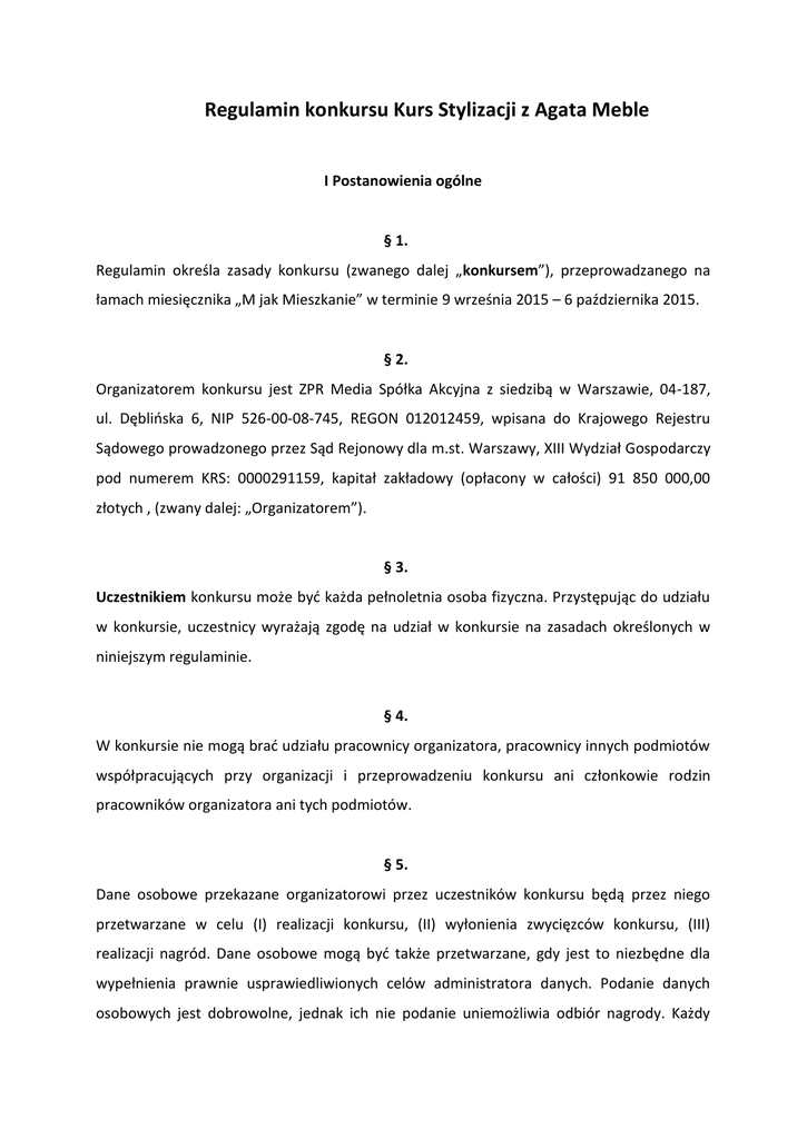 Regulamin konkursu Kurs Stylizacji z Agata Meble I Postanowienia ogólne § 1. Regulamin określa zasady konkursu (zwanego dalej „konkursem”), przeprowadzanego na łamach miesięcznika „M jak Mieszkanie” w terminie 9 września 2015 – 6 października 2015. § 2. Organizatorem konkursu jest ZPR Media Spółka Akcyjna z siedzibą w Warszawie, 04-187, ul. Dęblińska 6, NIP 526-00-08-745, REGON 012012459, wpisana do Krajowego Rejestru Sądowego prowadzonego przez Sąd Rejonowy dla m.st. Warszawy, XIII Wydział Gospodarczy pod numerem KRS: 0000291159, kapitał zakładowy (opłacony w całości) 91 850 000,00 złotych , (zwany dalej: „Organizatorem”). § 3. Uczestnikiem konkursu może być każda pełnoletnia osoba fizyczna. Przystępując do udziału w konkursie, uczestnicy wyrażają zgodę na udział w konkursie na zasadach określonych w niniejszym regulaminie. § 4. W konkursie nie mogą brać udziału pracownicy organizatora, pracownicy innych podmiotów współpracujących przy organizacji i przeprowadzeniu konkursu ani członkowie rodzin pracowników organizatora ani tych podmiotów. § 5. Dane osobowe przekazane organizatorowi przez uczestników konkursu będą przez niego przetwarzane w celu (I) realizacji konkursu, (II) wyłonienia zwycięzców konkursu, (III) realizacji nagród. Dane osobowe mogą być także przetwarzane, gdy jest to niezbędne dla wypełnienia prawnie usprawiedliwionych celów administratora danych. Podanie danych osobowych jest dobrowolne, jednak ich nie podanie uniemożliwia odbiór nagrody. Każdy uczestnik konkursu posiada prawo dostępu do swoich danych osobowych oraz do ich poprawiania lub usunięcia. § 6. Konkurs przeprowadzany jest w terminie: 9 września 2015 – 6 października 2015 II Zasady konkursu § 7. Aby wziąć udział w konkursie należy: - wykonać jedną fotografię aranżacji ulubionego zakątka w mieszkaniu - obserwować profil M jak mieszkanie na Instagramie @m_jak_mieszkanie - zamieścić jedno zdjęcie o którym mowa powyżej na swoim osobistym profilu Instagram i w opisie wpisać: #mjakmieszkanie, #kursstylizacji, #agatameble - jeżeli uczestnik konkursu nie ma profilu na Instagramie, może przesłać jedno zdjęcie aranżacji na adres [email protected] w tylu wpisując "Kurs stylizacji". § 8. Jury dokona wyboru najładniejszych dwudziestu aranżacji, których autorzy nagrodzeni zostaną bonami zakupowymi w wysokości 500 zł. brutto (dla jednej osoby - bon o wartości 500 zł. brutto) do wykorzystania w Salonach Agata Meble. § 9. Nagrodzone zostaną osoby, których aranżacje zostaną przygotowane pomysłowo i kreatywnie, wyróżniając się urodą oraz estetyką. § 11. Lista nagrodzonych osób oraz konkursowe zdjęcia będą opublikowane na łamach miesięcznika „M jak Mieszkanie” wydanie 12/2015 oraz na Instagramie dnia 4.11.2015 r wyniki dla uczestników zamieszczających zdjęcia na serwisie. § 12. Jeden Uczestnik może otrzymać w konkursie 1 nagrodę w czasie trwania konkursu. § 13. W skład Jury konkursowego wchodzą następujące osoby: - Redaktor Naczelna miesięcznika „M jak Mieszkanie” – Agnieszka Gruszczyńska-Hyc - Z-ca Redaktor Naczelnej miesięcznika „M jak Mieszkanie” – Dominika Olszyna - Dyrektor Działu Marketingu – Alicja Strzelczak § 14. Przesłanie zdjęcia konkursowego jest równoznaczne z akceptacją niniejszego Regulaminu oraz wyrażeniem zgody na nieodpłatne i wielokrotne publikowanie zdjęć przez Organizatora § 15. Zamieszczenie zdjęcia zgodnie z warunkami przedstawionymi w § 7 regulaminu jest równoznaczne z oświadczeniem Uczestnika niniejszego konkursu iż przysługują mu wszelkie niezbędne prawa, w tym autorskie prawa majątkowe oraz prawa pokrewne w stosunku do nadesłanych materiałów mających charakter utworów w rozumieniu ustawy o prawie autorskim i prawach pokrewnych, w zakresie niezbędnym dla publikacji, oraz wyrażeniem zgody na publikację przez osoby trzecie. Uczestnik oświadcza również, że materiały, o których mowa w zdaniu poprzednim nie będą naruszały przepisów prawa, ani jakichkolwiek prawem chronionych dóbr osób trzecich. § 16. W przypadku, gdyby którekolwiek z oświadczeń zawartych w ust. 15 niniejszego regulaminu nie zostało zrealizowane, uczestnik konkursu zwolni Organizatora z jakiejkolwiek odpowiedzialności względem osób trzecich. Ponadto, w odniesieniu do treści oświadczenia z ust. 15 niniejszego regulaminu, Uczestnik oświadcza, że Organizator nie będzie zobowiązany do ponoszenia jakichkolwiek opłat na rzecz osób trzecich bądź organizacji reprezentujących twórców i uprawnionych z tytułu praw pokrewnych, tak z Polski, jak i z zagranicy. § 17. Zamieszczenie zdjęcia zgodnie z warunkami przedstawionymi w § 7 regulaminu jest równoznaczne z wyrażeniem zgody Uczestnika na przetwarzanie w celach konkursowych przez ZPR Media S.A. danych osobowych Uczestnika, które Uczestnik przekazuje dobrowolnie, zastrzegając sobie prawo dostępu do nich oraz ich poprawienia. § 18. Organizator prześle laureatom nagrody drogą pocztową, w terminie 60 dni od daty ukazania się w sprzedaży wydania 12/15 miesięcznika „M jak Mieszkanie”. Jeśli nagroda, przesłana zgodnie z niniejszym punktem, nie zostanie odebrana, organizator będzie uprawniony do uznania, że zwycięzca rezygnuje z nagrody. § 19 Organizator zastrzega sobie prawo do możliwości włączenia nagrody/nagród specjalnych, nie przewidzianych w niniejszym regulaminie. § 20. Nagrodzone osoby nie są uprawnione do żądania ekwiwalentu pieniężnego nagrody lub zamiany na inną nagrodę rzeczową. III Postanowienia końcowe § 21. Regulamin jest dostępny w lokalu Organizatora przy ul. Dęblińskiej 6, 04-187 Warszawa w dni: od poniedziałku do piątku w godzinach od 8:00 do 16:00 oraz na stronie www.urzadzamy.pl § 22. Ewentualne reklamacje związane z konkursem mogą być kierowane do Organizatora wyłącznie w formie pisemnej, na adres Organizatora w t