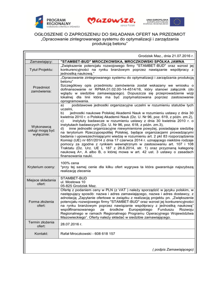 OGŁOSZENIE O ZAPROSZENIU DO SKŁADANIA OFERT NA PRZEDMIOT „Opracowanie zintegrowanego systemu do optymalizacji i zarządzania produkcją betonu” Grodzisk Maz., dnia 21.07.2016 r. Zamawiający: Tytuł Projektu: Przedmiot zamówienia: Wykonawcą usługi mogą być wyłącznie: Kryterium oceny: Miejsce składania ofert: Forma złożenia ofert: Termin złożenia ofert: Kontakt: "STAMBET-BUD" MROCZKOWSKA, MROCZKOWSKI SPÓŁKA JAWNA „Zwiększenie potencjału rozwojowego firmy "STAMBET-BUD" oraz wzrost jej konkurencyjności na rynku branżowym poprzez nawiązanie współpracy z jednostką naukową.” „Opracowanie zintegrowanego systemu do optymalizacji i zarządzania produkcją betonu” Szczegółowy opis przedmiotu zamówienia został wskazany we wniosku o dofinansowanie nr RPMA.01.02.00-14-4514/16, który stanowi załącznik (do wglądu w siedzibie zamawiającego). Dopuszcza się przeprowadzenie wizji lokalnej dla linii która ma być zoptymalizowana poprzez zastosowanie oprogramowania. a) podstawowe jednostki organizacyjne uczelni w rozumieniu statutów tych uczelni, b) jednostki naukowe Polskiej Akademii Nauk w rozumieniu ustawy z dnia 30 kwietnia 2010 r. o Polskiej Akademii Nauk (Dz. U. Nr 96, poz. 619, z późn. zm.2), c) instytuty badawcze w rozumieniu ustawy z dnia 30 kwietnia 2010 r. o instytutach badawczych (Dz. U. Nr 96, poz. 618, z późn. zm.3), d) inne jednostki organizacyjne niewymienione powyżej, posiadające siedzibę na terytorium Rzeczypospolitej Polskiej, będące organizacjami prowadzącymi badania i upowszechniającymi wiedzę w rozumieniu art. 2 pkt 83 rozporządzenia Komisji (UE) nr 651/2014 z dnia 17 czerwca 2014 r. uznającego niektóre rodzaje pomocy za zgodne z rynkiem wewnętrznym w zastosowaniu art. 107 i 108 Traktatu (Dz. Urz. UE L 187 z 26.6.2014, str. 1) oraz przyznaną kategorię naukową A+, A albo B, o której mowa w art. 42 ust. 3 ustawy o zasadach finansowania nauki. 100% cena *przy tej samej cenie dla kilku ofert wygrywa ta która gwarantuje najszybszą realizację zlecenia STAMBET-BUD ul. Mostowa 10 05-825 Grodzisk Maz. Ofertę z podaniem ceny w PLN (z VAT ) należy sporządzić w języku polskim, w następujący sposób: nazwa i adres zamawiającego, nazwa i adres dostawcy, z adnotacją „Zapytanie ofertowe w związku z realizacją projektu pn. „Zwiększenie potencjału rozwojowego firmy "STAMBET-BUD" oraz wzrost jej konkurencyjności na rynku branżowym poprzez nawiązanie współpracy z jednostką naukową” współfinansowanego ze środków Europejskiego Funduszu Rozwoju Regionalnego w ramach Regionalnego Programu Operacyjnego Województwa Mazowieckiego”. Oferty należy składać w siedzibie zamawiającego. 28.07.2016 r. Rafał Mroczkowski - 608 618 157 ( podpis Zamawiającego)