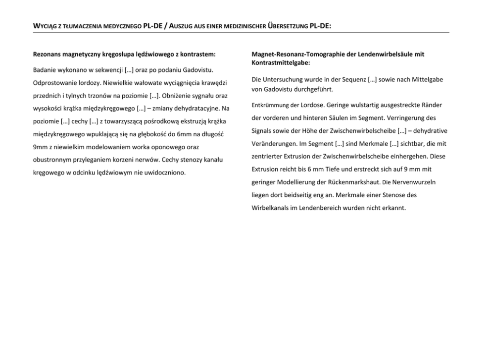 WYCIĄG Z TŁUMACZENIA MEDYCZNEGO PL-DE / AUSZUG AUS EINER MEDIZINISCHER ÜBERSETZUNG PL-DE: Rezonans magnetyczny kręgosłupa lędźwiowego z kontrastem: Magnet-Resonanz-Tomographie der Lendenwirbelsäule mit Kontrastmittelgabe: Badanie wykonano w sekwencji […] oraz po podaniu Gadovistu. Odprostowanie lordozy. Niewielkie wałowate wyciągnięcia krawędzi przednich i tylnych trzonów na poziomie […]. Obniżenie sygnału oraz wysokości krążka międzykręgowego […] – zmiany dehydratacyjne. Na Die Untersuchung wurde in der Sequenz […] sowie nach Mittelgabe von Gadovistu durchgeführt. Entkrümmung der Lordose. Geringe wulstartig ausgestreckte Ränder poziomie […] cechy […] z towarzyszącą pośrodkową ekstruzją krążka der vorderen und hinteren Säulen im Segment. Verringerung des międzykręgowego wpuklającą się na głębokość do 6mm na długość Signals sowie der Höhe der Zwischenwirbelscheibe […] – dehydrative 9mm z niewielkim modelowaniem worka oponowego oraz Veränderungen. Im Segment […] sind Merkmale […] sichtbar, die mit obustronnym przyleganiem korzeni nerwów. Cechy stenozy kanału zentrierter Extrusion der Zwischenwirbelscheibe einhergehen. Diese kręgowego w odcinku lędźwiowym nie uwidoczniono. Extrusion reicht bis 6 mm Tiefe und erstreckt sich auf 9 mm mit geringer Modellierung der Rückenmarkshaut. Die Nervenwurzeln liegen dort beidseitig eng an. Merkmale einer Stenose des Wirbelkanals im Lendenbereich wurden nicht erkannt.