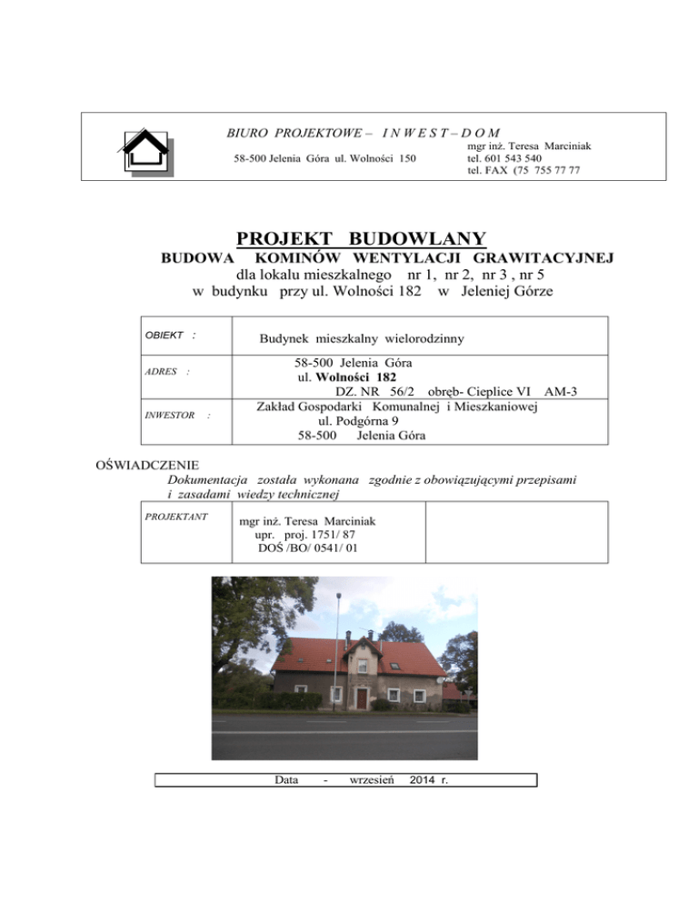 BIURO PROJEKTOWE – I N W E S T – D O M 58-500 Jelenia Góra ul. Wolności 150 mgr inż. Teresa Marciniak tel. 601 543 540 tel. FAX (75 755 77 77 PROJEKT BUDOWLANY BUDOWA KOMINÓW WENTYLACJI GRAWITACYJNEJ dla lokalu mieszkalnego nr 1, nr 2, nr 3 , nr 5 w budynku przy ul. Wolności 182 w Jeleniej Górze OBIEKT : Budynek mieszkalny wielorodzinny ADRES : INWESTOR : 58-500 Jelenia Góra ul. Wolności 182 DZ. NR 56/2 obręb- Cieplice VI AM-3 Zakład Gospodarki Komunalnej i Mieszkaniowej ul. Podgórna 9 58-500 Jelenia Góra OŚWIADCZENIE Dokumentacja została wykonana zgodnie z obowiązującymi przepisami i zasadami wiedzy technicznej PROJEKTANT mgr inż. Teresa Marciniak upr. proj. 1751/ 87 DOŚ /BO/ 0541/ 01 Data - wrzesień 2014 r. ZAWARTOŚĆ OPRACOWANIA strona a/ część opisowa OPINIA KOMINIARSKA 1-2 I / OPIS TECHNICZNY 3-6 II. OPINIA TECHNICZNA O STANIE TECHNICZNYM BUDYNKU 6-7 III/ INFORMACJA DOTYCZĄCA BEZPIECZEŃSTWA I OCHRONY ZDROWIA 7-9 b/ część graficzna RYS. NR 1 Plan sytuacyjny 10 RYS. NR 2 . Rzut parteru –projekt wentylacji -lokal nr 1,2,3 11 RYS. NR 3 Rzut poddasza –projekt wentylacji –lokal nr 5 12 RYS. NR 4 Przekroje – kominy wentylacyjne – lokal nr 1,2,3,5 13 RYS. NR 5 Elewacje budynku - projektowane kominy wentylacyjne 14 c/ załączniki Zaświadczenia o przynależności do Dolnośląskiej Okręgowej Izby Inżynierów Budownictwa 15 I. BUDOWA OPIS TECHNICZNY KOMINÓW WENTYLACJI GRAWITACYJNEJ dla lokalu mieszkalnego nr 1, nr 2, nr 3, nr 5 w budynku mieszkalnym przy ul. Wolności 182 w Jeleniej Górze 1.0. PODSTAWA OPRACOWANIA -Zlecenie Inwestora –Miejski Zakład Gospodarki Komunalnej i Mieszkaniowej w Jeleniej Górze –Wizja lokalna i pomiary inwentaryzacyjne wykonane dla potrzeb projektu - Opinie kominiarskie - Rozporządzenie Ministra Infrastruktury w sprawie warunków technicznych jakie powinny spełniać budynki i ich usytuowanie z dnia 7 kwietnia 2004 z późniejszymi zmianami Dz. U. nr 75 poz.690 , z 2003, nr 33 poz. 270 .; Dz. U . 2004 nr 109 poz.1156. - Prawo Budowlane dz. U. z 2010 r. Nr 243 ,poz.1623-z późniejszymi zmianami ) . - Rozporządzenie Ministra Infrastruktury z dnia 27 kwietnia 2012 r. w sprawie szczegółowego zakresu i formy projektu budowlanego (Dz.U. poz. 462 ) 2.0 ZAKRES OPRACOWANIA Niniejsze opracowanie obejmuje projekt kominów wentylacji grawitacyjnej dla pomieszczenia kuchni i łazienki w lokalu mieszkalnym nr 1,2, 3, 5 przy ul. Wolności 182 w Jeleniej Górze 3.0. OGÓLNY OPIS TECHNICZNY BUDYNKU Budynek mieszkalny wielorodzinny , wolnostojący , jednokondygnacyjny ,z poddaszem użytkowym . Dach stromy dwuspadowy ,konstrukcji drewnianej . Pokrycie dachu –dachówka . Obiekt wykonany w technologii tradycyjnej . Ściany murowane z cegły , stropy drewniane Lokal mieszkalny nr 1, 2, 3 znajduje się na parterze . Lokal mieszkalny nr 5 znajduje się na poddaszu użytkowym . 4.0. DANE TECHNICZNE WYKONANIA WENTYLACJI GRAWITACYJNEJ W lokalach mieszkalnych nr 1, nr2 , nr 3 i nr 5 pomieszczenia kuchni i łazienki nie posiadają wentylacji Z uwagi na brak kominów wentylacyjnych ,zachodzi konieczność wykonania dodatkowych kominów wentylacji grawitacyjnej . Dla wymienionych wyżej lokali mieszkalnych zaprojektowano wentylacje nawiewno-wywiewnej. Wentylacja wywiewna W lokalu mieszkalnym Nr 1, nr 2 i nr3 dla pomieszczeń kuchni łazienki zaprojektowano zewnętrzne kominy wentylacji grawitacyjnej z rur stalowych dwupłaszczowych ocynkowanych , Komin ø 150 mm /225 , z warstwą izolacji termicznej 50 mm. Kominy należy wykonać na ścianie zewnętrznej budynku z wyprowadzeniem ponad dach budynku (wg rys. ) . W lokalu mieszkalnym nr 3 wentylację grawitacyjną łazienki zaprojektowano jako wentylację pośrednią poprzez pomieszczenie kuchni W tym celu w ściance działowej pomiędzy kuchnią , a łazienką , pod sufitem ,należy wykonać otwór wentylacyjny o wym. min. 0,50 x 0,15 cm umieszczony w ściance pod sufitem , zapewniający wentylację kuchni W lokalu nr 5 –na poddaszu , dla pomieszczenia łazienki zaprojektowano komin wewnętrzny z rury stalowej dwupłaszczowej ocynkowanej , wyprowadzony poprzez strop i dach ponad dach . (wg rys.) Z uwagi na zapewnienie drożności komina na poddaszu , średnica komina powinna wynosić ø 200/275 mm . Kominy można wykonać w jednym z systemów np. „Komin-Flex” ,” Jawar” , „Spiroflex” , „Wadex” itp. Przewody kominowe wentylacji grawitacyjnej prowadzone po zewnętrznej ścianie budynku należy mocować do ścian przy zastosowaniu stalowych obejm montażowych wzmocnionych , wykonanych z płaskownika 5x50 mm( stal ST3SX) , kotwionych do ściany zewnętrznej .Obejmy w rozstawie max co 1,5 m , wykonane ze stali szlachetnej , mocowane do ściany zewnętrznej na dwie śruby rozporowe 2φ 10 mm –po obydwu stronach rury .W dolnej części komin podparty płytą kotwową , opartą na stalowym wsporniku z blachy szlachetnej (kształtowniki systemowe ) .Wsporniki przymocowane do ściany zewnętrznej kołkami -8φ10 mm. W otworach wentylacyjnych w ścianach należy zastosować kratkę wentylacyjną o wym. .140 x 210 mm oraz w stropie ( na poddaszu ) kratkę o średnicy ø150 mm. Przejście przewodów wentylacji przez mur wykonać w tulei stalowej umieszczonej w murze. Wolne przestrzenie pomiędzy tuleją , a murem należy uzupełnić mocną zaprawą cementową marki min. „8 „.Przejście przez stropodach w lokalu nr 5 (poddasze ) tuleję prowadzić poprzez stalową i starannie uszczelnić . Odległość między górną krawędzią otworu wentylacyjnego w ścianie ,a sufitem powinna wynosić max. 15 cm . Kominy prowadzone po ścianie zewnętrznej wyprowadzić ponad dach na wysokość min. 0,80÷100 m od połaci dachu .Komin wewnętrzny na poddaszu należy wyprowadzić ponad dach na wysokość min.1,50m Na wylocie każdego komina należy zamontować obrotową nasadę kominową , która zapewni odpowiedni ciąg kominowy . W miejscu przejścia przewodu kominowego przez połać dachu nal