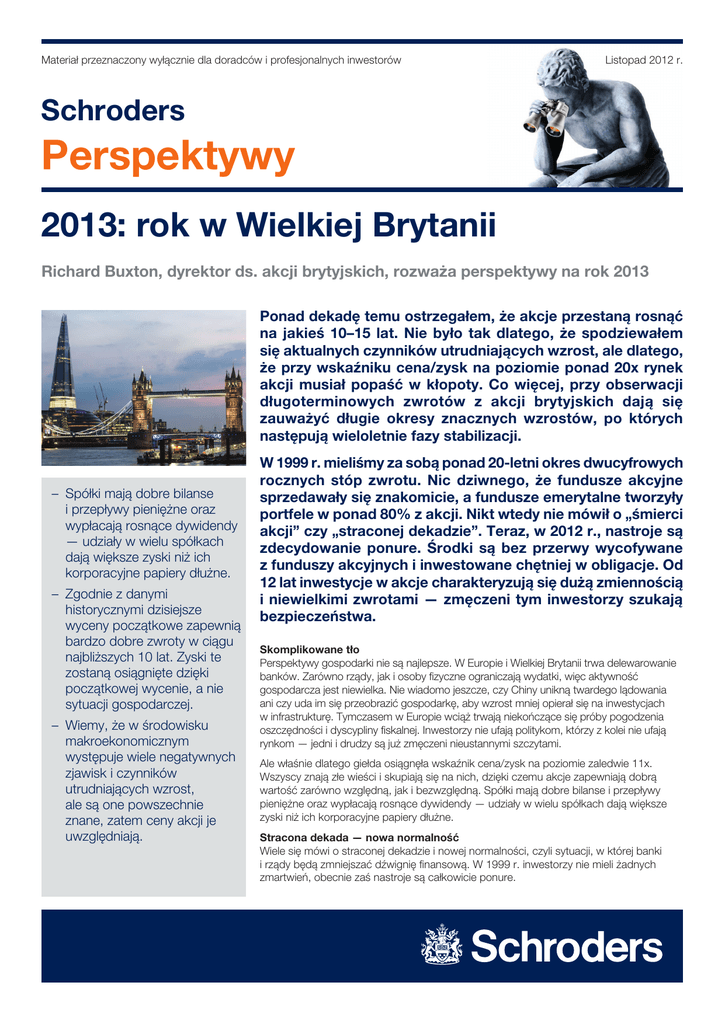 Materiał przeznaczony wyłącznie dla doradców i profesjonalnych inwestorów Listopad 2012 r. Schroders Perspektywy 2013: rok w Wielkiej Brytanii Richard Buxton, dyrektor ds. akcji brytyjskich, rozważa perspektywy na rok 2013 Ponad dekadę temu ostrzegałem, że akcje przestaną rosnąć na jakieś 10–15 lat. Nie było tak dlatego, że spodziewałem się aktualnych czynników utrudniających wzrost, ale dlatego, że przy wskaźniku cena/zysk na poziomie ponad 20x rynek akcji musiał popaść w kłopoty. Co więcej, przy obserwacji długoterminowych zwrotów z akcji brytyjskich dają się zauważyć długie okresy znacznych wzrostów, po których następują wieloletnie fazy stabilizacji. –– Spółki mają dobre bilanse i przepływy pieniężne oraz wypłacają rosnące dywidendy — udziały w wielu spółkach dają większe zyski niż ich korporacyjne papiery dłużne. –– Zgodnie z danymi historycznymi dzisiejsze wyceny początkowe zapewnią bardzo dobre zwroty w ciągu najbliższych 10 lat. Zyski te zostaną osiągnięte dzięki początkowej wycenie, a nie sytuacji gospodarczej. –– Wiemy, że w środowisku makroekonomicznym występuje wiele negatywnych zjawisk i czynników utrudniających wzrost, ale są one powszechnie znane, zatem ceny akcji je uwzględniają. W 1999 r. mieliśmy za sobą ponad 20-letni okres dwucyfrowych rocznych stóp zwrotu. Nic dziwnego, że fundusze akcyjne sprzedawały się znakomicie, a fundusze emerytalne tworzyły portfele w ponad 80% z akcji. Nikt wtedy nie mówił o „śmierci akcji” czy „straconej dekadzie”. Teraz, w 2012 r., nastroje są zdecydowanie ponure. Środki są bez przerwy wycofywane z funduszy akcyjnych i inwestowane chętniej w obligacje. Od 12 lat inwestycje w akcje charakteryzują się dużą zmiennością i niewielkimi zwrotami — zmęczeni tym inwestorzy szukają bezpieczeństwa. Skomplikowane tło Perspektywy gospodarki nie są najlepsze. W Europie i Wielkiej Brytanii trwa delewarowanie banków. Zarówno rządy, jak i osoby fizyczne ograniczają wydatki, więc aktywność gospodarcza jest niewielka. Nie wiadomo jeszcze, czy Chiny unikną twardego lądowania ani czy uda im się przeobrazić gospodarkę, aby wzrost mniej opierał się na inwestycjach w infrastrukturę. Tymczasem w Europie wciąż trwają niekończące się próby pogodzenia oszczędności i dyscypliny fiskalnej. Inwestorzy nie ufają politykom, którzy z kolei nie ufają rynkom — jedni i drudzy są już zmęczeni nieustannymi szczytami. Ale właśnie dlatego giełda osiągnęła wskaźnik cena/zysk na poziomie zaledwie 11x. Wszyscy znają złe wieści i skupiają się na nich, dzięki czemu akcje zapewniają dobrą wartość zarówno względną, jak i bezwzględną. Spółki mają dobre bilanse i przepływy pieniężne oraz wypłacają rosnące dywidendy — udziały w wielu spółkach dają większe zyski niż ich korporacyjne papiery dłużne. Stracona dekada — nowa normalność Wiele się mówi o straconej dekadzie i nowej normalności, czyli sytuacji, w której banki i rządy będą zmniejszać dźwignię finansową. W 1999 r. inwestorzy nie mieli żadnych zmartwień, obecnie zaś nastroje są całkowicie ponure. Perspektywy na rok 2013: rok w Wielkiej Brytanii „To właśnie początkowe wyceny są kluczem do uzyskania zwrotów w przyszłości, a nie otoczenie ekonomiczne”. Co ważne, w 2012 r. trudno było pogodzić oficjalne dane o PKB — według których gospodarka była w recesji przez większość roku — z informacjami otrzymanymi od spółek. Spółki mówią nam: „Nie jest dużo lepiej, ale nie jest też gorzej”. Powolny i nierówny, ale postępujący spadek inflacji powinien sprzyjać stopniowemu wzrostowi realnych dochodów. „W ciągu ostatnich 12 lat już dwukrotnie osiągnęliśmy najniższe ceny brytyjskich akcji, gdy wartość indeksu FTSE 100 spadła poniżej 3500. Jesteśmy u progu nowego okresu zwyżek”. Mimo że w bankach trudno otrzymać kredyt, procentowy wzrost netto liczby firm (liczba powstających firm pomniejszona o liczbę bankructw) jest dwucyfrowy. Dla brytyjskiej gospodarki bardzo ważne jest powstawanie nowych firm, ponieważ większość miejsc pracy tworzona jest w małych przedsiębiorstwach, nie w dużych. Zatrudnienie w sektorze publicznym nadal spada, ale w sektorze prywatnym powstaje tyle nowych miejsc pracy, że ogółem bezrobocie maleje. Trzy powody do niepokoju… Inwestorzy mają w tej chwili trzy zmartwienia. Czy Stany Zjednoczone unikną przepaści fiskalnej? Czy Chinom uda się miękko wylądować? Czy Europa zbliży się do rozwiązania kryzysu banków publicznych? Sądzę, że w 2013 r. obawy na wszystkich trzech frontach zmaleją. Stany Zjednoczone prawdopodobnie ustalą politykę fiskalną, dzięki której przepaść zmieni się w łagodną pochyłość. Amerykańskie banki znowu udzielają kredytów, a sytuacja na rynku nieruchomości poprawia się, co zwiększa optymizm konsumentów. W związku z tym pozytywne porozumienie bardzo poprawi nastroje wśród przedsiębiorstw. Wydatki były ograniczane w oczekiwaniu na wybory prezydenckie i negocjacje w sprawie przepaści fiskalnej, ale zadowalający wynik powinien zwiększyć inwestycje i zamówienia. Zwiększona aktywność w Stanach Zjednoczonych może wyprzedzać globalny wzrost w 2013 r. Podobnie w Chinach, gdzie minął okres zmniejszonej aktywności władz poprzedzający zmiany na szczycie, lepsze dane gospodarcze i umiarkowana stymulacja mogą zmniejszyć obawy przed twardym lądowaniem. Przy rosnącej aktywności w Stanach Zjednoczonych i Chinach nawet europejskie problemy mogą nie zdominować nastrojów wśród inwestorów. W tym roku poczyniono znaczne postępy na wieloletniej drodze w stronę unii fiskalnej i odpowiedniego połączenia oszczędności, reform oraz transferów fiskalnych. Tendencja ta powinna się utrzymać w 2013 r. …i jedno najważniejsze zmartwienie Inwestorzy najbardziej obawiają się, że skala zad