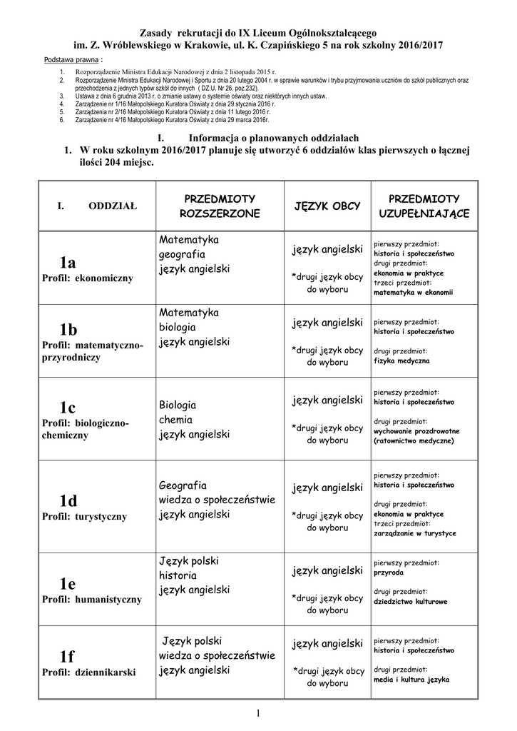 Zasady rekrutacji do IX Liceum Ogólnokształcącego im. Z. Wróblewskiego w Krakowie, ul. K. Czapińskiego 5 na rok szkolny 2016/2017 Podstawa prawna : 1. 2. 3. 4. 5. 6. Rozporządzenie Ministra Edukacji Narodowej z dnia 2 listopada 2015 r. Rozporządzenie Ministra Edukacji Narodowej i Sportu z dnia 20 lutego 2004 r. w sprawie warunków i trybu przyjmowania uczniów do szkół publicznych oraz przechodzenia z jednych typów szkół do innych ( DZ.U. Nr 26, poz.232). Ustawa z dnia 6 grudnia 2013 r. o zmianie ustawy o systemie oświaty oraz niektórych innych ustaw. Zarządzenie nr 1/16 Małopolskiego Kuratora Oświaty z dnia 29 stycznia 2016 r. Zarządzenia nr 2/16 Małopolskiego Kuratora Oświaty z dnia 11 lutego 2016 r. Zarządzenie nr 4/16 Małopolskiego Kuratora Oświaty z dnia 29 marca 2016r. I. Informacja o planowanych oddziałach 1. W roku szkolnym 2016/2017 planuje się utworzyć 6 oddziałów klas pierwszych o łącznej ilości 204 miejsc. I. ODDZIAŁ 1a Profil: ekonomiczny 1b Profil: matematycznoprzyrodniczy 1c Profil: biologicznochemiczny 1d Profil: turystyczny 1e Profil: humanistyczny 1f Profil: dziennikarski PRZEDMIOTY ROZSZERZONE Matematyka geografia język angielski JĘZYK OBCY język angielski *drugi język obcy do wyboru Matematyka biologia język angielski Biologia chemia język angielski Geografia wiedza o społeczeństwie język angielski Język polski historia język angielski 1 pierwszy przedmiot: historia i społeczeństwo drugi przedmiot: ekonomia w praktyce trzeci przedmiot: matematyka w ekonomii język angielski pierwszy przedmiot: historia i społeczeństwo *drugi język obcy do wyboru drugi przedmiot: fizyka medyczna język angielski pierwszy przedmiot: historia i społeczeństwo *drugi język obcy do wyboru drugi przedmiot: wychowanie prozdrowotne (ratownictwo medyczne) język angielski pierwszy przedmiot: historia i społeczeństwo *drugi język obcy do wyboru drugi przedmiot: ekonomia w praktyce trzeci przedmiot: zarządzanie w turystyce język angielski pierwszy przedmiot: przyroda *drugi język obcy do wyboru Język polski wiedza o społeczeństwie język angielski PRZEDMIOTY UZUPEŁNIAJĄCE drugi przedmiot: dziedzictwo kulturowe język angielski pierwszy przedmiot: historia i społeczeństwo *drugi język obcy do wyboru drugi przedmiot: media i kultura języka II. Terminy działań Komisji Rekrutacyjno – Kwalifikacyjnej 1. Zgodnie z decyzją Małopolskiego Kuratora Oświaty w Krakowie z dnia 11 lutego 2016 r. ustala się następujące terminy: a) Termin składania dokumentów – od 11 kwietnia do 10 czerwca 2016 r. do 15.00; kandydaci kończący gimnazjum, które objęte jest systemem rekrutacji elektronicznej, dokonują rejestracji w macierzystym gimnazjum; Dokumenty należy składać codziennie od poniedziałku do piątku w godzinach od 13:00 – 15:00, parter p. nr 4. b) Dostarczenie do wybranych szkół kopii świadectwa i zaświadczenia o wynikach egzaminu gimnazjalnego – od 24 czerwca do 28 czerwca 2016 roku do 15.00; z wyjątkiem szkół będących w systemie rekrutacji elektronicznej; c) Termin ogłoszenia przez Szkolną Komisję Kwalifikacyjno-Rekrutacyjną list kandydatów zakwalifikowanych do IX Liceum oraz listy kandydatów niezakwalifikowanych do przyjęcia do oddziałów klas pierwszych – 1 lipca 2016 roku o 15.00; d) Termin potwierdzenia woli nauki w IX Liceum poprzez dostarczenie oryginału świadectwa ukończenia gimnazjum i oryginału zaświadczenia o wynikach egzaminu gimnazjalnego oraz karty informacyjnej – najpóźniej do 12 lipca 2016 roku do 15.00; e) Termin ogłoszenia przez Szkolną Komisję Kwalifikacyjno-Rekrutacyjną listy uczniów przyjętych do IX Liceum, którzy potwierdzili wolę nauki w liceum – 13 lipca 2016 roku o 12.00 ; f) Rekrutacja uzupełniająca – od 14 lipca do 31 sierpnia 2016 r. do 12.00. 2. Teczka z dokumentami powinna zawierać: a) podanie o przyjęcie do szkoły ponadgimnazjalnej; b) dwa zdjęcia typu legitymacyjnego podpisane na odwrocie (imię i nazwisko, data urodzenia, adres zamieszkania); c) oryginał świadectwa ukończenia gimnazjum; d) oryginał zaświadczenia o wyniku egzaminu (dołączyć w dniu jego otrzymania); e) zaświadczenie/zaświadczenia o uzyskaniu tytułu laureata lub finalisty konkursów; f) kopię odpisu skróconego aktu urodzenia; g) opinie poradni psychologiczno-pedagogicznej (jeśli uczeń je posiada), w przypadku kandydatów z wadami wzroku, słuchu , narządu ruchu i innymi schorzeniami wymagane jest orzeczenie kwalifikacyjne publicznej poradni psychologiczno – pedagogicznej, w tym publicznej poradni specjalistycznej; III. Punktacja i szczegółowe zasady rekrutacji Warunki przyjęcia do IX Liceum: 1. O przyjęciu do liceum decyduje łączna liczba punktów uzyskanych jako: a) wynik egzaminu gimnazjalnego – łącznie 100 pkt. b) suma punktów pochodzących z przeliczenia ocen na świadectwie ukończenia gimnazjum (z języka polskiego i trzech wybranych obowiązkowych zajęć edukacyjnych) – maksymalnie 80 pkt. c) punkty za szczególne osiągnięcia ucznia w okresie pobytu w gimnazjum – maksymalnie 20 pkt. 2. Kandydat do liceum może maksymalnie zdobyć 200 pkt. (100 pkt. + 80 pkt. + 20 pkt.). 3. Kandydaci do IX Liceum będą przyjmowani w kolejności, którą wyznaczy liczba uzyskanych punktów o jakich mowa w pkt. 1. a), b), c) niniejszego regulaminu, aż do wyczerpania miejsc, którymi dysponuje liceum. 4. Kandydaci przyjęci do IX Liceum będą kierowani do wybranych oddziałów według ilości uzyskanych punktów. Pozostałym kandydatom, przyjętym do liceum, dla których liczba 2 uzyskanych punktów będzie niewystarczająca żeby dostać się do wybranego oddziału zostaną zaproponowane inne oddziały dysponujące wolnymi miejscami. Dopuszcza się również możliwość zwiększenia liczby oddziałów cieszących się największym wyborem kosztem rezygnacji z utworzenia oddziału o małym zainteresowaniu kandydatów. 5. Kandydatom do szkół ponadgimnazj