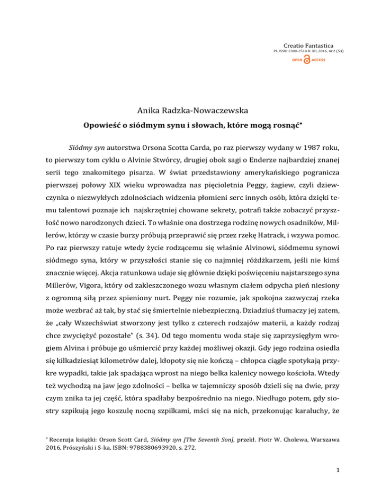 Creatio Fantastica PL ISSN: 2300-2514 R. XII, 2016, nr 2 (53) Anika Radzka-Nowaczewska Opowieść o siódmym synu i słowach, które mogą rosnąć Siódmy syn autorstwa Orsona Scotta Carda, po raz pierwszy wydany w 1987 roku, to pierwszy tom cyklu o Alvinie Stwórcy, drugiej obok sagi o Enderze najbardziej znanej serii tego znakomitego pisarza. W świat przedstawiony amerykańskiego pogranicza pierwszej połowy XIX wieku wprowadza nas pięcioletnia Peggy, żagiew, czyli dziewczynka o niezwykłych zdolnościach widzenia płomieni serc innych osób, która dzięki temu talentowi poznaje ich najskrzętniej chowane sekrety, potrafi także zobaczyć przyszłość nowo narodzonych dzieci. To właśnie ona dostrzega rodzinę nowych osadników, Millerów, którzy w czasie burzy próbują przeprawić się przez rzekę Hatrack, i wzywa pomoc. Po raz pierwszy ratuje wtedy życie rodzącemu się właśnie Alvinowi, siódmemu synowi siódmego syna, który w przyszłości stanie się co najmniej różdżkarzem, jeśli nie kimś znacznie więcej. Akcja ratunkowa udaje się głównie dzięki poświęceniu najstarszego syna Millerów, Vigora, który od zakleszczonego wozu własnym ciałem odpycha pień niesiony z ogromną siłą przez spieniony nurt. Peggy nie rozumie, jak spokojna zazwyczaj rzeka może wezbrać aż tak, by stać się śmiertelnie niebezpieczną. Dziadziuś tłumaczy jej zatem, że „cały Wszechświat stworzony jest tylko z czterech rodzajów materii, a każdy rodzaj chce zwyciężyć pozostałe” (s. 34). Od tego momentu woda staje się zaprzysięgłym wrogiem Alvina i próbuje go uśmiercić przy każdej możliwej okazji. Gdy jego rodzina osiedla się kilkadziesiąt kilometrów dalej, kłopoty się nie kończą – chłopca ciągle spotykają przykre wypadki, takie jak spadająca wprost na niego belka kalenicy nowego kościoła. Wtedy też wychodzą na jaw jego zdolności – belka w tajemniczy sposób dzieli się na dwie, przy czym znika ta jej część, która spadłaby bezpośrednio na niego. Niedługo potem, gdy siostry szpikują jego koszulę nocną szpilkami, mści się na nich, przekonując karaluchy, że Recenzja książki: Orson Scott Card, Siódmy syn [The Seventh Son], przekł. Piotr W. Cholewa, Warszawa 2016, Prószyński i S-ka, ISBN: 9788380693920, s. 272. 1 w pokoju dziewczynek czeka na nie smaczne jedzenie. Pojawia się wtedy Jaśniejący Człowiek i pokazuje mu, że karaluchy zginęły, by on miał dobrą zabawę i mógł się zemścić, że postąpił niewłaściwie. Alvin obiecuje wtedy, że już nigdy nie użyje swojego talentu dla własnych celów. Jednak dopiero Bajarz, wędrowny zbieracz opowieści, właściciel niezwykłej Księgi Przysłów, który potrafi dostrzec magię i określić, czy jest ona boska czy diabelska, pomaga chłopcu zrozumieć naturę daru Stwórcy i staje się jego pierwszym prawdziwym mentorem. To dzięki niemu Alvin dowiaduje się, że istnieje Niszczyciel, który ma moc całkowicie odwrotną do tej, którą włada on sam. Pragnie wszystko zniszczyć, a ludzie, robiąc złe rzeczy, nieświadomie mu w tym pomagają. Czy młody, niedoświadczony, niezbyt pewny siebie, choć uparty i wiecznie ścigany przez wodę chłopak ma jakiekolwiek szanse przeciwstawić się takiej sile? Opowieść o Alvinie tylko z pozoru jest prosta i nieskomplikowana. Po pierwsze, łatwo pominąć fakt, że świat przedstawiony to alternatywna wersja historii, w której brytyjski Lord Protektor Cromwell dożył późnej starości, a monarchia nie została restaurowana (po szczegóły odsyłam do znakomitego posłowia napisanego przez Andrzeja Sapkowskiego). Autor zgrabnie wplata przy tym amerykańską mitologię – Ben Franklin także był Stwórcą, a za największą rzecz, którą stworzył, uznał nazwę „Amerykanie”. I, rzecz jasna, wpisał to do księgi Bajarza. Po drugie, ponieważ istnieją siły boskie i diabelskie, a tylko nieliczni (jak Bajarz lub żagwie) potrafią dostrzec ich prawdziwą naturę, świat dla zwykłych ludzi jest niezwykle niebezpieczny, nawet nieświadomie mogą się bowiem przyczyniać do jego zniszczenia. Co gorsza, może im się nawet wydawać, że grają po dobrej stronie – jak dzieje się to w przypadku wielebnego Throwera. Jest on tak przekonany o własnej nieomylności, wyższości nad innymi i zapatrzony w misję chrystianizacji osadników, że popełnia grzech pychy i nie zauważa, kim naprawdę jest istota, którą bez wahania uznał za anioła. Ponadto magia, którą posługuje się większość osób w rodzinie Millerów, może chronić dom czy łagodzić konflikty, ale są tacy, którzy jej nienawidzą i tępią ją z założenia, zupełnie jej nie rozumiejąc. Po trzecie, istotnym motywem tej powieści jest walka z samym sobą – Vigor poświęca życie, Alvin musi wyrzec się samolubności i nauczyć się, jak poradzić sobie z atakami Niszczyciela, również ojciec chłopca czy żagiew Peggy toczą swoje niełatwe batalie. Przy czym autor potrafi naprawdę przejmująco oddać sposób myślenia każdego z nich. Na uwagę zasługuje także postać samego Bajarza, wzorowanego na Williamie Blake'u – poprzez niego autor zadaje bardzo ważne pytanie o rolę pisarza w społeczeństwie. „Słowa mogą rosnąć, podczas gdy rzeczy są zawsze tylko tym, 2 czym są” (s.138) – mówi Alvinowi Bajarz. To nie przypadek, że to właśnie on widzi prawdziwą naturę rzeczy, że przekazuje innym tylko prawdziwie historie, wymieniając za darmo jedną opowieść na inną. Nic więc dziwnego, że nie wszędzie jest przyjmowany z otwartymi ramionami, jednak niezłomnie uzupełnia Księgę Przysłów i podróżuje po kraju, by dzielić się historiami. Orson Scott Card to pisarz w każdym calu niezwykły – na kanwie pozornie prostej opowieści zadaje pytania o podstawowe wartości, którymi powinniśmy kierować się w życiu. W Siódmym synu nie ma ani jednej przypadkowej postaci czy zwrotu akcji, każde najdrobniejsze wyda