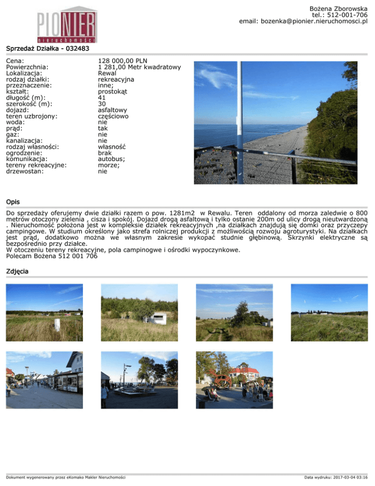 Bożena Zborowska tel.: 512-001-706 email: [email protected] Sprzedaż Działka - 032483 Cena: Powierzchnia: Lokalizacja: rodzaj działki: przeznaczenie: kształt: długość (m): szerokość (m): dojazd: teren uzbrojony: woda: prąd: gaz: kanalizacja: rodzaj własności: ogrodzenie: komunikacja: tereny rekreacyjne: drzewostan: 128 000,00 PLN 1 281,00 Metr kwadratowy Rewal rekreacyjna inne; prostokąt 41 30 asfaltowy częściowo nie tak nie nie własność brak autobus; morze; nie Opis Do sprzedaży oferujemy dwie działki razem o pow. 1281m2 w Rewalu. Teren oddalony od morza zaledwie o 800 metrów otoczony zielenia , cisza i spokój. Dojazd drogą asfaltową i tylko ostanie 200m od ulicy drogą nieutwardzoną . Nieruchomość położona jest w kompleksie działek rekreacyjnych ,na działkach znajdują się domki oraz przyczepy campingowe. W studium określony jako strefa rolniczej produkcji z możliwością rozwoju agroturystyki. Na działkach jest prąd, dodatkowo można we własnym zakresie wykopać studnie głębinową. Skrzynki elektryczne są bezpośrednio przy działce. W otoczeniu tereny rekreacyjne, pola campinogwe i ośrodki wypoczynkowe. Polecam Bożena 512 001 706 Zdjęcia Dokument wygenerowany przez eKomako Makler Nieruchomości Data wydruku: 2017-03-04 03:16