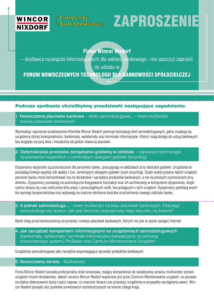 ZAPROSZENIE Firma Wincor Nixdorf – dostawca rozwiązań informatycznych dla sektora bankowego - ma zaszczyt zaprosić do udziału w FORUM NOWOCZESNYCH TECHNOLOGII DLA BANKOWOŚCI SPÓŁDZIELCZEJ Podczas spotkania chcielibyśmy przedstawić następujące zagadnienia: 1. Nowoczesna placówka bankowa – strefy samoobsługowe... - nowe możliwości rozwoju placówek bankowych Wychodząc naprzeciw oczekiwaniom Klientów Wincor Nixdorf promuje koncepcję stref samoobsługowych, gdzie znajdują się urządzenia różnej funkcjonalności: bankomaty, wpłatomaty oraz terminale informacyjne. Klienci mają dostęp do usług bankowych bez względu na porę dnia i niezależnie od godzin otwarcia placówki. 2. Optymalizacja procesów zarządzania gotówką w oddziale – najnowsza technologia dyspenserów kasjerskich z zamkniętym obiegiem gotówki (recycling) Dyspensery kasjerskie są przeznaczone dla personelu banku, pracującego w oddziałach przy obsłudze gotówki. Urządzenia te posiadają funkcje wypłaty lub wpłaty z tzw. zamkniętym obiegiem gotówki (cash recycling). Dzięki wykorzystaniu takich urządzeń personel banku może koncentrować się na doradztwie i sprzedaży produktów bankowych, a nie na prostych czynnościach przy okienku. Dyspensery pozwalają na automatyczne księgowanie transakcji oraz ich archiwizację w komputerze dysponenta, dzięki czemu skraca się czas rozliczenia dnia pracy i poszczególnych osób, korzystających z tych urządzeń. Dyspensery spełniają wszelkie wymogi bezpieczeństwa oraz wpływają na znaczne obniżenie kosztów uruchomienia nowego oddziału banku. 3. A jednak samoobsługa... - nowe możliwości rozwoju placówek bankowych. Dlaczego samoobsługa się opłaca i jaki jest fenomen popularności tego kierunku na świecie? Banki stoją przed koniecznością utrzymania i rozwoju placówek bankowych, których nie jest w stanie zastąpić Internet. 4. Jak zarządzać kampaniami informacyjnymi na urządzeniach samoobsługowych (bankomaty, wpłatomaty i terminale informacyjno-transakcyjne) za pomocą nowoczesnego systemu ProSales oraz Centrum Monitorowania Urządzeń Urządzenia samoobsługowe jako narzędzia wspomagające sprzedaż produktów bankowych. 5. Nowoczesny serwis – Multivendor Firma Wincor Nixdorf posiada profesjonalny dział serwisowy, mający kompetencje do świadczenia serwisu multivendor (serwis urządzeń innych dostawców). Jakość serwisu Wincor Nixdorf wspierana jest przez Centrum Monitorowania urządzeń, co pozwala na zdalne dokonywanie dużej części napraw, co znacznie skraca czas przestoju urządzenia w przypadku wystąpienia awarii. Wincor Nixdorf posiada sieć punktów serwisowych rozmieszczonych na terenie całego kraju. Agenda spotkania 14 grudnia 2006 Wincor Nixdorf Sp. z o.o. ul. Popularna 82 / Warszawa FORUM NOWOCZESNYCH TECHNOLOGII DLA BANKOWOŚCI SPÓŁDZIELCZEJ 10.00-10.15 Powitanie Gości przez przedstawicieli Zarządu Andrzej Kawiński - Prezes; Mirosław Janik – Wiceprezes 10.15-10.45 Nowoczesna placówka bankowa – strefy samoobsługowe 10.45-11.00 11.00-11.45 Przerwa kawowa Dyspensery kasjerskie - optymalizacja procesów zarządzania gotówką w oddziale banku 11.45-12.15 A jednak samoobsługa – jaki jest fenomen popularności tego kierunku – najnowsze trendy 12.15-13.30 Lunch 13.30-14.00 Zarządzanie kampaniami informacyjnymi na urządzeniach samoobsługowych – tworzenie dedykowanych kampanii reklamowych Adam Matyaszek – Dyrektor Pionu Banking Wincor Nixdorf Adam Matyaszek – Dyrektor Pionu Banking Wincor Nixdorf Jerzy Ratajczak – Dyrektor IT Wincor Nixdorf Wojciech Reklewski – Dyrektor ds. Rozwoju Wincor Nixdorf 14.00-14.30 Nowoczesny serwis 14.30-15.00 Przerwa kawowa 15.00-16.00 Interaktywny pokaz najnowszych osiągnięć technologicznych Wincor Nixdorf • dyspensery kasjerskie • wpłatomaty • Centrum Monitorowania • najnowsza linia bankomatów 16.00 Planowany koniec spotkania Mariusz Wiktor – Dyrektor Serwisu Wincor Nixdorf Każdy z uczestników spotkania otrzyma specjalnie na tę okazję przygotowany certyfikat Spotkanie odbędzie się w siedzibie Wincor Nixdorf w Warszawie ul. Popularna 82 02-226 Warszawa Termin: 14 grudnia 2006 (czwartek) Potwierdzenia do dnia 6 grudnia tel: 0-604 490 583 [email protected] www.wincor-nixdorf.com/pl Forum Nowoczesnych Technologii pod patronatem: