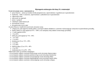 Wymagania edukacyjne dla klasy IV z matematyki Uczeń otrzymuje oceny z matematyki za: prace klasowe - pisane po każdym dziale programowym, zapowiedziane z tygodniowym wyprzedzeniem kartkówki – kilka w semestrze, zapowiedziane z jednodniowym wyprzedzeniem odpowiedzi ustne aktywność na zajęciach praca w grupach odrabianie zadań domowych prowadzenie zeszytu przygotowanie się do zajęć Za prace klasowe i kartkówki uczeń może otrzymać ocenę: celującą (6), jeśli napisał na bardzo dobry i rozwiązał zadanie dodatkowe z poziomu wykraczającego oznaczone na sprawdzianie gwiazdką, bardzo dobrą (5), jeśli napisał na 87% - 100% ( nie sumujemy tutaj zadania oznaczonego gwiazdką) -5, jeśli napisał na 86% +4 za 85% dobrą (4), jeśli napisał na 71% - 84% - 4 za 70% +3 za 69% dostateczny (3) za 51% - 69% -3 za 50% +2 za 49% dopuszczający (2) za 31% - 48% -2 za 30% niedostateczny (1) za 0% - 29%. Odpowiedzi ustne są ocenianie następująco: - za rozwiązanie zadania z poziomu koniecznego uczeń otrzymuje dopuszczający - za rozwiązanie zadania z poziomu podstawowego uczeń otrzymuje dostateczny - za rozwiązanie zadania z poziomu rozszerzającego uczeń otrzymuje dobry - za rozwiązanie zadania z poziomu dopełniającego uczeń otrzymuje bardzo dobry - za rozwiązanie zadania z poziomu wykraczającego uczeń otrzymuje celujący. Krótkie odpowiedzi ustne, aktywność na lekcjach i przygotowanie do lekcji są oceniane plusem (+) lub minusem (-). Za cztery kolejne takie odpowiedzi uczeń otrzymuje ocenę: bardzo dobrą za ++++ dobrą za 3 plusy i 1 minus dostateczną za 2 plusy i 2 minusy dopuszczającą za 1 plus i 3 minusy niedostateczną za 4 minusy. Prowadzenie zeszytu sprawdzane raz w semestrze. Po sprawdzeniu uczeń otrzymuje ocenę w skali 1-5. Oceniane jest: kompletność notatek staranność zapisów i czytelność zapisów uzupełnione braki powstałe w trakcie nieobecności. Krótkie zadania domowe oceniane są za pomocą plusów lub minusów dłuższe oceną w skali 1-5. Jeśli uczeń zrobi zadanie dodatkowe z poziomu wykraczającego może za zadanie domowe otrzymać ocenę celującą. Trzy braki zadań skutkują cząstkową oceną niedostateczną. Ocenę niedostateczną Otrzymuje uczeń, który nie spełnia wymagań na dopuszczający Ocenę dopuszczającą Otrzymuje uczeń, który nie zawsze odrabia zadania domowe, prowadzi niestarannie zeszyt, ma nie uzupełnione wszystkie braki, jest mało aktywny na zajęciach, jest nie zawsze przygotowany do lekcji ale spełnia wymagania edukacyjne na poziomie koniecznym Ocenę dostateczną Otrzymuje uczeń któremu zdarza się nie odrobić pracy domowej, prowadzi zeszyt w miarę starannie, stara się uzupełniać na bieżąco braki, stara się być aktywny na zajęciach i spełnia wymagania edukacyjne na ocenę dostateczną Ocenę dobrą Otrzymuje uczeń, który prowadzi starannie zeszyt, jest przygotowany do zajęć, Wykonuje na bieżąco prace domowe jest aktywny na zajęciach oraz spełnia poziom wymagań na ocenę dobrą Ocenę bardzo dobrą Otrzymuje uczeń, który ma odrobione wszystkie prace domowe prowadzi bardzo starannie zeszyt, ma uzupełnione wszystkie braki, jest aktywny na zajęciach oraz spełnia wymagania edukacyjne na poziomie bardzo dobrym Ocenę celującą Otrzymuje uczeń, który spełnia wymagania na ocenę celującą i bierze udział w konkursach matematycznych DZIAŁ PROGRAMO WY LICZBY I DZIAŁANIA Poziomy wymagań edukacyjnych Poziom konieczny ( K ) Ocena dopuszczająca Poziom podstawowy ( P ) Ocena dostateczna Poziom rozszerzający ( R ) Ocena dobra Poziom dopełniający (D) i wykraczający (W) Ocena bardzo dobra i celująca Uczeń Uczeń Uczeń Uczeń Rachunki pamięciowe – dodawanie i odejmowanie. • zna pojęcie składnika, sumy, odjemnej, odjemnika i różnicy (K) • zna rolę liczby 0 w dodawaniu i odejmowaniu(K) • umie pamięciowo dodawać i odejmować liczby w zakresie 200 bez przekraczania progu dziesiątkowego i z jego przekraczaniem (K) • umie dopełniać składniki do określonej wartości (P) • umie obliczać odjemną (lub odjemnik) mając daną różnicę i odjemnik (lub odjemną) ,sprawdzać poprawność wykonania działania (P) O ile więcej o ile mniej • powiększa lub pomniejsza liczby o daną liczbę naturalną (K) - oblicza, o ile większa (mniejsza) jest jedna liczba od drugiej(K) • rozwiązuje zadania tekstowe: – wielodziałaniowe (R) • rozwiązuje nietypowe zadania tekstowe wielodziałaniowe (W) • rozwiązuje zadania tekstowe: – wielodziałaniowe (D) Rachunki pamięciowe – mnożenie i dzielenie • zna pojęcie czynnika, iloczynu , dzielnej, dzielnika i ilorazu (K) •rozumie niewykonalność dzielenia przez 0 i prawo przemienności mnożenia (K) • zna rolę liczb 0 i 1 w mnożeniu i dzieleniu (K) • umie tabliczkę mnożenia (K) • pamięciowo dzieli liczby dwucyfrowe przez jednocyfrowe w zakresie tabliczki mnożenia (K) • mnoży liczby przez 0 (K) • posługuje się liczbą 1 w mnożeniu i dzieleniu - umie pamięciowo mnożyć liczby jednocyfrowe przez dwucyfrowe w zakresie 100 (K) • rozumie porównywanie różnicowe (P) • powiększać lub pomniejszać liczby o daną liczbę naturalną (P) • rozwiązuje zadania tekstowe: – jednodziałaniowe (P) oblicza liczbę wiedząc, o ile jest większa (mniejsza) od danej (P) • oblicza jeden z czynników, mając dane iloczyn i drugi czynnik (P) • sprawdza poprawność wykonanych działań (P) • rozwiązuje zadania tekstowe: – jednodziałaniowe (P) - pamięciowo mnoży liczby przez pełne dziesiątki(P) • rozwiązuje zadania tekstowe: – wielodziałaniowe (R) - pamięciowo mnoży liczby przez pełne setki (R) • oblicza dzielną (lub dzielnik), mając dane iloraz i dzielnik (lub dzielną) (R) • umie rozwiązywać nietypowe zadania tekstowe wielodziałaniowe (W) • dostrzega zasady zapisu ciągu liczb naturalnych (D-W) • rozwiązuje zadania tekstowe: – wielodziałaniowe (D) - umie pa