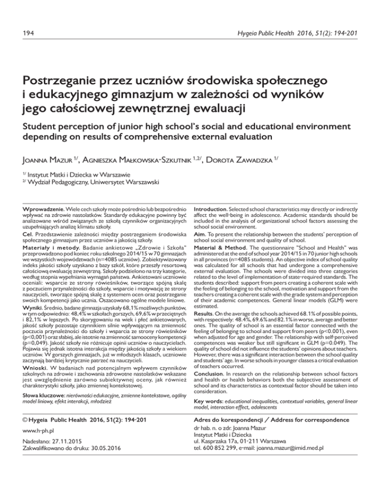 194 Hygeia Public Health 2016, 51(2): 194-201 Postrzeganie przez uczniów środowiska społecznego i edukacyjnego gimnazjum w zależności od wyników jego całościowej zewnętrznej ewaluacji Student perception of junior high school’s social and educational environment depending on results of comprehensive external evaluation Joanna Mazur 1/, Agnieszka Małkowska-Szkutnik 1,2/, Dorota Zawadzka 1/ 1/ 2/ Instytut Matki i Dziecka w Warszawie Wydział Pedagogiczny, Uniwersytet Warszawski Wprowadzenie. Wiele cech szkoły może pośrednio lub bezpośrednio wpływać na zdrowie nastolatków. Standardy edukacyjne powinny być analizowane wśród związanych ze szkołą czynników organizacyjnych uzupełniających analizę klimatu szkoły. Cel. Przedstawienie zależności między postrzeganiem środowiska społecznego gimnazjum przez uczniów a jakością szkoły. Materiały i metody. Badanie ankietowe „Zdrowie i Szkoła” przeprowadzono pod koniec roku szkolnego 2014/15 w 70 gimnazjach we wszystkich województwach (n=4085 uczniów). Zobiektywizowany indeks jakości szkoły uzyskano z bazy szkół, które przeszły resortową całościową ewaluację zewnętrzną. Szkoły podzielono na trzy kategorie, według stopnia wypełniania wymagań państwa. Ankietowani uczniowie oceniali: wsparcie ze strony rówieśników, tworzące spójną skalę z poczuciem przynależności do szkoły, wsparcie i motywację ze strony nauczycieli, tworzące spójną skalę z systemem ocen oraz postrzeganie swoich kompetencji jako ucznia. Oszacowano ogólne modele liniowe. Wyniki. Średnio, badane gimnazja uzyskały 68,1% możliwych punktów, w tym odpowiednio: 48,4% w szkołach gorszych, 69,6% w przeciętnych i 82,1% w lepszych. Po skorygowaniu na wiek i płeć ankietowanych, jakość szkoły pozostaje czynnikiem silnie wpływającym na zmienność poczucia przynależności do szkoły i wsparcia ze strony rówieśników (p<0,001) oraz słabiej, ale istotnie na zmienność samooceny kompetencji (p=0,049). Jakość szkoły nie różnicuje opinii uczniów o nauczycielach. Pojawia się jednak istotna interakcja między jakością szkoły a wiekiem uczniów. W gorszych gimnazjach, już w młodszych klasach, uczniowie zaczynają bardziej krytycznie patrzeć na nauczycieli. Wnioski. W badaniach nad potencjalnym wpływem czynników szkolnych na zdrowie i zachowania zdrowotne nastolatków wskazane jest uwzględnienie zarówno subiektywnej oceny, jak również charakterystyki szkoły, jako zmiennej kontekstowej. Słowa kluczowe: nierówności edukacyjne, zmienne kontekstowe, ogólny model liniowy, efekt interakcji, młodzież Introduction. Selected school characteristics may directly or indirectly affect the well-being in adolescence. Academic standards should be included in the analysis of organizational school factors assessing the school social environment. Aim. To present the relationship between the students’ perception of school social environment and quality of school. Material & Method. The questionnaire ”School and Health” was administered at the end of school year 2014/15 in 70 junior high schools in all provinces (n=4085 students). An objective index of school quality was calculated for all schools that had undergone a comprehensive external evaluation. The schools were divided into three categories related to the level of implementation of state-required standards. The students described: support from peers creating a coherent scale with the feeling of belonging to the school, motivation and support from the teachers creating a coherent scale with the grade system and perception of their academic competences. General linear models (GLM) were estimated. Results. On the average the schools achieved 68.1% of possible points, with respectively: 48.4%, 69.6% and 82.1% in worse, average and better ones. The quality of school is an essential factor connected with the feeling of belonging to school and support from peers (p<0.001), even when adjusted for age and gender. The relationship with self-perceived competences was weaker but still significant in GLM (p=0.049). The quality of school did not influence the students’ opinions about teachers. However, there was a significant interaction between the school quality and students’ age. In worse schools in younger classes a critical evaluation of teachers occurred. Conclusion. In research on the relationship between school factors and health or health behaviors both the subjective assessment of school and its characteristics as contextual factor should be taken into consideration. Key words: educational inequalities, contextual variables, general linear model, interaction effect, adolescents © Hygeia Public Health 2016, 51(2): 194-201 Adres do korespondencji / Address for correspondence www.h-ph.pl dr hab. n. o zdr. Joanna Mazur Instytut Matki i Dziecka ul. Kasprzaka 17a, 01-211 Warszawa tel. 600 852 299, e-mail: [email protected] Nadesłano: 27.11.2015 Zakwalifikowano do druku: 30.05.2016 Mazur J i wsp. Postrzeganie przez uczniów środowiska społecznego i edukacyjnego gimnazjum w zależności ... Wprowadzenie Rozważania teoretyczne i wyniki badań empirycznych wskazują, że czynne uczestniczenie w życiu szkoły chroni uczniów przed zachowaniami niezgodnymi z normami społecznymi, a dobra szkoła może być miejscem, gdzie te normy są przekazywane [1]. Z kolei doświadczanie powtarzających się niepowodzeń w nauce oraz braku przynależności do szkoły sprawia, że młodzież łatwiej ulega negatywnym wpływom rówieśników i angażuje się w różnorodne zachowania problemowe, jak wagary, bójki, dręczenie innych (bullying) lub używanie narkotyków [2-4]. W wielu pracach wykazano istotny związek między klimatem i kulturą szkoły a skłonnością młodzieży do podejmowania zachowań ryzykownych, jak również wpływ czynników szkolnych na stan zdrowia psychicznego uczniów [5-7]. Mniej uwagi poświęca się aspektom organizacyjnym funkcjonowani
