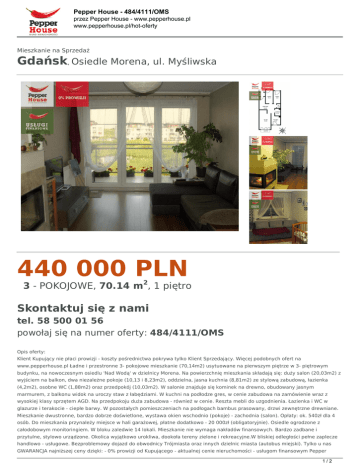 Pepper House - 484/4111/OMS przez Pepper House - www.pepperhouse.pl www.pepperhouse.pl/hot-oferty Mieszkanie na Sprzedaż Gdańsk, Osiedle Morena, ul. Myśliwska 440 000 PLN 3 - POKOJOWE, 70.14 m2, 1 piętro Skontaktuj się z nami tel. 58 500 01 56 powołaj się na numer oferty: 484/4111/OMS Opis oferty: Klient Kupujący nie płaci prowizji - koszty pośrednictwa pokrywa tylko Klient Sprzedający. Więcej podobnych ofert na www.pepperhouse.pl Ładne i przestronne 3- pokojowe mieszkanie (70,14m2) usytuowane na pierwszym piętrze w 3- piętrowym budynku, na nowoczesnym osiedlu 'Nad Wodą' w dzielnicy Morena. Na powierzchnię mieszkania składają się: duży salon (20,03m2) z wyjściem na balkon, dwa niezależne pokoje (10,13 i 8,23m2), oddzielna, jasna kuchnia (8,81m2) ze stylową zabudową, łazienka (4,2m2), osobne WC (1,88m2) oraz przedpokój (10,03m2). W salonie znajduje się kominek na drewno, obudowany jasnym marmurem, z balkonu widok na uroczy staw z łabędziami. W kuchni na podłodze gres, w cenie zabudowa na zamówienie wraz z wysokiej klasy sprzętem AGD. Na przedpokoju duża zabudowa - również w cenie. Reszta mebli do uzgodnienia. Łazienka i WC w glazurze i terakocie - ciepłe barwy. W pozostałych pomieszczeniach na podłogach bambus prasowany, drzwi zewnętrzne drewniane. Mieszkanie dwustronne, bardzo dobrze doświetlone, wystawa okien wschodnio (pokoje) - zachodnia (salon). Opłaty: ok. 540zł dla 4 osób. Do mieszkania przynależy miejsce w hali garażowej, płatne dodatkowo - 20 000zł (obligatoryjnie). Osiedle ogrodzone z całodobowym monitoringiem. W bloku zaledwie 14 lokali. Mieszkanie nie wymaga nakładów finansowych. Bardzo zadbane i przytulne, stylowo urządzone. Okolica wyjątkowo urokliwa, dookoła tereny zielone i rekreacyjne.W bliskiej odległości pełne zaplecze handlowo - usługowe. Bezproblemowy dojazd do obwodnicy Trójmiasta oraz innych dzielnic miasta (autobus miejski). Tylko u nas GWARANCJA najniższej ceny dzięki: - 0% prowizji od Kupującego - aktualnej cenie nieruchomości - usługom finansowym Pepper 1/2 Pepper House - 484/4111/OMS przez Pepper House - www.pepperhouse.pl www.pepperhouse.pl/hot-oferty House - preferencyjnej stawce u Notariusza Tylko u nas GWARANCJA bezpieczeństwa dzięki: - obsłudze prawnej Kancelarii Koprowski Gąsior Gierzyńska Ludwichowska - nadzorowi licencjonowanego Pośrednika (nr licencji 6884) - polisie OC w PZU SA - ubezpieczeniu kupowanej nieruchomości (szczegóły na naszej stronie). Więcej zdjęć, rzuty, filmy i dodatkowe informacje: www.pepperhouse.pl Wyślij zapytanie bezpośrednio z naszej strony. 2/2 Powered by TCPDF (www.tcpdf.org)