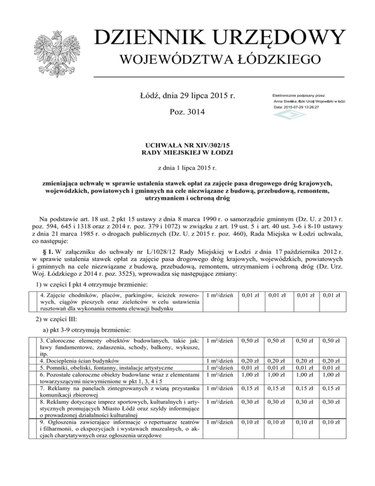 DZIENNIK URZĘDOWY WOJEWÓDZTWA ŁÓDZKIEGO Łódź, dnia 29 lipca 2015 r. Elektronicznie podpisany przez: Anna Siwińska; Łódzki Urząd Wojewódzki w Łodzi Data: 2015-07-29 13:26:27 Poz. 3014 UCHWAŁA NR XIV/302/15 RADY MIEJSKIEJ W ŁODZI z dnia 1 lipca 2015 r. zmieniająca uchwałę w sprawie ustalenia stawek opłat za zajęcie pasa drogowego dróg krajowych, wojewódzkich, powiatowych i gminnych na cele niezwiązane z budową, przebudową, remontem, utrzymaniem i ochroną dróg Na podstawie art. 18 ust. 2 pkt 15 ustawy z dnia 8 marca 1990 r. o samorządzie gminnym (Dz. U. z 2013 r. poz. 594, 645 i 1318 oraz z 2014 r. poz. 379 i 1072) w związku z art. 19 ust. 5 i art. 40 ust. 3-6 i 8-10 ustawy z dnia 21 marca 1985 r. o drogach publicznych (Dz. U. z 2015 r. poz. 460), Rada Miejska w Łodzi uchwala, co następuje: § 1. W załączniku do uchwały nr L/1028/12 Rady Miejskiej w Łodzi z dnia 17 października 2012 r. w sprawie ustalenia stawek opłat za zajęcie pasa drogowego dróg krajowych, wojewódzkich, powiatowych i gminnych na cele niezwiązane z budową, przebudową, remontem, utrzymaniem i ochroną dróg (Dz. Urz. Woj. Łódzkiego z 2014 r. poz. 3525), wprowadza się następujące zmiany: 1) w części I pkt 4 otrzymuje brzmienie: 4. Zajęcie chodników, placów, parkingów, ścieżek rowerowych, ciągów pieszych oraz zieleńców w celu ustawienia rusztowań dla wykonania remontu elewacji budynku 1 m²/dzień 0,01 zł 0,01 zł 0,01 zł 0,01 zł 1 m²/dzień 0,50 zł 0,50 zł 0,50 zł 0,50 zł 1 m²/dzień 1 m²/dzień 1 m²/dzień 0,20 zł 0,01 zł 1,00 zł 0,20 zł 0,01 zł 1,00 zł 0,20 zł 0,01 zł 1,00 zł 0,20 zł 0,01 zł 1,00 zł 1 m²/dzień 0,15 zł 0,15 zł 0,15 zł 0,15 zł 1 m²/dzień 0,30 zł 0,30 zł 0,30 zł 0,30 zł 1 m²/dzień 0,10 zł 0,10 zł 0,10 zł 0,10 zł 2) w części III: a) pkt 3-9 otrzymują brzmienie: 3. Całoroczne elementy obiektów budowlanych, takie jak: ławy fundamentowe, zadaszenia, schody, balkony, wykusze, itp. 4. Docieplenia ścian budynków 5. Pomniki, obeliski, fontanny, instalacje artystyczne 6. Pozostałe całoroczne obiekty budowlane wraz z elementami towarzyszącymi niewymienione w pkt 1, 3, 4 i 5 7. Reklamy na panelach zintegrowanych z wiatą przystanku komunikacji zbiorowej 8. Reklamy dotyczące imprez sportowych, kulturalnych i artystycznych promujących Miasto Łódź oraz szyldy informujące o prowadzonej działalności kulturalnej 9. Ogłoszenia zawierające informacje o repertuarze teatrów i filharmonii, o ekspozycjach i wystawach muzealnych, o akcjach charytatywnych oraz ogłoszenia urzędowe Dziennik Urzędowy Województwa Łódzkiego –2– Poz. 3014 b) po pkt 9 dodaje się pkt 10-12 w brzmieniu: 10. Reklamy umieszczone na elementach wygrodzenia międzytorza w wyznaczonych lokalizacjach 11. Informacje o Mieście Łodzi w szczególności w postaci planów, map, tablic i plansz (np. witacze) 12. Reklamy poza reklamami wymienionymi w pkt 7-11 1 m²/dzień 0,30 zł 0,30 zł 0,30 zł 0,30 zł 1 m²/dzień 0,01 zł 0,01 zł 0,01 zł 0,01 zł 1 m²/dzień 4,00 zł 4,00 zł 3,00 zł 2,00 zł 1 m²/dzień 1 m²/dzień 1 m²/dzień 1 m²/dzień 1 m²/dzień 1 m²/dzień 1,00 zł 1,00 zł 3,00 zł 0,30 zł 0,10 zł 1,00 zł 1,00 zł 1,00 zł 3,00 zł 0,30 zł 0,10 zł 1,00 zł 1,00 zł 1,00 zł 3,00 zł 0,30 zł 0,10 zł 1,00 zł 1,00 zł 1,00 zł 3,00 zł 0,30 zł 0,10 zł 1,00 zł 1 m²/dzień 6,00 zł 6,00 zł 6,00 zł 6,00 zł 1 m²/dzień 1 m²/dzień 2,00 zł 3,00 zł 2,00 zł 3,00 zł 2,00 zł 3,00 zł 2,00 zł 3,00 zł 3) w części IV: a) pkt 4-10 otrzymują brzmienie: 4. Parking okazjonalny poza strefą płatnego parkowania 5. Zastrzeżone miejsca postojowe tzw. „koperty” 6. Kontenery na odpady budowlane 7. Realizacja planu zdjęciowego 8. Prowadzenie charytatywnych akcji społecznych 9. Stałe stoiska handlowe przed obiektami handlowymi oraz przy cmentarzach (za stałe stoisko uznaje się takie, które funkcjonuje co najmniej przez 60 kolejnych dni kalendarzowych) 10. Okazjonalne stoiska handlowe b) po pkt 10 dodaje się pkt 11 i 12 w brzmieniu: 11. Sezonowe ogródki gastronomiczne 12. Pozostałe zajęcia na prawach wyłączności dla celów innych niż wymienione w pkt 1-11 § 2. Wykonanie uchwały powierza się Prezydentowi Miasta Łodzi. § 3. Uchwała wchodzi w życie po upływie 14 dni od dnia ogłoszenia w Dzienniku Urzędowym Województwa Łódzkiego. Przewodniczący Rady Miejskiej w Łodzi Tomasz Kacprzak