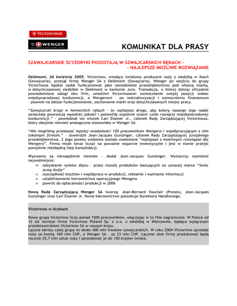 KOMUNIKAT DLA PRASY SZAWAJCARSKIE SCYZORYKI POZOSTAJĄ W SZWAJCARSKICH RĘKACH – – NAJLEPSZE MOŻLIWE ROZWIĄZANIE Delémont, 26 kwietnia 2005. Victorinox, wiodący światowy producent noży z siedzibą w Ibach (Szwajcaria), przejął firmę Wenger SA z Delémont (Szwajcaria). Wenger po wejściu do grupy Victorinoxa będzie nadal funkcjonował jako samodzielne przedsiębiorstwo pod własną marką, w dotychczasowej siedzibie w Delémont w kantonie Jura. Transakcja, o której dzisiaj oficjalnie powiadomiono załogi obu firm, umożliwi Victorinoxowi wzmocnienie swojej pozycji wobec międzynarodowej konkurencji, a Wengerowi – po restrukturyzacji i wzmocnieniu finansowym – pozwoli na dalsze funkcjonowanie, zachowanie marki oraz dotychczasowych miejsc pracy. “Szwajcarski krzyż w helweckich rękach – to najlepsza droga, aby kolory naszego logo nadal oznaczały gwarancję wysokiej jakości i pozwoliły wspólnie stawić czoła rosnącej międzynarodowej konkurencji.” - powiedział we wtorek Carl Elsener Jr., członek Rady Zarządzającej Victorinoxa, który obejmie również analogiczne stanowisko w Wenger SA. “Nie mogliśmy przekazać lepszej wiadomości 150 pracownikom Wengera i współpracującym z nim lokalnym firmom.” - stwierdził Jean-Jacques Gunzinger, członek Rady Zarządzającej jurajskiego przedsiębiorstwa. Z jego punktu widzenia zostało znalezione “najlepsze z możliwych rozwiązań dla Wengera”. Firma może teraz liczyć na poważne wsparcie inwestycyjne i jest w stanie przejść pomyślnie niezbędną fazę konsolidacji. Wyzwania są niewątpliwie niemałe – dodał Jean-Jacques Gunzinger. Wystarczy wymienić najważniejsze: • odzyskanie rynków zbytu – przez rozwój produktów bazujących na uznanej marce “Swiss Army Knife” • oszczędność kosztów i współpraca w produkcji, reklamie i wymianie informacji • ustabilizowanie kierownictwa operacyjnego Wengera • powrót do opłacalności produkcji w 2006 Nową Radę Zarządzającą Wenger SA tworzą: Jean-Bernard Vauclair (Prezes), Jean-Jacques Gunzinger oraz Carl Elsener Jr. Nowe kierownictwo poszukuje Dyrektora Handlowego. Victorinox w liczbach Nowa grupa Victorinox liczy ponad 1500 pracowników, włączając w to filie zagraniczne. W Polsce od 12 lat istnieje firma Victorinox Poland Sp. z o.o. z siedzibą w Warszawie, będąca wyłącznym przedstawicielem Victorinox SA w naszym kraju. Łączne obroty całej grupy to około 400 mln franków szwajcarskich. W roku 2004 Victorinox sprzedał noży za kwotę 169 mln CHF, a Wenger SA – za 23 mln CHF. Łącznie obie firmy produkować będą rocznie 25,7 mln sztuk noży i sprzedawać je do 150 krajów świata.