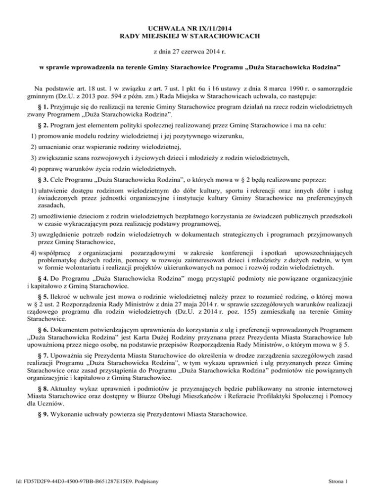 UCHWAŁA NR IX/11/2014 RADY MIEJSKIEJ W STARACHOWICACH z dnia 27 czerwca 2014 r. w sprawie wprowadzenia na terenie Gminy Starachowice Programu „Duża Starachowicka Rodzina” Na podstawie art. 18 ust. 1 w związku z art. 7 ust. 1 pkt 6a i 16 ustawy z dnia 8 marca 1990 r. o samorządzie gminnym (Dz.U. z 2013 poz. 594 z późn. zm.) Rada Miejska w Starachowicach uchwala, co następuje: § 1. Przyjmuje się do realizacji na terenie Gminy Starachowice program działań na rzecz rodzin wielodzietnych zwany Programem „Duża Starachowicka Rodzina”. § 2. Program jest elementem polityki społecznej realizowanej przez Gminę Starachowice i ma na celu: 1) promowanie modelu rodziny wielodzietnej i jej pozytywnego wizerunku, 2) umacnianie oraz wspieranie rodziny wielodzietnej, 3) zwiększanie szans rozwojowych i życiowych dzieci i młodzieży z rodzin wielodzietnych, 4) poprawę warunków życia rodzin wielodzietnych. § 3. Cele Programu „Duża Starachowicka Rodzina”, o których mowa w § 2 będą realizowane poprzez: 1) ułatwienie dostępu rodzinom wielodzietnym do dóbr kultury, sportu i rekreacji oraz innych dóbr i usług świadczonych przez jednostki organizacyjne i instytucje kultury Gminy Starachowice na preferencyjnych zasadach, 2) umożliwienie dzieciom z rodzin wielodzietnych bezpłatnego korzystania ze świadczeń publicznych przedszkoli w czasie wykraczającym poza realizację podstawy programowej, 3) uwzględnienie potrzeb rodzin wielodzietnych w dokumentach strategicznych i programach przyjmowanych przez Gminę Starachowice, 4) współpracę z organizacjami pozarządowymi w zakresie konferencji i spotkań upowszechniających problematykę dużych rodzin, pomocy w rozwoju zainteresowań dzieci i młodzieży z dużych rodzin, w tym w formie wolontariatu i realizacji projektów ukierunkowanych na pomoc i rozwój rodzin wielodzietnych. § 4. Do Programu „Duża Starachowicka Rodzina” mogą przystąpić podmioty nie powiązane organizacyjnie i kapitałowo z Gminą Starachowice. § 5. Ilekroć w uchwale jest mowa o rodzinie wielodzietnej należy przez to rozumieć rodzinę, o której mowa w § 2 ust. 2 Rozporządzenia Rady Ministrów z dnia 27 maja 2014 r. w sprawie szczegółowych warunków realizacji rządowego programu dla rodzin wielodzietnych (Dz.U. z 2014 r. poz. 155) zamieszkałą na terenie Gminy Starachowice. § 6. Dokumentem potwierdzającym uprawnienia do korzystania z ulg i preferencji wprowadzonych Programem „Duża Starachowicka Rodzina” jest Karta Dużej Rodziny przyznana przez Prezydenta Miasta Starachowice lub upoważnioną przez niego osobę, na podstawie przepisów Rozporządzenia Rady Ministrów, o którym mowa w § 5. § 7. Upoważnia się Prezydenta Miasta Starachowice do określenia w drodze zarządzenia szczegółowych zasad realizacji Programu „Duża Starachowicka Rodzina”, w tym wykazu uprawnień i ulg przyznanych przez Gminę Starachowice oraz zasad przystąpienia do Programu „Duża Starachowicka Rodzina” podmiotów nie powiązanych organizacyjnie i kapitałowo z Gminą Starachowice. § 8. Aktualny wykaz uprawnień i podmiotów je przyznających będzie publikowany na stronie internetowej Miasta Starachowice oraz dostępny w Biurze Obsługi Mieszkańców i Referacie Profilaktyki Społecznej i Pomocy dla Uczniów. § 9. Wykonanie uchwały powierza się Prezydentowi Miasta Starachowice. Id: FD57D2F9-44D3-4500-97BB-B651287E15E9. Podpisany Strona 1 § 10. Uchwała wchodzi w życie z dniem podjęcia. Przewodnicząca Rady Miejskiej w Starachowicach Lidia Dziura Id: FD57D2F9-44D3-4500-97BB-B651287E15E9. Podpisany Strona 2 Uzasadnienie Niniejsza uchwała stanowi realizację zapisów Uchwały Rady Miejskiej w Starachowicach nr VII/5/2014 z dnia 30 maja 2014 r. zobowiązujących Prezydenta Miasta Starachowice do opracowania Programu „Duża Starachowicka Rodzina”. Program ten jest jednym z elementów polityki społecznej miasta. Ma on na celu wzmacnianie dużej rodziny, wspieranie jej członków w realizacji zdolności, umiejętności i zainteresowań, a także tworzenie klimatu sprzyjającemu wychowywaniu dzieci i doceniania trudu podejmowanego przez rodziców. W programie uczestniczyć mogą duże rodziny zamieszkałe na terenie Starachowic bez względu na ich status społeczny. Na terenie Miasta funkcjonuje 276 rodzin z co najmniej trójką dzieci. Uczestnictwo w programie umożliwi im korzystanie z wielu ulg i zniżek oferowanych przez samorząd oraz partnerów prywatnych, których gmina będzie zachęcać do przystąpienia do programu. W zależności od ponoszonych kosztów i uwzględniając potrzeby dużych rodzin, katalog oferowanych ulg i ich wysokość może ulegać zmianie. Wykorzystanie Karty Dużej Rodziny wydawanej na podstawie rządowego programu dla rodzin wielodzietnych, jako dokumentu potwierdzającego uprawnienia wynikające z Programu „Duża Starachowicka Rodzina” pozwoli na szybsze wdrożenie programu oraz będzie ułatwieniem dla osób w nim uczestniczących. Program będzie koordynowany przez Wydział Edukacji i Spraw Społecznych Urzędu Miejskiego w Starachowicach. Id: FD57D2F9-44D3-4500-97BB-B651287E15E9. Podpisany Strona 1