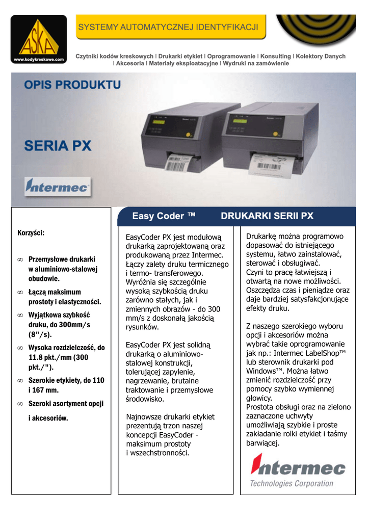 ● Korzyści: • Przemysłowe drukarki w aluminiowo-stalowej obudowie. • Łączą maksimum prostoty i elastyczności. • Wyjątkowa szybkość druku, do 300mm/s (8"/s). • Wysoka rozdzielczość, do 11.8 pkt./mm (300 pkt./"). • Szerokie etykiety, do 110 i 167 mm. • Szeroki asortyment opcji i akcesoriów. EasyCoder PX jest modułową drukarką zaprojektowaną oraz produkowaną przez Intermec. Łączy zalety druku termicznego i termo- transferowego. Wyróżnia się szczególnie wysoką szybkością druku zarówno stałych, jak i zmiennych obrazów - do 300 mm/s z doskonałą jakością rysunków. EasyCoder PX jest solidną drukarką o aluminiowostalowej konstrukcji, tolerującej zapylenie, nagrzewanie, brutalne traktowanie i przemysłowe środowisko. Najnowsze drukarki etykiet prezentują trzon naszej koncepcji EasyCoder maksimum prostoty i wszechstronności. Drukarkę można programowo dopasować do istniejącego systemu, łatwo zainstalować, sterować i obsługiwać. Czyni to pracę łatwiejszą i otwartą na nowe możliwości. Oszczędza czas i pieniądze oraz daje bardziej satysfakcjonujące efekty druku. Z naszego szerokiego wyboru opcji i akcesoriów można wybrać takie oprogramowanie jak np.: Intermec LabelShop™ lub sterownik drukarki pod Windows™. Można łatwo zmienić rozdzielczość przy pomocy szybko wymiennej głowicy. Prostota obsługi oraz na zielono zaznaczone uchwyty umożliwiają szybkie i proste zakładanie rolki etykiet i taśmy barwiącej. PARAMETRY TECHNICZNE EasyCoder ™ _____________________ Ogólnie Termiczna i Termo-transferowa drukarka do etykiet samoprzylepnych, biletów i przywieszek. W opcji dostępne odklejanie etykiet, zwijanie podkładu i taśmy barwiącej. _____________________ Modele EasyCoder ™ PX4i EasyCoder ™ PX5i _________________________ Charakterystyka fizyczna PX4i Długość: 482 mm Szerokość: 275 mm Wysokość: 238 mm Waga: 12,85 kg PX5i Długość: 482 mm Szerokość: 335 mm Wysokość: 238 mm Waga: 14,8 kg _________________________ Cechy drukowania Szerokość druku: PX4i - 110 mm, PX6i – 167,4 mm Długość druku: 4095 mm przy 203 DPI 2775 mm przy 300DPI Szybkość druku: PX4i – 100 - 300 mm/sek. PX6i – 100 – 225 mm/sek. Kierunki druku Pisany tekst, kody kreskowe i graficzne obrazy w czterech kierunkach. Rozdzielczość druku: 8 pkt./mm (203.2 pkt./"), lub 11.81 pkt./mm (300 pkt./"). Łatwo zamienna dzięki szybko wymiennej głowicy drukującej. _________________________ Materiały eksploatacyjne Wymiary etykiet – Szerokość maksymalna: PX4i – 120 mm, PX6i – 170 mm Szerokość minimalna: PX4i – 50,8 mm, PX6i – 76,2 mm Długość maksymalna: nielimitowana Rolka etykiet: średnica max. 213 mm Średnica rdzenia: 38-76 mm Rolka taśmy TT: Długość max. 600 m Średnica rdzenia: 25 mm PX4i, PX6i ____________________________ Programowanie Język sterujący: Fingerprint/Direct Protocol, IPL. Edytor etykiet pod Windows ™ : LabelShop ™ . Sterownik drukarki pod Windows™. Opcje: ERPLabel do pracy z SAP R/3, Serwer aplikacji, Generator aplikacji ____________________________ Znaki Pod Fingerprint - 15 skalowalnych fontów, a w tym 1 OCR-A, 1 OCR-B, 12 Unicode. Pod IPL – 13 skalowalnych fontów + 20 bitmapowych. Łatwe drukowanie obrazów graficznych (format PCX) i symboliki. ____________________________ Kody kreskowe Dostępne wszystkie typy kodów użytkowych. ____________________________ Temperatura pracy +5°C do +40°C (+40°F do 104°F). ____________________________ Wilgotność 10-90% bez kondensacji (dotyczy także materiału etykiet). ____________________________ Zasilanie Przełączane miedzy 115 lub 230 V AC przy 90-265 VAC, 45 lub 65 Hz. ____________________________ Protokoły XON/XOFF, ENQ/ACK, DTR,RTS/CTS. ____________________________ Pamięć Standard: 4 MB Flash, 8MB SDRAM Opcje: do 16 MB Flash, do 16MB SDRAM ____________________________ Interfejs Standard: RS 232C, USB, EasyLAN 10/100BaseT Ethernet, Czytnika piórowego Szybkość transmisji 300-115,2kB/sek. Opcje: RS422/485, RS 232C, 20 mA CL, Centronics, Wej./wej. przemysłowe/przekaz., bezprzewodowy EasyLAN 802.11b/g ____________________________ Klawiatura Model rozbudowany: Membranowa (0-9) i 12 innych klawiszy funkcyjnych. Model samodzielny: Membranowa, pełna literowo-numeryczna klawiatura złożona z 54 klawiszy. ____________________________ Wyświetlacz LCD po 2 x 16 znaków, 3 LED'y wskazujące stany pracy drukarki. ____________________________ Spełniane wymagania CE (EN55022 Class B), FCC Class A,UL, CSA, VDE/GS, C-Tick. ____________________________ Opcje Czujnik pobrania etykiety, oszczędzacz taśmy TT, czujnik końca taśmy TT i etykiet, zwijak podkładu, przeźroczysty front, obcinacz, zegar czasu rzeczywistego, adapter kart pamięci PC, zewnętrzna klawiatura z RS 232C, odklejanie etykiet i zwijanie podkładu lub etykiet wewnątrz, TrueType ™ i Speedo ™ fonty skalowane, prowadnica składanego papieru. ASKA S.C. ul. Wędkarska 2A/B1 04-869 Warszawa tel. (22) 498 59 08 (22) 498 59 09 fax.(22) 617 70 20 www.kodykreskowe.com e-mail: [email protected]