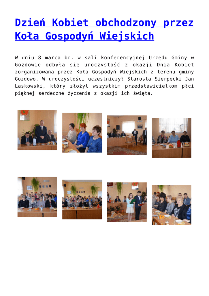 Dzień Kobiet obchodzony przez Koła Gospodyń Wiejskich W dniu 8 marca br. w sali konferencyjnej Urzędu Gminy w Gozdowie odbyła się uroczystość z okazji Dnia Kobiet zorganizowana przez Koła Gospodyń Wiejskich z terenu gminy Gozdowo. W uroczystości uczestniczył Starosta Sierpecki Jan Laskowski, który złożył wszystkim przedstawicielkom płci pięknej serdeczne życzenia z okazji ich święta. Dzień Kobiet w Gminie Gozdowo !