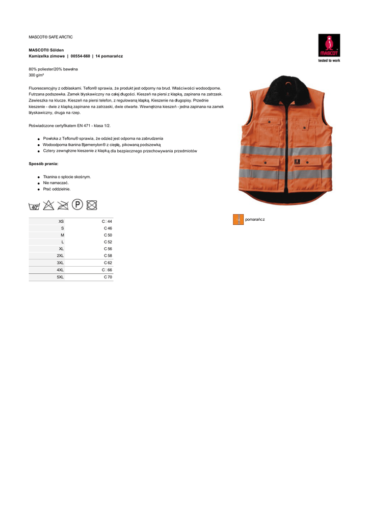 MASCOT® SAFE ARCTIC MASCOT® Sölden Kamizelka zimowe | 00554-660 | 14 pomarańcz 80% poliester/20% bawełna 300 g/m² Fluorescencyjny z odblaskami. Teflon® sprawia, że produkt jest odporny na brud. Właściwości wodoodporne. Futrzana podszewka. Zamek błyskawiczny na całej długości. Kieszeń na piersi z klapką, zapinana na zatrzask. Zawieszka na klucze. Kieszeń na piersi telefon, z regulowaną klapką. Kieszenie na długopisy. Przednie kieszenie - dwie z klapką zapinane na zatrzaski, dwie otwarte. Wewnętrzna kieszeń - jedna zapinana na zamek błyskawiczny, druga na rzep. Poświadczone certyfikatem EN 471 - klasa 1/2. l Powłoka z Teflonu® sprawia, że odzież jest odporna na zabrudzenia l Wodoodporna tkanina Bjørnenylon® z ciepłą, pikowaną podszewką l Cztery zewnętrzne kieszenie z klapką dla bezpiecznego przechowywania przedmiotów Sposób prania: l Tkanina o splocie skośnym. l Nie namaczać. l Prać oddzielnie. XS C44 S C 46 M C 50 L C 52 XL C 56 2XL C 58 3XL C 62 4XL C66 5XL C 70 pomarańcz