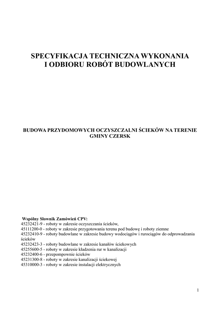 SPECYFIKACJA TECHNICZNA WYKONANIA I ODBIORU ROBÓT BUDOWLANYCH BUDOWA PRZYDOMOWYCH OCZYSZCZALNI ŚCIEKÓW NA TERENIE GMINY CZERSK Wspólny Słownik Zamówień CPV: 45232421-9 - roboty w zakresie oczyszczania ścieków, 45111200-0 - roboty w zakresie przygotowania terenu pod budowę i roboty ziemne 45232410-9 - roboty budowlane w zakresie budowy wodociągów i rurociągów do odprowadzania ścieków 45232423-3 - roboty budowlane w zakresie kanałów ściekowych 45255600-5 - roboty w zakresie kładzenia rur w kanalizacji 45232400-6 - przepompownie ścieków 45231300-8 - roboty w zakresie kanalizacji ściekowej 45310000-3 - roboty w zakresie instalacji elektrycznych 1 Spis treści: 1.Charakterystyka przedmiotu zamówienia: 1.1. Przedmiot opracowania specyfikacji technicznej 1.2. Cel opracowania specyfikacji technicznej 1.3. Zakres robót objętych specyfikacją 1.4 Ogólne wymagania dotyczące projektu i wykonywanych robót budowlanych 1.5. Wymagania techniczne 2. Materiały. 2.1. Rurociągi i armatura 2.2. Oczyszczalnie ścieków 2.3. Tunele filtracyjne 2.4. Materiały na podsypkę rurociągu 2.5. Materiały na obsypkę rurociągu 2.6. Beton 2.7. Materiały elektryczne 3. Sprzęt. 4.Transport i składowanie 4.1. Transport rur, kształtek, studzienek i kabli. 4.2. Transport mieszanki betonowej 4.3. Transport urządzeń technologicznych 4.4 Składowanie 5. Wykonanie robót 5.1.Roboty ziemne 5.2. Roboty montażowe 6. Kontrola jakości robót 7. Odbiór robót 8. Uwagi końcowe 2 1. CHARAKTERYSTYKA PRZEDMIOTU ZAMÓWIENIA Przedmiotem zamówienia jest dostawa i montaż przydomowych oczyszczalni ścieków pracujących w technologii SBR oraz rozprowadzeniem ścieków oczyszczonych poprzez drenaż wykonany z tuneli filtracyjnych lub studnie rozsączające. Wykonawca zobligowany jest do przeprowadzenia rozruchu technologicznego i wykonania badań jakości ścieków oczyszczonych. Zakres robót zawarty został w projekcie budowlanym i dołączony do dokumentacji w przedmiarach. 1.1. Przedmiot opracowania specyfikacji technicznej Przedmiotem niniejszej specyfikacji technicznej jest określenie wymagań dotyczących wykonania i odbioru robót związanych z budową przydomowych oczyszczalni ścieków na terenie gminy Czersk zgodnie z dokumentacją projektową. 1.2. Cel opracowania specyfikacji technicznej Specyfikacja techniczna jest integralną częścią dokumentacji przetargowej i w sposób ścisły określa potencjalnemu Wykonawcy przygotowanie się do złożenia oferty, zastosowania materiałów i urządzeń i jakości wykonania robót. 1.3. Zakres robót objętych specyfikacją Niniejsza dokumentacja techniczna obejmuje całość robót niezbędnych do wykonania zadnia budowlanego stanowiącego przedmiot zamówienia. Zakres robót: a) przejęcie i przygotowanie placu budowy, b) wytyczenie geodezyjne planowanej budowy, c) dostawa i montaż przydomowej oczyszczalni ścieków, d) wykonanie przyłącza kanalizacyjnego, e) roboty ziemne, f) wykonanie urządzeń do odprowadzenia ścieków, g) wykonanie podłączenia elektrycznego, h) rozruch techniczny i technologiczny, i) wykonanie badania ścieków oczyszczonych (BZT5, ChZT, zawiesiny, azotu ogólnego), j) inwentaryzacja powykonawcza, k) wykonanie dokumentacji zdawczo-odbiorczej, l) przeszkolenie użytkowników – potwierdzone na piśmie, m) przegląd po roku eksploatacji. 1.4. Ogólne wymagania dotyczące projektu i wykonywanych robót budowlanych Na etapie robót budowlanych, na Wykonawcy spoczywa odpowiedzialność za: ochronę przekazanych mu punktów pomiarowych do chwili odbioru końcowego robót, uszkodzone bądź zniszczone znaki geodezyjne Wykonawca odtworzy i utrwali na własny koszt. Przed przystąpieniem do realizacji robót budowlanych należy zakończyć wszelkie prace przygotowawcze określone w dokumentacji projektowej i niniejszym programie. Wykonawca jest odpowiedzialny za jakość wykonania robót oraz za ich zgodność z dokumentacją techniczną, pozwoleniem na budowę i specyfikacją techniczną. Dokumentacja projektowa, specyfikacja techniczna oraz ewentualne dodatkowe dokumenty przekazane przez Inwestora Wykonawcy 3 − − stanowią część kontraktu, a wymagania wyszczególnione w chociażby w jednym z nich są obowiązujące dla Wykonawcy, tak jakby zawarte były w całej dokumentacji. W przypadku rozbieżności w ustaleniach poszczególnych dokumentów obowiązuje następująca kolejność ich ważności: − specyfikacje techniczne, − dokumentacja projektowa. Wykonawca nie może wykorzystywać błędów, uproszczeń lub opuszczeń w dokumentach kontraktowych, a o ich wykryciu winien natychmiast powiadomić Inwestora, który dokona odpowiednich zmian, poprawek czy uzupełnień. W przypadku rozbieżności opis wymiarów ważniejszy jest od odczytu ze skali rysunków. Wszystkie materiały użyte do robót winny mieć świadectwo dopuszczenia wydane przez uprawnione jednostki. W przypadku gdy materiały lub roboty nie będą w pełni zgodne z dokumentacją projektową lub specyfikacjami technicznymi i wpłynie to na nie zadawalającą jakość elementu budowli materiały takie będą niezwłocznie zastąpione innymi, a roboty rozebrane na koszt Wykonawcy. Wykonawca zobowiązany jest znać wszystkie przepisy wydane przez władze centralne i miejscowe oraz inne przepisy i wytyczne, które w jakikolwiek sposób związane są z robotami. Wykonawca będzie w pełni odpowiedzialny za przestrzeganie tych praw, przepisów i wytycznych podczas prowadzenia robót. Wykonawca będzie przestrzegać praw patentowych i będzie w pełni odpowiedzialny za wypełnienie wszelkich wymagań prawnych odnośnie wykorzystywania opatentowanych urządzeń lub metod i w sposób ciągły będzie informować Inwestora o swoich działaniach przedstawiając kopie zezwoleń i inne odnośne dokumenty. 1.5. Wymagania techniczne Nadzór może dopuścić do użycia tylko materiały, które posiadają deklarację zgodności lub certyfikat zgodności z: Polsk