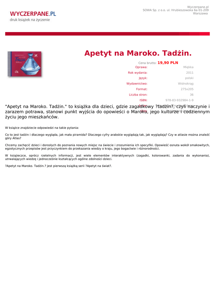 Wyczerpane.pl SOWA Sp. z o.o. ul. Hrubieszowska 6a 01-209 Warszawa Apetyt na Maroko. Tadżin. Cena brutto: Oprawa: 19,90 PLN Miękka Rok wydania: 2011 Język: polski Wydawnictwo: Widnokrąg Format: 275x205 Liczba stron: 36 ISBN: Autor: zagadkowy 978-83-932984-1-9 Nowacka-Devillard ?tadżin?, czyli Anna naczynie "Apetyt na Maroko. Tadżin." to książka dla dzieci, gdzie i EAN: 9788393298419 zarazem potrawa, stanowi punkt wyjścia do opowieści o Maroku, jego kulturze i codziennym życiu jego mieszkańców. W książce znajdziecie odpowiedzi na takie pytania: Co to jest tadżin i dlaczego wygląda, jak mała piramida? Dlaczego cyfry arabskie wyglądają tak, jak wyglądają? Czy w atlasie można znaleźć góry Atlas? Chcemy zachęcić dzieci i dorosłych do poznania nowych miejsc na świecie i zrozumienia ich specyfiki. Opowieść osnuta wokół smakowitych, egzotycznych przepisów jest przyczynkiem do przekazania wiedzy o kraju, jego bogactwie i różnorodności. W książeczce, oprócz rzetelnych informacji, jest wiele elementów interaktywnych (zagadki, kolorowanki, zadania do wykonania), utrwalających wiedzę i jednocześnie kształcących ogólne zdolności dzieci. ?Apetyt na Maroko. Tadżin.? jest pierwszą książką serii ?Apetyt na świat?.
