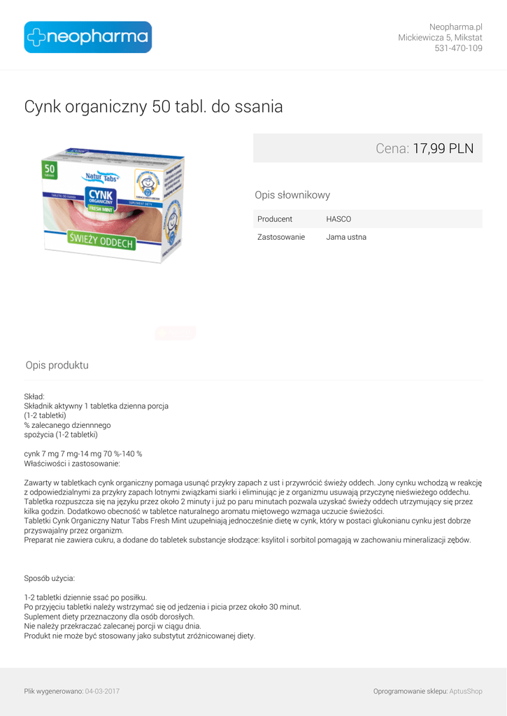 Neopharma.pl Mickiewicza 5, Mikstat 531-470-109 Cynk organiczny 50 tabl. do ssania Cena: 17,99 PLN Opis słownikowy Producent HASCO Zastosowanie Jama ustna Opis produktu Skład: Składnik aktywny 1 tabletka dzienna porcja (1-2 tabletki) % zalecanego dziennnego spożycia (1-2 tabletki) cynk 7 mg 7 mg-14 mg 70 %-140 % Właściwości i zastosowanie: Zawarty w tabletkach cynk organiczny pomaga usunąć przykry zapach z ust i przywrócić świeży oddech. Jony cynku wchodzą w reakcję z odpowiedzialnymi za przykry zapach lotnymi związkami siarki i eliminując je z organizmu usuwają przyczynę nieświeżego oddechu. Tabletka rozpuszcza się na języku przez około 2 minuty i już po paru minutach pozwala uzyskać świeży oddech utrzymujący się przez kilka godzin. Dodatkowo obecność w tabletce naturalnego aromatu miętowego wzmaga uczucie świeżości. Tabletki Cynk Organiczny Natur Tabs Fresh Mint uzupełniają jednocześnie dietę w cynk, który w postaci glukonianu cynku jest dobrze przyswajalny przez organizm. Preparat nie zawiera cukru, a dodane do tabletek substancje słodzące: ksylitol i sorbitol pomagają w zachowaniu mineralizacji zębów. Sposób użycia: 1-2 tabletki dziennie ssać po posiłku. Po przyjęciu tabletki należy wstrzymać się od jedzenia i picia przez około 30 minut. Suplement diety przeznaczony dla osób dorosłych. Nie należy przekraczać zalecanej porcji w ciągu dnia. Produkt nie może być stosowany jako substytut zróżnicowanej diety. Plik wygenerowano: 04-03-2017 Oprogramowanie sklepu: AptusShop Neopharma.pl Mickiewicza 5, Mikstat 531-470-109 Spożycie w nadmiernych ilościach może mieć efekt przeczyszczający. Ważne jest prowadzenie zdrowego trybu życia i zrównoważonego sposobu żywienia. Plik wygenerowano: 04-03-2017 Powered by TCPDF (www.tcpdf.org) Oprogramowanie sklepu: AptusShop