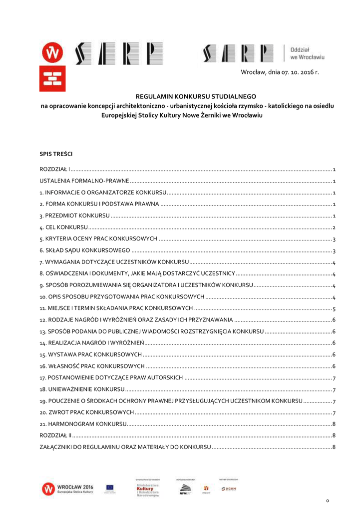 Wrocław, dnia 07. 10. 2016 r. REGULAMIN KONKURSU STUDIALNEGO na opracowanie koncepcji architektoniczno - urbanistycznej kościoła rzymsko - katolickiego na osiedlu Europejskiej Stolicy Kultury Nowe Żerniki we Wrocławiu SPIS TREŚCI ROZDZIAŁ I ................................................................................................................................................................... 1 USTALENIA FORMALNO-PRAWNE .............................................................................................................................. 1 1. INFORMACJE O ORGANIZATORZE KONKURSU ....................................................................................................... 1 2. FORMA KONKURSU I PODSTAWA PRAWNA ........................................................................................................... 1 3. PRZEDMIOT KONKURSU .......................................................................................................................................... 1 4. CEL KONKURSU ........................................................................................................................................................ 2 5. KRYTERIA OCENY PRAC KONKURSOWYCH ............................................................................................................ 3 6. SKŁAD SĄDU KONKURSOWEGO ............................................................................................................................. 3 7. WYMAGANIA DOTYCZĄCE UCZESTNIKÓW KONKURSU ......................................................................................... 4 8. OŚWIADCZENIA I DOKUMENTY, JAKIE MAJĄ DOSTARCZYĆ UCZESTNICY ............................................................ 4 9. SPOSÓB POROZUMIEWANIA SIĘ ORGANIZATORA I UCZESTNIKÓW KONKURSU ................................................. 4 10. OPIS SPOSOBU PRZYGOTOWANIA PRAC KONKURSOWYCH ............................................................................... 4 11. MIEJSCE I TERMIN SKŁADANIA PRAC KONKURSOWYCH ...................................................................................... 5 12. RODZAJE NAGRÓD I WYRÓŻNIEŃ ORAZ ZASADY ICH PRZYZNAWANIA ............................................................. 6 13. SPOSÓB PODANIA DO PUBLICZNEJ WIADOMOŚCI ROZSTRZYGNIĘCIA KONKURSU .......................................... 6 14. REALIZACJA NAGRÓD I WYRÓŻNIEŃ ..................................................................................................................... 6 15. WYSTAWA PRAC KONKURSOWYCH ...................................................................................................................... 6 16. WŁASNOŚĆ PRAC KONKURSOWYCH .................................................................................................................... 6 17. POSTANOWIENIE DOTYCZĄCE PRAW AUTORSKICH ............................................................................................ 7 18. UNIEWAŻNIENIE KONKURSU ................................................................................................................................. 7 19. POUCZENIE O ŚRODKACH OCHRONY PRAWNEJ PRZYSŁUGUJĄCYCH UCZESTNIKOM KONKURSU .................. 7 20. ZWROT PRAC KONKURSOWYCH ........................................................................................................................... 7 21. HARMONOGRAM KONKURSU................................................................................................................................ 8 ROZDZIAŁ II .................................................................................................................................................................. 8 ZAŁĄCZNIKI DO REGULAMINU ORAZ MATERIAŁY DO KONKURSU ........................................................................... 8 0 ROZDZIAŁ I USTALENIA FORMALNO-PRAWNE 1. INFORMACJE O ORGANIZATORZE KONKURSU 1.1. Organizatorem Konkursu Studialnego jest Zarząd Główny SARP we współpracy SARP O/Wrocław Stowarzyszenie Architektów Polskich oddział Wrocław z siedzibą we Wrocławiu, Rynek-Ratusz 25, 50-101 Wrocław, www.wroclaw.sarp.org.pl, e - mail: [email protected] 1.2. Osobą upoważnioną do kontaktów z Uczestnikami Konkursu jest: Sekretarz Organizacyjny Konkursu: arch. Daria Kieżun, e-mail: [email protected] 1.3. Konkurs realizowany jest przez SARP ZG oraz SARP O/Wrocław na zamówienie Biura Festiwalowego Impart 2016 (Zamawiający). 1.4.Konkurs Studialny jest elementem projektu interdyscyplinarnego pt. „Kościół. Piękno i Kicz” (Projekt) będącego przedsięwzięciem realizowanym w ramach obchodów Europejskiej Stolicy Kultury Wrocław 2016 i dofinansowanego ze środków Ministerstwa Kultury i Dziedzictwa Narodowego, których dysponentem jest Narodowe Forum Muzyki. 2. FORMA KONKURSU I PODSTAWA PRAWNA 2.1. Konkurs jest międzynarodowy, otwarty, jednoetapowy, studialny. 2.2. Podstawą prawną Konkursu jest: Ustawa z dnia 4 lutego 1994 r. o prawie autorskim i prawach pokrewnych (tekst jednolity Dz. U. z 2006 r. Nr 90, poz. 631 ze zm.) Zasady konkursów architektonicznych, urbanistyczno-architektonicznych i urbanistycznych SARP z 2016 r. 2.3. Konkurs jest prowadzony w języku polskim. 3. PRZEDMIOT KONKURSU 3.1. Przedmiotem Konkursu Studialnego jest opracowanie koncepcji urbanistyczno - architektonicznej kościoła wyznania rzymsko-katolickiego dla lokalnej społeczności na terenie osiedla Europejskiej Stolicy Kultury Nowe Żerniki we Wrocławiu. 3.2.Zasadniczym zadaniem stawianym przed Uczestnikami Konkursu jest wykreowanie nowej, współczesnej wizji kościoła jako miejsca kultu (sacrum), a jednocześnie będącego terenem przeznaczonym na aktywności związane z działaniem lokalnych społeczności (profanum), zgodnie z otwartością idei Vaticanum II zapisanymi w KLŚ. Przy projektowaniu kościoła należy troskliwie dbać o to, aby ułatwiał wykonywanie czynności liturgicznych oraz os