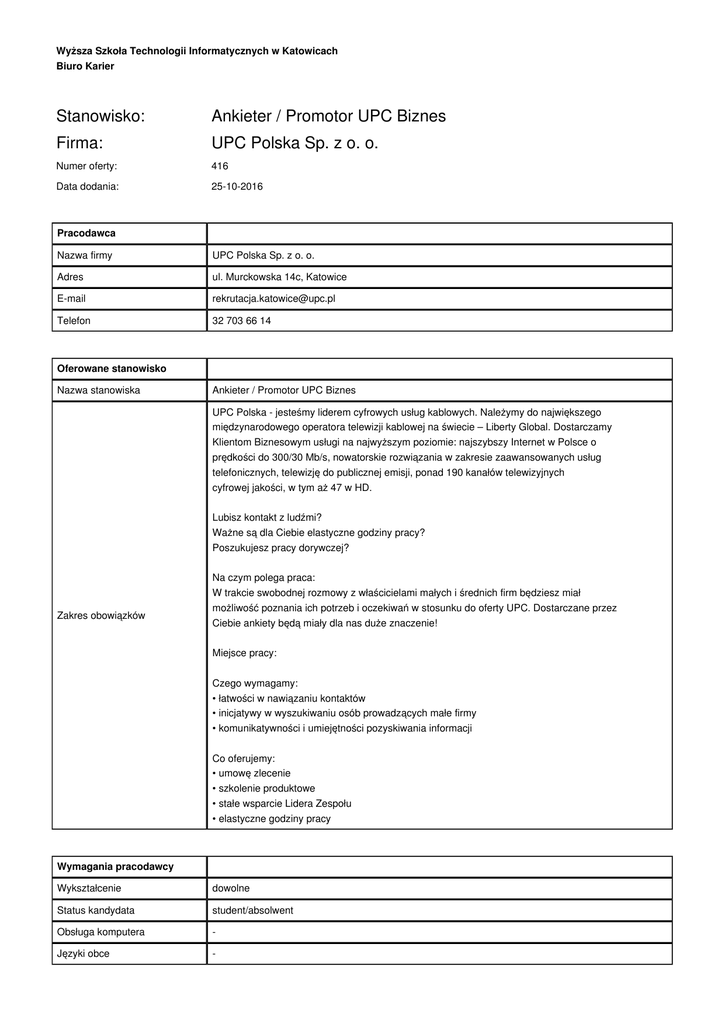 Wyższa Szkoła Technologii Informatycznych w Katowicach Biuro Karier Stanowisko: Ankieter / Promotor UPC Biznes Firma: UPC Polska Sp. z o. o. Numer oferty: 416 Data dodania: 25-10-2016 Pracodawca Nazwa firmy UPC Polska Sp. z o. o. Adres ul. Murckowska 14c, Katowice E-mail [email protected] Telefon 32 703 66 14 Oferowane stanowisko Nazwa stanowiska Ankieter / Promotor UPC Biznes UPC Polska - jesteśmy liderem cyfrowych usług kablowych. Należymy do największego międzynarodowego operatora telewizji kablowej na świecie – Liberty Global. Dostarczamy Klientom Biznesowym usługi na najwyższym poziomie: najszybszy Internet w Polsce o prędkości do 300/30 Mb/s, nowatorskie rozwiązania w zakresie zaawansowanych usług telefonicznych, telewizję do publicznej emisji, ponad 190 kanałów telewizyjnych cyfrowej jakości, w tym aż 47 w HD. Lubisz kontakt z ludźmi? Ważne są dla Ciebie elastyczne godziny pracy? Poszukujesz pracy dorywczej? Na czym polega praca: W trakcie swobodnej rozmowy z właścicielami małych i średnich firm będziesz miał Zakres obowiązków możliwość poznania ich potrzeb i oczekiwań w stosunku do oferty UPC. Dostarczane przez Ciebie ankiety będą miały dla nas duże znaczenie! Miejsce pracy: Czego wymagamy: • łatwości w nawiązaniu kontaktów • inicjatywy w wyszukiwaniu osób prowadzących małe firmy • komunikatywności i umiejętności pozyskiwania informacji Co oferujemy: • umowę zlecenie • szkolenie produktowe • stałe wsparcie Lidera Zespołu • elastyczne godziny pracy Wymagania pracodawcy Wykształcenie dowolne Status kandydata student/absolwent Obsługa komputera - Języki obce - Umiejętności, predyspozycje 1/2 komunikatywność, sumienność, zaangażowanie Warunki pracy Wymagane dokumenty CV Forma umowy umowa zlecenie Czas zatrudnienia dowolny Godzinowy wymiar pracy praca dorywcza Data rozpoczęcia pracy 0000-00-00 Inne świadczenia - Rekrutacja Termin i forma zgłoszenia https://www.upc.pl/kariera/oferty-pracy/ Sposób kontaktowania się z firmą [email protected] Dodatkowe informacje 2/2 Prosimy o aplikację za pośrednictwem strony internetowej: https://www.upc.pl/kariera/oferty-pracy/ Po wpisaniu nazwy stanowiska "Promotor UPC Biznes" odpowiedz na ofertę dotyczącą dogodnej lokalizacji.