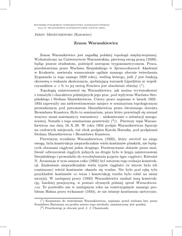 ROCZNIKI POLSKIEGO TOWARZYSTWA MATEMATYCZNEGO Seria II: WIADOMOŚCI MATEMATYCZNE XXXVII (2001) Jerzy Mioduszewski (Katowice) Zenon Waraszkiewicz Zenon Waraszkiewicz jest zagadką polskiej topologii międzywojennej. Wykształcony na Uniwersytecie Warszawskim, pierwszą swoją pracę (1929), będąc jeszcze studentem, poświęcił szeregom trygonometrycznym. Praca, przedstawiona przez Wacława Sierpińskiego w Sprawozdaniach Akademii w Krakowie, zawierała wzmocnienie ogólnie znanego obecnie twierdzenia Zygmunda (z tego samego 1929 roku), według którego, jeśli f jest funkcją okresową o wahaniu skończonym, spełniającą warunek Lipschitza ze współczynnikiem α > 0, to jej szereg Fouriera jest absolutnie zbieżny (1 ). Topologią zainteresował się Waraszkiewicz, jak można wywnioskować z tematyki i charakteru późniejszych jego prac, pod wpływem Wacława Sierpińskiego i Stefana Mazurkiewicza. Cztery prace napisane w latach 1932– 1934 zapewniły mu niekwestionowane miejsce w seminarium topologicznym prowadzonym pod patronatem Mazurkiewicza przez ówczesnego docenta Bronisława Knastera. Było to seminarium, przez które przewinęli się niemal wszyscy znani matematycy warszawscy – niekoniecznie o orientacji mnogościowej. Notatki z tego seminarium przetrwały (2 )). Pierwszy wpis Waraszkiewicza ma datę 16. X. 29. W roku 1934 podpis Waraszkiewicza figuruje na czołowych miejscach, tuż obok podpisu Karola Borsuka, pod podpisami Stefana Mazurkiewicza i Bronisława Knastera. Pierwszym wynikiem Waraszkiewicza (1932), który zwrócił na niego uwagę, była konstrukcja nieprzeliczalnie wielu kontinuów płaskich, nie będących obrazami ciągłymi jeden drugiego. Porównywanie zbiorów przez możliwość odwzorowań ciągłych jednych na drugie było w kręgu zainteresowań Sierpińskiego i prowadziło do wyodrębnienia pojęcia typu ciągłości. Również N. Aronszajn w tym samym roku (1932) był autorem tego rodzaju konstrukcji. Znalezienie nieprzeliczalnie wielu typów ciągłości (w istocie było ich continuum) wśród kontinuów okazało się trudne. Nie było pod ręką tylu przykładów kontinuów co teraz i konstrukcję trzeba było robić na ziemi niczyjej. W następnej pracy (1933) Waraszkiewicz znalazł inną konstrukcję, bardziej przejrzystą, w postaci słynnych później spiral Waraszkiewicza. To pozwoliło mu w następnym roku na rozstrzygnięcie znanego problemu Hahna przez wykazanie (1934), że nie istnieje kontinuum metryczne, (1 ) Komentarz do twierdzenia Waraszkiewicza, napisany przed wieloma laty przez Stanisława Hartmana na prośbę autora tego artykułu, zamieszczony jest poniżej. (2 ) Przechowuje je obecnie prof. J. J. Charatonik. 140 J. M i o d u s z e w s k i z którego można by dostać wszystkie wspomniane spirale jako obrazy ciągłe. Twierdzenie to pamięta się przeważnie w postaci wniosku o nieistnieniu wspólnego modelu dla kontinuów metrycznych. Kontrastuje to ze znanym twierdzeniem Hahna, według którego dla kontinuów lokalnie spójnych wspólny model istnieje i jest nim odcinek prostej rzeczywistej. W roku 1936 Waraszkiewicz habilituje się, a treść rozprawy ogłasza w Wiadomościach Matematycznych w pracy pod tytułem „O pokrewieństwie kontynuów”. Treść tej pracy jest mało znana nawet specjalistom z teorii kontinuów. Nie wspomina o niej J. J. Charatonik w swoim obszernym przeglądzie (1998). Jest trudno czytelna. Mogą być w niej rzeczy wątpliwe, ale jeśli nawet, są to rzeczy o dużym znaczeniu. Przez kontinuum pokrewne z odcinkiem rozumie Waraszkiewicz kontinuum, które dla każdego ε > 0 odwzorowuje się w sposób ciągły na odcinek za pomocą tzw. ε-odwzorowania, tj. odwzorowania ciągłego nie utożsamiającego punktów będących w odległości większej niż ε. Waraszkiewicz dowodzi, że kontinua pokrewne z odcinkiem są płaskie i są nieprzywiedlne między dwoma punktami. Jest w tej pracy podane kryterium na istnienie wspólnego modelu dla rodzin kontinuów. Waraszkiewicz w oparciu o to kryterium stwierdza, że kontinua pokrewne z odcinkiem mają wspólny model wśród kontinuów. Jak obecnie wiadomo, tym wspólnym modelem jest (znane Waraszkiewiczowi) kontinuum dziedzicznie nierozkładalne Knastera, które jest – co nietrudno widzieć z konstrukcji – pokrewne odcinkowi. Ale twierdzenie Waraszkiewicza ma charakter ściśle egzystencjalny i nie wskazuje konkretnego przykładu. Pojęcie pokrewieństwa zawdzięczał Waraszkiewicz, jak o tym sam pisał, P. S. Aleksandrowowi z jego znanej pracy z Mathematische Annalen (1929). Pokrewieństwo z odcinkiem pojawiło się w latach powojennych w innej formie u R. H. Binga (1951), który rozważał kontinua nazywane łańcuchowymi. W ich opisie Bing posłużył się ciągami pokryć w postaci łańcuchów, tj. odcinków w znaczeniu kombinatorycznym. Dobrze wiadomo, poprzez znane twierdzenia ogólne, że opis ten jest równoważny z opisem Waraszkiewicza poprzez ε-odwzorowania. Nie cytuje się Waraszkewicza jako prekursora kontinuów łańcuchowych, a powinno się, chociażby z powodu już wspomnianych twierdzeń o spłaszczalności i nieprzewidywalności, i to niezależnie od wartości ich dowodów. Twierdzenia te były dowiedzione w późniejszych latach przez Binga i Sorgenfreya, którzy nie czytali zapewne napisanej po polsku rozprawy. Upoważnia do upomnienia się o Waraszkiewicza jeszcze twierdzenie o kontinuach łańcuchowych, które chociaż okazało się fałszywe, było trudno sprawdzalną hipotezą. Waraszkiewicz twierdził (1937), że kontinua metryczne atriodyczne nie rozcinające płaszczyzny są łańcuchowe. Błąd zauważony był dość późno, bo w roku 1974, przez W. T. Ingrama. Zenon Waraszkiewicz 141 W ujęciu Waraszkiewicza niemal natychmiastowy jest dowód własności punktu stałego dla kontinuów łańcuchowych, co było przedmiotem kilku prac robionych po wojnie. W pewnym miejscu rozprawy Waraszkiewicz dowodzi istotnej części twierdz