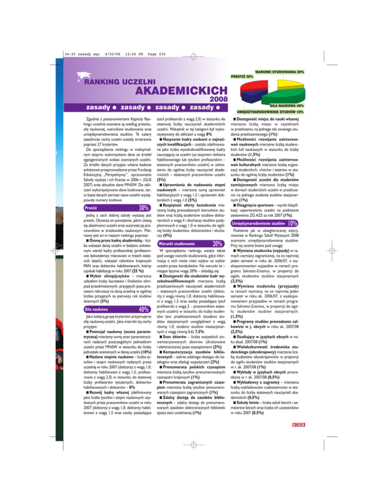 34-35 zasady mgr 4/30/08 12:26 PM Page 035 RANKING UCZELNI WARUNKI STUDIOWANIA 20% PRESTI˚ 30% AKADEMICKICH 2008 zasady ● zasady ● Zgodnie z postanowieniami Kapitu∏y Rankingu uczelnie oceniane sà wed∏ug presti˝u, si∏y naukowej, warunków studiowania oraz umi´dzynarodowienia studiów. Te cztery zasadnicze cechy uczelni zosta∏y zmierzone poprzez 27 kryteriów. Do sporzàdzenia rankingu w maksymalnym stopniu wykorzystano dane ze êróde∏ egzogenicznych wobec ocenianych uczelni. Za êród∏o danych przyj´to w∏asne badanie ankietowe przeprowadzone przez Fundacj´ Edukacyjnà „Perspektywy”, opracowanie Szko∏y wy˝sze i ich finanse w 2006 r. (GUS 2007) oraz aktualne dane MNiSW. Do obliczeƒ wykorzystywano dane kodowane, tzn. w bazie danych zamiast nazw uczelni wyst´powa∏y numery kodowe. Presti˝ 30% Jednà z cech dobrej szko∏y wy˝szej jest presti˝. Oznacza on powa˝anie, jakim cieszà si´ absolwenci uczelni oraz autorytet jej pracowników w Êrodowisku naukowym. Mierzony jest on w naszym rankingu poprzez: ■ Ocen´ przez kadr´ akademickà – liczba wskazaƒ danej uczelni w badaniu ankietowym wÊród kadry profesorskiej (profesorowie belwederscy mianowani w trzech ostatnich latach), wskazaƒ cz∏onków krajowych PAN oraz doktorów habilitowanych, którzy uzyskali habilitacj´ w roku 2007 (25 %) ■ Wybór olimpijczyków – mierzony udzia∏em liczby laureatów i finalistów olimpiad przedmiotowych, przyj´tych poza procesem rekrutacji na danà uczelni´ w ogólnej liczbie przyj´tych na pierwszy rok studiów dziennych (5%) Si∏a naukowa 40% Jako kolejnà grup´ kryteriów przyjmujemy si∏´ naukowà uczelni. Jako mierniki tej cechy przyj´to: ■ Potencja∏ naukowy (ocena parametryczna) mierzony sumà ocen parametrycznych nadanych poszczególnym jednostkom uczelni przez MNiSW w stosunku do liczby jednostek ocenionych w danej uczelni (10%) ■ Nadane stopnie naukowe – liczba tytu∏ów i stopni naukowych nadanych przez uczelni´ w roku 2007 (doktorzy z wagà 1,0; doktorzy habilitowani z wagà 1,5; profesorowie z wagà 2,0) w stosunku do etatowej liczby profesorów tytularnych, doktorów habilitowanych i doktorów – 8% ■ Rozwój kadry w∏asnej zdefiniowany jako liczba tytu∏ów i stopni naukowych uzyskanych przez pracowników uczelni w roku 2007 (doktorzy z wagà 1,0; doktorzy habilitowani z wagà 1,5 oraz osoby posiadajàce zasady ● zasady ● tytu∏ profesorski z wagà 2,0) w stosunku do etatowej liczby nauczycieli akademickich uczelni. Wskaênik w tej kategorii by∏ wykorzystywany do obliczeƒ z wagà 8% ■ Nasycenie kadry osobami o najwy˝szych kwalifikacjach – zosta∏o zdefiniowane jako liczba wysokokwalifikowanej kadry nauczajàcej na uczelni (za stopniem doktora habilitowanego lub tytu∏em profesorskim – etatowych pracowników uczelni) w odniesieniu do ogólnej liczby nauczycieli akademickich – etatowych pracowników uczelni (5%) ■ Uprawnienia do nadawania stopni naukowych – mierzone sumà uprawnieƒ habilitacyjnych z wagà 1,5 i uprawnieƒ doktorskich z wagà 1,0 (5%) ■ Rozpi´toÊç oferty kszta∏cenia mierzonà liczbà prowadzonych kierunków studiów oraz liczbà studentów studiów doktoranckich z wagà 4 i s∏uchaczy studiów podyplomowych z wagà 1,0 w stosunku do ogólnej liczby studentów, doktorantów i s∏uchaczy (4%) Warunki studiowania 20% W sporzàdzeniu rankingu wzi´to tak˝e pod uwag´ warunki studiowania, gdy˝ informacja o nich mo˝e mieç wp∏yw na wybór uczelni przez kandydatów. Na warunki te – majàce ∏àcznie wag´ 20% – sk∏adajà si´: ■ Dost´pnoÊç dla studentów kadr wysokokwalifikowanych mierzona liczbà przeliczeniowych nauczycieli akademickich – etatowych pracowników uczelni (doktorzy z wagà równà 1,0; doktorzy habilitowani z wagà 1,5 oraz osoby posiadajàce tytu∏ profesorski z wagà 2 – pracowników etatowych uczelni) w stosunku do liczby studentów tzw. przeliczeniowych (studenci studiów stacjonarnych uwzgl´dnieni z wagà równà 1,0; studenci studiów niestacjonarnych z wagà równà 0,6) 7,5% ■ Stan zbiorów – liczba wszystkich zinwentaryzowanych zbiorów (drukowane i elektroniczne) poza czasopismami (2%) ■ Komputeryzacja zasobów bibliotecznych – zakres zdalnego dost´pu do katalogów oraz obs∏ugi wypo˝yczeƒ (2%) ■ Prenumerata polskich czasopism mierzona liczbà tytu∏ów prenumerowanych czasopism krajowych (1%) ■ Prenumerata zagranicznych czasopism mierzona liczbà tytu∏ów prenumerowanych czasopism zagranicznych (1%) ■ Zdalny dost´p do zasobów bibliotecznych – zdalny dost´p do prenumerowanych zasobów elektronicznych biblioteki spoza sieci uczelnianej (1%) SI¸A NAUKOWA 40% UMI¢DZYNARODOWIENIE STUDIÓW 10% ■ Dost´pnoÊç miejsc do nauki w∏asnej mierzona liczbà miejsc w czytelniach w przeliczeniu na jednego tak zwanego studenta przeliczeniowego (1%) ■ Mo˝liwoÊci rozwijania zainteresowaƒ naukowych mierzone liczbà studenckich kó∏ naukowych w stosunku do liczby studentów (1,5%) ■ Mo˝liwoÊci rozwijania zainteresowaƒ kulturalnych mierzone liczbà organizacji studenckich, chórów i teatrów w stosunku do ogólnej liczby studentów (1%) ■ Dost´pnoÊç uczelni dla studentów zamiejscowych mierzona liczbà miejsc w domach studenckich uczelni w przeliczeniu na jednego studenta studiów stacjonarnych (1%) ■ Osiàgni´cia sportowe – wyniki klasyfikacji usportowienia uczelni na podstawie zestawienia ZG AZS za rok 2007 (1%). Umi´dzynarodowienie studiów 10% Podobnie jak w ubieg∏orocznej edycji, równie˝ w Rankingu Szkó∏ Wy˝szych 2008 oceniono umi´dzynarodowienie studiów. Przy tej ocenie brano pod uwag´: ■ Wymiana studencka (wyjazdy) w ramach wymiany zagranicznej, na co najmniej jeden semestr w roku ak. 2006/07, z wyeksponowaniem wyjazdów w ramach programu Sokrates-Erasmus, w proporcji do ogó∏u studentów studiów stacjonarnych (2,5%) ■ Wymiana studencka (przyjazdy) w ramach wymiany, na co najmnie