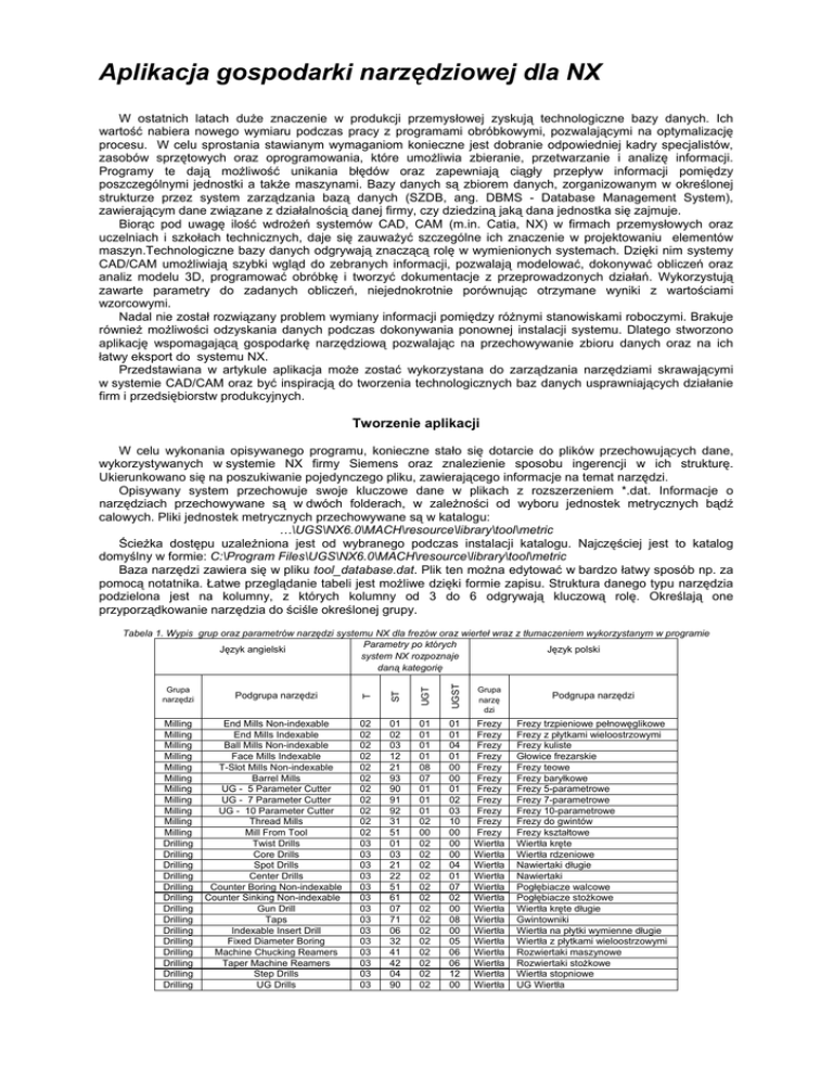 Aplikacja gospodarki narzędziowej dla NX W ostatnich latach duże znaczenie w produkcji przemysłowej zyskują technologiczne bazy danych. Ich wartość nabiera nowego wymiaru podczas pracy z programami obróbkowymi, pozwalającymi na optymalizację procesu. W celu sprostania stawianym wymaganiom konieczne jest dobranie odpowiedniej kadry specjalistów, zasobów sprzętowych oraz oprogramowania, które umożliwia zbieranie, przetwarzanie i analizę informacji. Programy te dają możliwość unikania błędów oraz zapewniają ciągły przepływ informacji pomiędzy poszczególnymi jednostki a także maszynami. Bazy danych są zbiorem danych, zorganizowanym w określonej strukturze przez system zarządzania bazą danych (SZDB, ang. DBMS - Database Management System), zawierającym dane związane z działalnością danej firmy, czy dziedziną jaką dana jednostka się zajmuje. Biorąc pod uwagę ilość wdrożeń systemów CAD, CAM (m.in. Catia, NX) w firmach przemysłowych oraz uczelniach i szkołach technicznych, daje się zauważyć szczególne ich znaczenie w projektowaniu elementów maszyn.Technologiczne bazy danych odgrywają znaczącą rolę w wymienionych systemach. Dzięki nim systemy CAD/CAM umożliwiają szybki wgląd do zebranych informacji, pozwalają modelować, dokonywać obliczeń oraz analiz modelu 3D, programować obróbkę i tworzyć dokumentacje z przeprowadzonych działań. Wykorzystują zawarte parametry do zadanych obliczeń, niejednokrotnie porównując otrzymane wyniki z wartościami wzorcowymi. Nadal nie został rozwiązany problem wymiany informacji pomiędzy różnymi stanowiskami roboczymi. Brakuje również możliwości odzyskania danych podczas dokonywania ponownej instalacji systemu. Dlatego stworzono aplikację wspomagającą gospodarkę narzędziową pozwalając na przechowywanie zbioru danych oraz na ich łatwy eksport do systemu NX. Przedstawiana w artykule aplikacja może zostać wykorzystana do zarządzania narzędziami skrawającymi w systemie CAD/CAM oraz być inspiracją do tworzenia technologicznych baz danych usprawniających działanie firm i przedsiębiorstw produkcyjnych. Tworzenie aplikacji W celu wykonania opisywanego programu, konieczne stało się dotarcie do plików przechowujących dane, wykorzystywanych w systemie NX firmy Siemens oraz znalezienie sposobu ingerencji w ich strukturę. Ukierunkowano się na poszukiwanie pojedynczego pliku, zawierającego informacje na temat narzędzi. Opisywany system przechowuje swoje kluczowe dane w plikach z rozszerzeniem *.dat. Informacje o narzędziach przechowywane są w dwóch folderach, w zależności od wyboru jednostek metrycznych bądź calowych. Pliki jednostek metrycznych przechowywane są w katalogu: …\UGS\NX6.0\MACH\resource\library\tool\metric Ścieżka dostępu uzależniona jest od wybranego podczas instalacji katalogu. Najczęściej jest to katalog domyślny w formie: C:\Program Files\UGS\NX6.0\MACH\resource\library\tool\metric Baza narzędzi zawiera się w pliku tool_database.dat. Plik ten można edytować w bardzo łatwy sposób np. za pomocą notatnika. Łatwe przeglądanie tabeli jest możliwe dzięki formie zapisu. Struktura danego typu narzędzia podzielona jest na kolumny, z których kolumny od 3 do 6 odgrywają kluczową rolę. Określają one przyporządkowanie narzędzia do ściśle określonej grupy. UGT UGST Milling Milling Milling Milling Milling Milling Milling Milling Milling Milling Milling Drilling Drilling Drilling Drilling Drilling Drilling Drilling Drilling Drilling Drilling Drilling Drilling Drilling Drilling Podgrupa narzędzi ST Grupa narzędzi T Tabela 1. Wypis grup oraz parametrów narzędzi systemu NX dla frezów oraz wierteł wraz z tłumaczeniem wykorzystanym w programie Parametry po których Język angielski Język polski system NX rozpoznaje daną kategorię Grupa narzę dzi End Mills Non-indexable End Mills Indexable Ball Mills Non-indexable Face Mills Indexable T-Slot Mills Non-indexable Barrel Mills UG - 5 Parameter Cutter UG - 7 Parameter Cutter UG - 10 Parameter Cutter Thread Mills Mill From Tool Twist Drills Core Drills Spot Drills Center Drills Counter Boring Non-indexable Counter Sinking Non-indexable Gun Drill Taps Indexable Insert Drill Fixed Diameter Boring Machine Chucking Reamers Taper Machine Reamers Step Drills UG Drills 02 02 02 02 02 02 02 02 02 02 02 03 03 03 03 03 03 03 03 03 03 03 03 03 03 01 02 03 12 21 93 90 91 92 31 51 01 03 21 22 51 61 07 71 06 32 41 42 04 90 01 01 01 01 08 07 01 01 01 02 00 02 02 02 02 02 02 02 02 02 02 02 02 02 02 01 01 04 01 00 00 01 02 03 10 00 00 00 04 01 07 02 00 08 00 05 06 06 12 00 Frezy Frezy Frezy Frezy Frezy Frezy Frezy Frezy Frezy Frezy Frezy Wiertła Wiertła Wiertła Wiertła Wiertła Wiertła Wiertła Wiertła Wiertła Wiertła Wiertła Wiertła Wiertła Wiertła Podgrupa narzędzi Frezy trzpieniowe pełnowęglikowe Frezy z płytkami wieloostrzowymi Frezy kuliste Głowice frezarskie Frezy teowe Frezy baryłkowe Frezy 5-parametrowe Frezy 7-parametrowe Frezy 10-parametrowe Frezy do gwintów Frezy kształtowe Wiertła kręte Wiertła rdzeniowe Nawiertaki długie Nawiertaki Pogłębiacze walcowe Pogłębiacze stożkowe Wiertła kręte długie Gwintowniki Wiertła na płytki wymienne długie Wiertła z płytkami wieloostrzowymi Rozwiertaki maszynowe Rozwiertaki stożkowe Wiertła stopniowe UG Wiertła Dzięki polom w kolumnach które pełnią rolę kluczy, których wartości określają rodzaj grupy system rozpoznaje i przyporządkowuje określone nadrzędzie pożądanej grupie. Pola pełniące rolę unikatowych identyfikatorów, zamieszczone w kolumnach, przechowują dane o tym samym znaczeniu w kolejnych wierszach. Struktura grup ma charakter hierarchiczny a miejsca konkretnych grup rozpoznawane są na podstawie kolumn T, ST, UGT, UGST. Grupy narzędzi oraz ich identyfikatory przedstawia Tabela 1. Dane narzędziowe wprowadzane są do pliku w określonej kolejności. System rozpoznaje poszczególne pola z