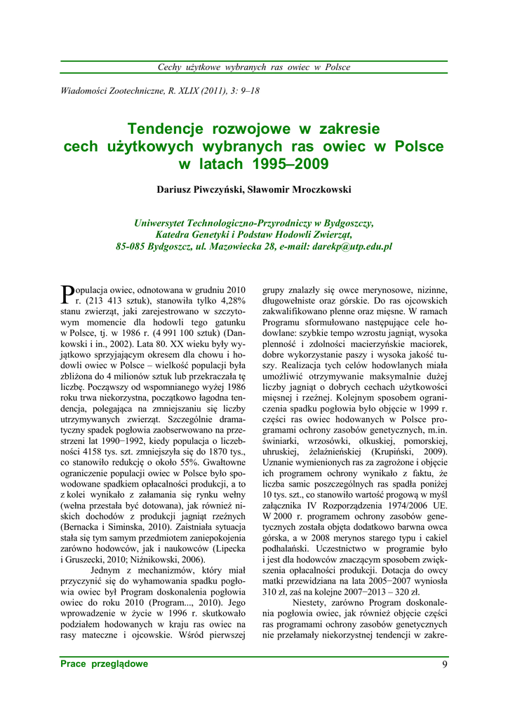 Cechy użytkowe wybranych ras owiec w Polsce Wiadomości Zootechniczne, R. XLIX (2011), 3: 9–18 Tendencje rozwojowe w zakresie cech użytkowych wybranych ras owiec w Polsce w latach 1995–2009 Dariusz Piwczyński, Sławomir Mroczkowski Uniwersytet Technologiczno-Przyrodniczy w Bydgoszczy, Katedra Genetyki i Podstaw Hodowli Zwierząt, 85-085 Bydgoszcz, ul. Mazowiecka 28, e-mail: [email protected] P opulacja owiec, odnotowana w grudniu 2010 r. (213 413 sztuk), stanowiła tylko 4,28% stanu zwierząt, jaki zarejestrowano w szczytowym momencie dla hodowli tego gatunku w Polsce, tj. w 1986 r. (4 991 100 sztuk) (Dankowski i in., 2002). Lata 80. XX wieku były wyjątkowo sprzyjającym okresem dla chowu i hodowli owiec w Polsce – wielkość populacji była zbliżona do 4 milionów sztuk lub przekraczała tę liczbę. Począwszy od wspomnianego wyżej 1986 roku trwa niekorzystna, początkowo łagodna tendencja, polegająca na zmniejszaniu się liczby utrzymywanych zwierząt. Szczególnie dramatyczny spadek pogłowia zaobserwowano na przestrzeni lat 1990−1992, kiedy populacja o liczebności 4158 tys. szt. zmniejszyła się do 1870 tys., co stanowiło redukcję o około 55%. Gwałtowne ograniczenie populacji owiec w Polsce było spowodowane spadkiem opłacalności produkcji, a to z kolei wynikało z załamania się rynku wełny (wełna przestała być dotowana), jak również niskich dochodów z produkcji jagniąt rzeźnych (Bernacka i Siminska, 2010). Zaistniała sytuacja stała się tym samym przedmiotem zaniepokojenia zarówno hodowców, jak i naukowców (Lipecka i Gruszecki, 2010; Niżnikowski, 2006). Jednym z mechanizmów, który miał przyczynić się do wyhamowania spadku pogłowia owiec był Program doskonalenia pogłowia owiec do roku 2010 (Program..., 2010). Jego wprowadzenie w życie w 1996 r. skutkowało podziałem hodowanych w kraju ras owiec na rasy mateczne i ojcowskie. Wśród pierwszej Prace przeglądowe grupy znalazły się owce merynosowe, nizinne, długowełniste oraz górskie. Do ras ojcowskich zakwalifikowano plenne oraz mięsne. W ramach Programu sformułowano następujące cele hodowlane: szybkie tempo wzrostu jagniąt, wysoka plenność i zdolności macierzyńskie maciorek, dobre wykorzystanie paszy i wysoka jakość tuszy. Realizacja tych celów hodowlanych miała umożliwić otrzymywanie maksymalnie dużej liczby jagniąt o dobrych cechach użytkowości mięsnej i rzeźnej. Kolejnym sposobem ograniczenia spadku pogłowia było objęcie w 1999 r. części ras owiec hodowanych w Polsce programami ochrony zasobów genetycznych, m.in. świniarki, wrzosówki, olkuskiej, pomorskiej, uhruskiej, żelaźnieńskiej (Krupiński, 2009). Uznanie wymienionych ras za zagrożone i objęcie ich programem ochrony wynikało z faktu, że liczba samic poszczególnych ras spadła poniżej 10 tys. szt., co stanowiło wartość progową w myśl załącznika IV Rozporządzenia 1974/2006 UE. W 2000 r. programem ochrony zasobów genetycznych została objęta dodatkowo barwna owca górska, a w 2008 merynos starego typu i cakiel podhalański. Uczestnictwo w programie było i jest dla hodowców znaczącym sposobem zwiększenia opłacalności produkcji. Dotacja do owcy matki przewidziana na lata 2005−2007 wyniosła 310 zł, zaś na kolejne 2007−2013 – 320 zł. Niestety, zarówno Program doskonalenia pogłowia owiec, jak również objęcie części ras programami ochrony zasobów genetycznych nie przełamały niekorzystnej tendencji w zakre- 9 D. Piwczyński i S. Mroczkowski sie zmniejszania populacji owiec w Polsce. Faktem natomiast jest, że obydwa rozwiązania spowodowały zaskakujące zmiany w strukturze zwierząt objętych oceną użytkowości i wpisanych do ksiąg zwierząt zarodowych (Hodowla..., 1996−2010). Rys. 1. Struktura rasowa maciorek wpisanych do ksiąg zwierząt zarodowych w 1995 r. Fig. 1. Breeds structure of ewes entered into the breeding animal books in 1995 10 Prace przeglądowe Cechy użytkowe wybranych ras owiec w Polsce Rys. 2. Struktura rasowa maciorek wpisanych do ksiąg zwierząt zarodowych w 2009 r. Fig. 2. Breeds structure of ewes entered into the breeding animal books in 2009 W 1995 r. maciorki merynosowe, owce nizinne i długowełniste stanowiły aż 82,11% samic wpisanych do ksiąg zwierząt zarodowych (rys. 1). W 2009 r. udział ten był wyraźnie niższy – 49,24%. Prace przeglądowe Faktem wartym podkreślenia jest to, że w ostatnim czasie największy udział wśród zwierząt wpisanych do ksiąg zarodowych stanowiły, podobnie jak w poprzednich latach, maciorki merynosowe – 18,22%, zaś kolejnymi ra- 11 D. Piwczyński i S. Mroczkowski sami w tym rankingu były: owca pomorska – 11,28% oraz wrzosówka – 10,93%. Czternaście lat wcześniej proporcje te kształtowały się zupełnie inaczej: merynos polski i niemiecki – 42,63%, owca pomorska – 4,16% i wrzosówka – 0,76% (rys. 2). Dynamiczne zmiany, które zaszły w zakresie wielkości i struktury pogłowia owiec w Polsce na przestrzeni ostatnich kilkunastu lat skłoniły autorów do analizowania tendencji rozwojowych w zakresie cech reprodukcyjnych populacji krajowej maciorek ras: merynos polski, owca pomorska i wrzosówka w latach 1995−2009. Z uwagi na fakt, że dopiero od 2008 r. dostępne są dane z kontroli użytkowości merynosa polskiego w starym typie, zwierząt tych nie wzięto pod uwagę przy wyznaczaniu tendencji rozwojowych. Dane liczbowe zebrano na podstawie corocznie publikowanych przez Polski Związek Owczarski raportów „Hodowla owiec i kóz w Polsce” (Hodowla…, 1996−2010). Analizowano cechy związane z rozrodem: płodność (%), plenność (%), odchów jagniąt (%) oraz użytkowość rozpłodową (%). Zebrany materiał liczbowy zestawiono w szeregi dynamiczne, na których podstawie wyodrębniano tendencje rozwojowe, stosując metodę analityczną w postaci funkcji matematycznej: y’t = a + bt, gdzie: t – czas wyrażony kolejnymi latami, a – poziom badanej zmiennej 