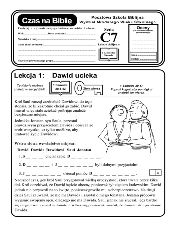 Czas na Bibliê Pocztowa Szko³a Biblijna Wydzia³ M³odszego Wieku Szkolnego Pamiêtaj o wpisaniu swojego imienia, nazwiska i adresu: Wiek..................................Data urodzenia......................................... Nazwisko i imiê.................................................................................... Seria C7 Adres (kod pocztowy)............................................................................... Lekcje biblijne w 1 i 2 Ksiêdze Samuela Nazwisko prowadz¹cego grupê................................................................ Lekcja 1: Dawid ucieka Tê historiê mo¿esz znaleŸæ w swojej Biblii. 1 Samuela 20,1-42 ................................ ................................ ................................ ................................ .............................................................................................................. .............................................................................................................. Oceny (Do naniesienia przez prowadz¹cego) Z³oty wiersz Suma ............................ Ogó³em ........................ 1 Samuela 20,17 Poproœ kogoœ, aby pomóg³ ci znaleŸæ ten wiersz. Król Saul zacz¹³ zazdroœciæ Dawidowi do tego stopnia, ¿e kilkakrotnie chcia³ go zabiæ. Dawid musia³ wiêc stale uciekaæ próbuj¹c znaleŸæ bezpieczne miejsce. Jednak¿e Jonatan, syn Saula, pozosta³ prawdziwym przyjacielem Dawida i obieca³, ¿e zrobi wszystko, co tylko mo¿liwe, aby uratowaæ ¿ycie Dawidowi. Wstaw s³owa we w³aœciwe miejsca: Dawid Dawida Dawidowi Saul Jonatan 1. S __ __ __ chcia³ zabiæ D __ __ __ __ __ . 2. D __ __ __ __ i J __ __ __ __ __ __ byli dobrymi przyjació³mi. 3. J __ __ __ __ __ __ obieca³ pomóc D __ __ __ __ __ __ __ . 6 Nadszed³ czas, gdy król Saul przygotowa³ wielk¹ uroczystoœæ, która trwa³a przez kilka dni. Król oczekiwa³, ¿e Dawid bêdzie obecny, poniewa¿ by³ ziêciem królewskim. Dawid jednak nie przyszed³ na to œwiêto, poniewa¿ grozi³o mu niebezpieczeñstwo. Na drugi dzieñ Saul zauwa¿y³, ¿e nie ma Dawida i zapyta³ o niego Jonatana. Jonatan próbowa³ wyjaœniæ swojemu ojcu, dlaczego nie ma Dawida. Saul jednak nie s³ucha³, lecz bardzo siê rozgniewa³ i rzuci³ w Jonatana w³óczni¹, poniewa¿ uwa¿a³, ¿e Jonatan stoi po stronie Dawida. M C7/1 Kto by³: 1. Królem? S __ __ __ . 2. Synem króla? J __ __ __ __ __ __ . 3. Ziêciem króla? D __ __ __ __ . 4 4. Nieobecny na uroczystoœci? D __ __ __ __ . Tego dnia Jonatan upewni³ siê, ¿e jego ojciec zabije Dawida, jeœli tylko go z³apie. Chcia³ wiêc ostrzec Dawida o gro¿¹cym mu niebezpieczeñstwie, wiêc opuœci³ uroczystoœæ i poszed³ go poszukaæ. W koñcu obaj przyjaciele spotkali siê w polu i mogli przez chwilê porozmawiaæ ze sob¹. Uporz¹dkuj litery w s³owach w nawiasach. 1. Jonatan opuœci³ (czyroustoœæ) __ __ __ __ __ i poszed³ szukaæ (Dadwai) __ __ __ __ __ . 4 2. Dawid (kry³u) __ __ __ __ __ siê w (lupo) __ __ __ __. Jonatanowi nie³atwo by³o przyznaæ, ¿e król Saul nienawidzi Dawida i to tak bardzo, ¿e planuje go zabiæ. Poniewa¿ jednak Jonatan kocha³ Dawida, by³ wierny w stosunku do niego i powiedzia³ mu ca³¹ prawdê. Z³oty wiersz mówi nam, ¿e Jonatan mi³owa³ Dawida 6 Pokoloruj s³owa. Po chwili przyjaciele musieli siê rozstaæ. Jonatan wróci³ do miasta, a Dawid poszed³, aby znowu siê ukryæ. By³ bardzo wdziêczny, ¿e ma prawdziwego przyjaciela, który pomóg³ mu uratowaæ ¿ycie. Ka¿dy z nas mo¿e mieæ Pana Jezusa za przyjaciela. Pomyœl, jak bardzo On nas kocha – do tego stopnia, ¿e umar³ za nas. Kiedy zaufamy Mu, staje siê nie tylko naszym Zbawicielem, ale równie¿ naszym wiernym Przyjacielem. Uwagi prowadz¹cego Razem 20 Pocztowa Szko³a Biblijna Wydzia³ M³odszego Wieku Szkolnego - Seria C7 Czas na Bibliê Proszê, wpisz tutaj swoje nazwisko i imiê: Lekcja 2: Tê historiê mo¿esz przeczytaæ w swojej Biblii Dawid darowuje ¿ycie Saulowi 1 Samuela 24,1-22 Z³oty wiersz: Efezjan 4,32 Poproœ kogoœ, aby pomóg³ ci znaleŸæ ten wiersz w Biblii. Pewnego dnia Saul us³ysza³, ¿e Dawid ukrywa siê w tej czêœci kraju, gdzie by³o du¿o ska³ i jaskiñ. Wzi¹³ ze sob¹ 3000 najlepszych swoich ¿o³nierzy i zacz¹³ go szukaæ. Dawid i jego ludzie ukryli siê w g³êbokiej jaskini. Wtedy zdarzy³o siê, ¿e Saul wszed³ do tej jaskini nie wiedz¹c, ¿e ten, którego szuka³, by³ w œrodku! Ludzie, którzy byli z Dawidem szepnêli mu do ucha: Teraz masz szansê, aby go zabiæ. Dawid jednak nie zabi³ Saula. Saul, pomimo wszystkich swoich z³ych uczynków, by³ królem, którego Bóg namaœci³, aby rz¹dzi³ swoim ludem. Zabicie go by³oby grzechem w oczach Bo¿ych. Wpisz PRAWDA lub NIEPRAWDA obok poni¿szych zdañ. 1. Dawid i jego ludzie ukryli siê w lesie. ................... 2. Saul i 3000 ¿o³nierzy poszukiwali Dawida. ................... 3. Dawid nie zabi³ Saula, bo wiedzia³, ¿e to jest z³e. ................... 6 Dawid jednak¿e bardzo cicho przyczo³ga³ siê do miejsca, gdzie le¿a³ Saula p³aszcz. W ca³kowitej ciszy uci¹³ kawa³ek p³aszcza. Potem po cichu zanurzy³ siê w ciemnoœci jaskini i czeka³ a¿ Saul wyjdzie. Wtedy wsta³, wzi¹³ do rêki kawa³ek p³aszcza i stan¹³ u wejœcia do jaskini. Zawo³a³ g³oœno na króla. Król gdy go us³ysza³, rozgl¹dn¹³ siê dooko³a. By³ zaskoczony, gdy zobaczy³ stoj¹cego tam Dawida. M C7/2 Odpowiedz na te pytania. 1. Kto pierwszy wyszed³ z jaskini? ............................. 2. Co mia³ w rêku Dawid, gdy wyszed³ z jaskini? .......................................... 4 - Popatrz - zawo³a³ Dawid, podnosz¹c do góry kawa³ek p³aszcza. - Mog³em ciê zabiæ. Ale nie zrobi³bym czegoœ takiego. Dlaczego ty chcesz mnie zabiæ? Nie zrobi³em ci ¿adnej krzywdy. Takimi s³owami Dawid przekonywa³ Saula, ¿e jest niewinny. Serce króla zmiêk³o. Zda³ sobie sprawê, ¿e Dawid by³ dobry dla niego, darowuj¹c mu ¿ycie. Zaprzesta