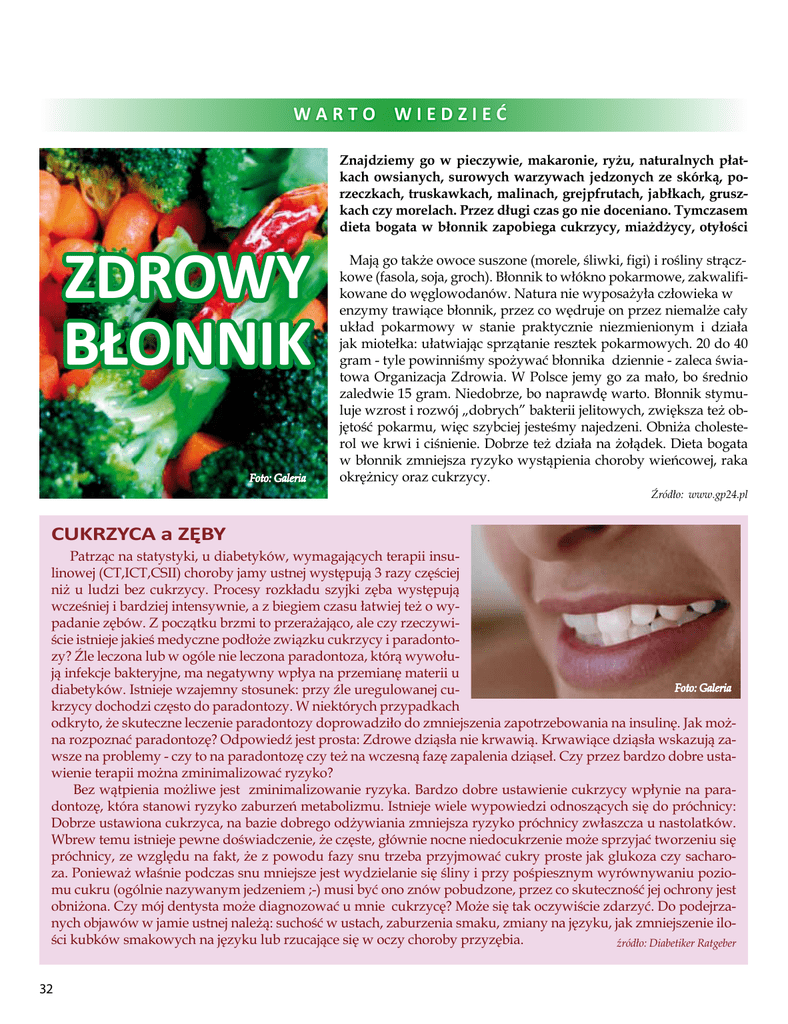 WARTO WIEDZIEĆ ZDROWY BŁONNIK Foto: Galeria Znajdziemy go w pieczywie, makaronie, ryżu, naturalnych płatkach owsianych, surowych warzywach jedzonych ze skórką, porzeczkach, truskawkach, malinach, grejpfrutach, jabłkach, gruszkach czy morelach. Przez długi czas go nie doceniano. Tymczasem dieta bogata w błonnik zapobiega cukrzycy, miażdżycy, otyłości Mają go także owoce suszone (morele, śliwki, figi) i rośliny strączkowe (fasola, soja, groch). Błonnik to włókno pokarmowe, zakwalifikowane do węglowodanów. Natura nie wyposażyła człowieka w enzymy trawiące błonnik, przez co wędruje on przez niemalże cały układ pokarmowy w stanie praktycznie niezmienionym i działa jak miotełka: ułatwiając sprzątanie resztek pokarmowych. 20 do 40 gram - tyle powinniśmy spożywać błonnika dziennie - zaleca światowa Organizacja Zdrowia. W Polsce jemy go za mało, bo średnio zaledwie 15 gram. Niedobrze, bo naprawdę warto. Błonnik stymuluje wzrost i rozwój „dobrych” bakterii jelitowych, zwiększa też objętość pokarmu, więc szybciej jesteśmy najedzeni. Obniża cholesterol we krwi i ciśnienie. Dobrze też działa na żołądek. Dieta bogata w błonnik zmniejsza ryzyko wystąpienia choroby wieńcowej, raka okrężnicy oraz cukrzycy. Źródło: www.gp24.pl CUKRZYCA a ZĘBY Patrząc na statystyki, u diabetyków, wymagających terapii insulinowej (CT,ICT,CSII) choroby jamy ustnej występują 3 razy częściej niż u ludzi bez cukrzycy. Procesy rozkładu szyjki zęba występują wcześniej i bardziej intensywnie, a z biegiem czasu łatwiej też o wypadanie zębów. Z początku brzmi to przerażająco, ale czy rzeczywiście istnieje jakieś medyczne podłoże związku cukrzycy i paradontozy? Źle leczona lub w ogóle nie leczona paradontoza, którą wywołują infekcje bakteryjne, ma negatywny wpłya na przemianę materii u Foto: Galeria diabetyków. Istnieje wzajemny stosunek: przy źle uregulowanej cukrzycy dochodzi często do paradontozy. W niektórych przypadkach odkryto, że skuteczne leczenie paradontozy doprowadziło do zmniejszenia zapotrzebowania na insulinę. Jak można rozpoznać paradontozę? Odpowiedź jest prosta: Zdrowe dziąsła nie krwawią. Krwawiące dziąsła wskazują zawsze na problemy - czy to na paradontozę czy też na wczesną fazę zapalenia dziąseł. Czy przez bardzo dobre ustawienie terapii można zminimalizować ryzyko? Bez wątpienia możliwe jest zminimalizowanie ryzyka. Bardzo dobre ustawienie cukrzycy wpłynie na paradontozę, która stanowi ryzyko zaburzeń metabolizmu. Istnieje wiele wypowiedzi odnoszących się do próchnicy: Dobrze ustawiona cukrzyca, na bazie dobrego odżywiania zmniejsza ryzyko próchnicy zwłaszcza u nastolatków. Wbrew temu istnieje pewne doświadczenie, że częste, głównie nocne niedocukrzenie może sprzyjać tworzeniu się próchnicy, ze względu na fakt, że z powodu fazy snu trzeba przyjmować cukry proste jak glukoza czy sacharoza. Ponieważ właśnie podczas snu mniejsze jest wydzielanie się śliny i przy pośpiesznym wyrównywaniu poziomu cukru (ogólnie nazywanym jedzeniem ;-) musi być ono znów pobudzone, przez co skuteczność jej ochrony jest obniżona. Czy mój dentysta może diagnozować u mnie cukrzycę? Może się tak oczywiście zdarzyć. Do podejrzanych objawów w jamie ustnej należą: suchość w ustach, zaburzenia smaku, zmiany na języku, jak zmniejszenie ilości kubków smakowych na języku lub rzucające się w oczy choroby przyzębia. źródło: Diabetiker Ratgeber 32