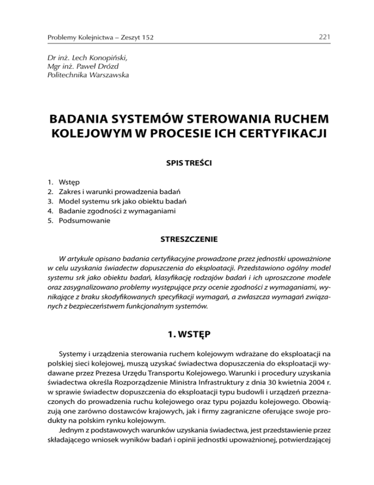Problemy Kolejnictwa – Zeszyt 152 221 Dr inż. Lech Konopiński, Mgr inż. Paweł Drózd Politechnika Warszawska BADANIA SYSTEMÓW STEROWANIA RUCHEM KOLEJOWYM W PROCESIE ICH CERTYFIKACJI SPIS TREŚCI 1. 2. 3. 4. 5. Wstęp Zakres i warunki prowadzenia badań Model systemu srk jako obiektu badań Badanie zgodności z wymaganiami Podsumowanie STRESZCZENIE W artykule opisano badania certyfikacyjne prowadzone przez jednostki upoważnione w celu uzyskania świadectw dopuszczenia do eksploatacji. Przedstawiono ogólny model systemu srk jako obiektu badań, klasyfikację rodzajów badań i ich uproszczone modele oraz zasygnalizowano problemy występujące przy ocenie zgodności z wymaganiami, wynikające z braku skodyfikowanych specyfikacji wymagań, a zwłaszcza wymagań związanych z bezpieczeństwem funkcjonalnym systemów. 1. WSTĘP Systemy i urządzenia sterowania ruchem kolejowym wdrażane do eksploatacji na polskiej sieci kolejowej, muszą uzyskać świadectwa dopuszczenia do eksploatacji wydawane przez Prezesa Urzędu Transportu Kolejowego. Warunki i procedury uzyskania świadectwa określa Rozporządzenie Ministra Infrastruktury z dnia 30 kwietnia 2004 r. w sprawie świadectw dopuszczenia do eksploatacji typu budowli i urządzeń przeznaczonych do prowadzenia ruchu kolejowego oraz typu pojazdu kolejowego. Obowiązują one zarówno dostawców krajowych, jak i firmy zagraniczne oferujące swoje produkty na polskim rynku kolejowym. Jednym z podstawowych warunków uzyskania świadectwa, jest przedstawienie przez składającego wniosek wyników badań i opinii jednostki upoważnionej, potwierdzającej 222 L. Konopiński, P. Drózd zgodność produktu z obowiązującymi wymaganiami związanymi z bezpieczeństwem ruchu kolejowego. W nowoczesnych systemach sterowania ruchem kolejowym powszechnie wykorzystuje się sprzęt komputerowy i jego oprogramowanie. Technika komputerowa umożliwia łatwiejszą realizację funkcji sterujących i diagnostycznych, zwiększa elastyczność w dostosowaniu do nowych wymagań i aplikacji. W technice srk w coraz większym stopniu stosuje się standardowe komputery przemysłowe i systemy operacyjne, co w znacznym stopniu obniża koszty projektowania, wytwarzania i eksploatacji. Pomimo to, systemy srk pozostają nadal systemami złożonymi technicznie zawierającymi komputerowe systemy sterujące z rozbudowaną warstwą transmisji, urządzenia elektryczne i mechaniczne, komputerowe stanowiska obsługi operatorskiej i utrzymania. Poszczególne komponenty systemów srk pracują przy tym w skrajnie zróżnicowanych warunkach środowiskowych. Rosnąca złożoność struktur systemów srk z udziałem sprzętu, oprogramowania i ludzi powoduje nowe zagrożenia, wynikające z nieprzewidzianych interakcji pomiędzy elementami systemu. Badania systemów srk i ich komponentów muszą być zatem przeprowadzone na podstawie modeli o dostatecznie wysokim poziomie abstrakcji, adekwatnie uwzględniającym złożoność i zróżnicowanie struktury obiektu badań. 2. ZAKRES I WARUNKI PROWADZENIA BADAŃ Celem badań urządzeń i systemów srk w procesie dopuszczania do eksploatacji jest ocena zgodności istotnych cech obiektu badań z wymaganiami. Konieczność przeprowadzania oceny zgodności wynika z Ustawy o transporcie kolejowym, która określa tryb i warunki dokonywania ocen, rolę jednostek certyfikujących, kontrolujących i laboratoriów oraz dokumenty zawierające specyfikacje wymagań – Techniczne Specyfikacje Interoperacyjności. Ustawa określa również, w jakich fazach cyklu życia system powinien podlegać ocenie zgodności. Szczegółowy zakres badań koniecznych do uzyskania świadectwa dopuszczenia do eksploatacji określa Rozporządzenie Ministra Infrastruktury z dnia 12 października 2005 roku w sprawie zakresu badań koniecznych do uzyskania świadectw dopuszczenia do eksploatacji typów budowli i urządzeń przeznaczonych do prowadzenia ruchu kolejowego oraz typów pojazdów kolejowych (Dz.U. Nr 212 poz. 1771 z późn. zm.). Zakres ten obejmuje badania zgodności z wymaganiami i warunkami technicznymi określonymi w krajowych specyfikacjach technicznych oraz polskich i europejskich dokumentach normalizacyjnych, których wykaz zawiera Obwieszczenie Prezesa Urzędu Transportu Kolejowego z dnia z dnia 8 sierpnia 2005 r. Zakres badań koniecznych zawiera również szczegółowe wymagania dotyczące prowadzenia badań funkcjonalnych w warunkach nominalnych, przy oddziaływaniu uszkodzeń oraz w warunkach środowiskowych zgodnych z warunkami stosowania. Badania konieczne są ukierunkowane głównie na sprawdzenie bezpieczeństwa działania, Badania systemów sterowania ruchem kolejowym w procesie ich certyfikacji 223 a weryfikacją ich wyników są testy funkcjonalności, niezawodności i bezpieczeństwa przeprowadzane z reguły w rzeczywistych warunkach eksploatacyjnych. 3. MODEL SYSTEMU SRK JAKO OBIEKTU BADAŃ Współczesne komputerowe systemy sterowania ruchem kolejowym są projektowane z reguły jako systemy konfigurowalne, czyli konfigurowane przez dane aplikacji. System jest określany jako konfigurowalny, jeśli ten sam sprzęt komputerowy i jego oprogramowanie podstawowe, stanowiące platformę sprzętowo-programową systemu, mogą być stosowane do budowy różnych funkcjonalnie systemów i ich instalacji. W systemach konfigurowalnych można wyróżnić dwa rodzaje danych determinujących ich funkcjonalność: • dane aplikacji podstawowej, • dane aplikacji specyficznej. Dane aplikacji podstawowej, nazywane często „regułami logiki” lub „zasadami sygnalizacji”, zawierają wymagania funkcjonalne (w tym wymagania związane z bezpieczeństwem), które muszą spełniać systemy srk określonej klasy (w rodzaju systemy stacyjne, liniowe, ssp itp.). Dane aplikacji specyficznej (instalacji systemu na określonym obiekcie) są generowane na podstawie projektu instalacji, uwzględniającego m.in. topografię, warunki ruchowe i otoczenie systemowe. Og