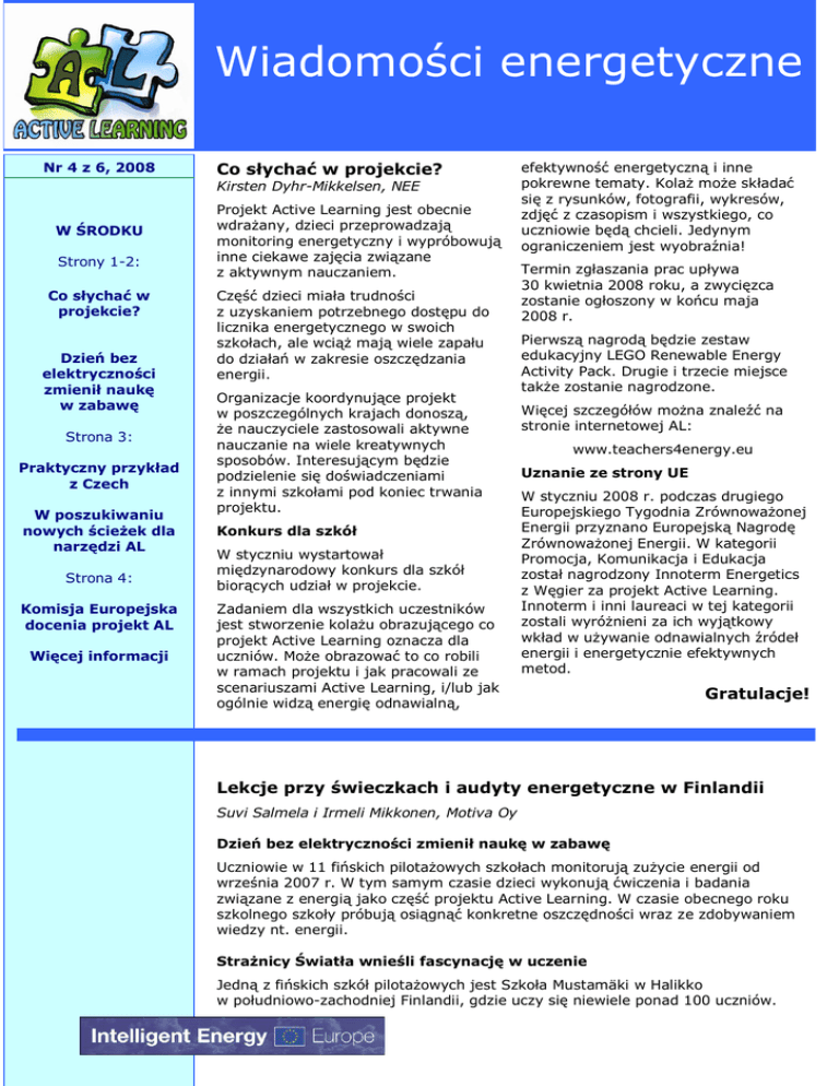 Wiadomości energetyczne Nr 4 z 6, 2008 Co słychać w projekcie? Kirsten Dyhr-Mikkelsen, NEE W ŚRODKU Strony 1-2: Co słychać w projekcie? Dzień bez elektryczności zmienił naukę w zabawę Strona 3: Praktyczny przykład z Czech W poszukiwaniu nowych ścieżek dla narzędzi AL Strona 4: Komisja Europejska docenia projekt AL Więcej informacji Projekt Active Learning jest obecnie wdrażany, dzieci przeprowadzają monitoring energetyczny i wypróbowują inne ciekawe zajęcia związane z aktywnym nauczaniem. Część dzieci miała trudności z uzyskaniem potrzebnego dostępu do licznika energetycznego w swoich szkołach, ale wciąż mają wiele zapału do działań w zakresie oszczędzania energii. Organizacje koordynujące projekt w poszczególnych krajach donoszą, że nauczyciele zastosowali aktywne nauczanie na wiele kreatywnych sposobów. Interesującym będzie podzielenie się doświadczeniami z innymi szkołami pod koniec trwania projektu. Konkurs dla szkół W styczniu wystartował międzynarodowy konkurs dla szkół biorących udział w projekcie. Zadaniem dla wszystkich uczestników jest stworzenie kolażu obrazującego co projekt Active Learning oznacza dla uczniów. Może obrazować to co robili w ramach projektu i jak pracowali ze scenariuszami Active Learning, i/lub jak ogólnie widzą energię odnawialną, efektywność energetyczną i inne pokrewne tematy. Kolaż może składać się z rysunków, fotografii, wykresów, zdjęć z czasopism i wszystkiego, co uczniowie będą chcieli. Jedynym ograniczeniem jest wyobraźnia! Termin zgłaszania prac upływa 30 kwietnia 2008 roku, a zwycięzca zostanie ogłoszony w końcu maja 2008 r. Pierwszą nagrodą będzie zestaw edukacyjny LEGO Renewable Energy Activity Pack. Drugie i trzecie miejsce także zostanie nagrodzone. Więcej szczegółów można znaleźć na stronie internetowej AL: www.teachers4energy.eu Uznanie ze strony UE W styczniu 2008 r. podczas drugiego Europejskiego Tygodnia Zrównoważonej Energii przyznano Europejską Nagrodę Zrównoważonej Energii. W kategorii Promocja, Komunikacja i Edukacja został nagrodzony Innoterm Energetics z Węgier za projekt Active Learning. Innoterm i inni laureaci w tej kategorii zostali wyróżnieni za ich wyjątkowy wkład w używanie odnawialnych źródeł energii i energetycznie efektywnych metod. Gratulacje! Lekcje przy świeczkach i audyty energetyczne w Finlandii Suvi Salmela i Irmeli Mikkonen, Motiva Oy Dzień bez elektryczności zmienił naukę w zabawę Uczniowie w 11 fińskich pilotażowych szkołach monitorują zużycie energii od września 2007 r. W tym samym czasie dzieci wykonują ćwiczenia i badania związane z energią jako część projektu Active Learning. W czasie obecnego roku szkolnego szkoły próbują osiągnąć konkretne oszczędności wraz ze zdobywaniem wiedzy nt. energii. Strażnicy Światła wnieśli fascynację w uczenie Jedną z fińskich szkół pilotażowych jest Szkoła Mustamäki w Halikko w południowo-zachodniej Finlandii, gdzie uczy się niewiele ponad 100 uczniów. Kaisa Katava, nauczycielka drugiej klasy, przekazuje, że w ramach projektu zostało już przeprowadzonych wiele zabawowych zajęć. - Na początku podjęliśmy temat energii podczas dnia tematycznego poświęconego zmianie klimatu. W październiku zorganizowaliśmy tydzień Strażników Światła, w którym dzieci obserwowały oświetlenie i gorliwie gasiły światła. Wyłączanie świateł stało się już dobrym zwyczajem dzieci i stopniowo przejmują go też nauczyciele, przyznaje Kaisa. Nauka przez doświadczenie prowadzi do głębokiego zrozumienia tamatu Na początku grudnia (najciemniejsza pora w roku w Finlandii) spędziliśmy w naszej szkole dzień bez elektryczności. Uczniowie wykonywali prace ręczne i bawili się w świetle świec w klasach. Dzieci były naprawdę podekscytowane, a ten dzień udowodnił nam jak bardzo jesteśmy zależni od elektryczności. Kaisa mówi, że właściwie to bardziej dla nauczycieli było trudniejsze przyzwyczajenie się do nieużywania elektryczności. Wielu z nich zaplanowało puszczanie muzyki z CD czy używanie rzutników. Jednakże dzieci były stanowcze i przypominały nauczycielom o ich omyłkach. aktywnego nauczania w ramach zajęć projektu Active Learning. Na wiosnę dzień bez elektryczności zostanie powtórzony, ale jeszcze „dogłębniej”. Przykładowo zwykły ciepły obiad nie zostanie ugotowany, a my zamiast tego będziemy grilować kiełbaski na dworze. Audyt energetyczny wykrył słabe punkty w wykorzystywaniu energii To co robię ma znaczenie! Szkoła podstawowa Lauttasaari w Helsinkach zebrała już pewne doświadczenia w nauczaniu problemów ekologicznych jako Ekoszkoła. Tematem przewodnim szkolnego programu ekologicznego na 2007 rok było oszczędzanie energii i AL wniósł do nauczania energetycznego dobre rozszerzenie, a także różnorodne ćwiczenia. Szkoła zaczęła pracę entuzjastycznie jako szkoła pilotażowa AL, włączając do projektu wszystkich swoich 500 uczniów. Tiina Kilpeläinen jest nauczycielem odpowiedzialnym za szkolny program ekologiczny i uznanym pedagogiem w sprawach środowiska naturalnego w Wydziale Edukacji Miasta Helsinki. Jej zaangażowanie w AL oraz świadomość energetyczna i środowiskowa zapewniła dodatkową energię dla W celu odkrycia najpilniejszych potrzeb poprawienia efektywności energetycznej w szkolnym budynku przeprowadzono następujące kroki. Budynek szkoły został oddany do użytku w 1954 roku i od tamtego czasu nie przeprowadzono w nim żadnych gruntownych remontów. Uczniowie dokonali przeglądu razem z nauczycielami i szkolnym dozorcą. Dzięki temu odkryli straty energii, np. czujniki ruchu na korytarzu były niewłaściwie ustawione – światła włączone przez całą noc, temperatura w klasach była zbyt wysoka, okna były otwarte cały czas i tworzyły się przeciągi, frontowe drzwi były często zostawione otwarte i wychładzały hall, kserokopiarka by