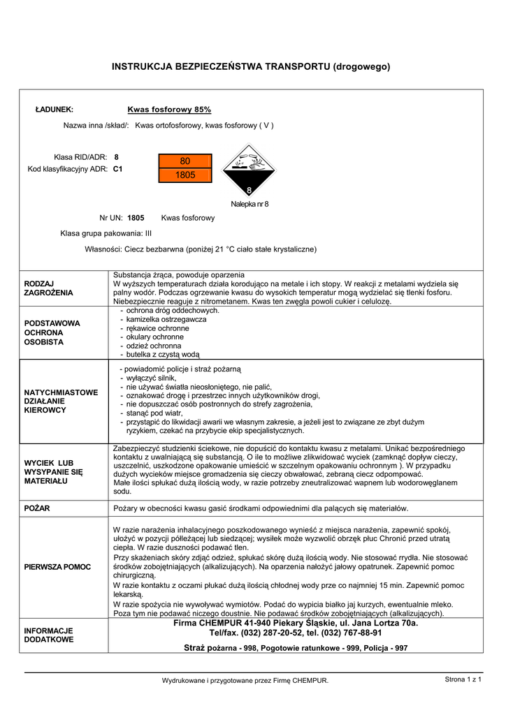 INSTRUKCJA BEZPIECZEŃSTWA TRANSPORTU (drogowego) ŁADUNEK: Kwas fosforowy 85% Nazwa inna /skład/: Kwas ortofosforowy, kwas fosforowy ( V ) Klasa RID/ADR: 8 Kod klasyfikacyjny ADR: C1 80 1805 Nalepka nr 8 Nr UN: 1805 Kwas fosforowy Klasa grupa pakowania: III Własności: Ciecz bezbarwna (poniżej 21 °C ciało stałe krystaliczne) RODZAJ ZAGROŻENIA PODSTAWOWA OCHRONA OSOBISTA NATYCHMIASTOWE DZIAŁANIE KIEROWCY Substancja żrąca, powoduje oparzenia W wyższych temperaturach działa korodująco na metale i ich stopy. W reakcji z metalami wydziela się palny wodór. Podczas ogrzewanie kwasu do wysokich temperatur mogą wydzielać się tlenki fosforu. Niebezpiecznie reaguje z nitrometanem. Kwas ten zwęgla powoli cukier i celulozę. - ochrona dróg oddechowych. - kamizelka ostrzegawcza - rękawice ochronne - okulary ochronne - odzież ochronna - butelka z czystą wodą - powiadomić policje i straż pożarną - wyłączyć silnik, - nie używać światła nieosłoniętego, nie palić, - oznakować drogę i przestrzec innych użytkowników drogi, - nie dopuszczać osób postronnych do strefy zagrożenia, - stanąć pod wiatr, - przystąpić do likwidacji awarii we własnym zakresie, a jeżeli jest to związane ze zbyt dużym ryzykiem, czekać na przybycie ekip specjalistycznych. WYCIEK LUB WYSYPANIE SIĘ MATERIAŁU Zabezpieczyć studzienki ściekowe, nie dopuścić do kontaktu kwasu z metalami. Unikać bezpośredniego kontaktu z uwalniającą się substancją. O ile to możliwe zlikwidować wyciek (zamknąć dopływ cieczy, uszczelnić, uszkodzone opakowanie umieścić w szczelnym opakowaniu ochronnym ). W przypadku dużych wycieków miejsce gromadzenia się cieczy obwałować, zebraną ciecz odpompować. Małe ilości spłukać dużą ilością wody, w razie potrzeby zneutralizować wapnem lub wodorowęglanem sodu. POŻAR Pożary w obecności kwasu gasić środkami odpowiednimi dla palących się materiałów. PIERWSZA POMOC INFORMACJE DODATKOWE W razie narażenia inhalacyjnego poszkodowanego wynieść z miejsca narażenia, zapewnić spokój, ułożyć w pozycji półleżącej lub siedzącej; wysiłek może wyzwolić obrzęk płuc Chronić przed utratą ciepła. W razie duszności podawać tlen. Przy skażeniach skóry zdjąć odzież, spłukać skórę dużą ilością wody. Nie stosować rrydła. Nie stosować środków zobojętniających (alkalizujących). Na oparzenia nałożyć jałowy opatrunek. Zapewnić pomoc chirurgiczną. W razie kontaktu z oczami płukać dużą ilością chłodnej wody prze co najmniej 15 min. Zapewnić pomoc lekarską. W razie spożycia nie wywoływać wymiotów. Podać do wypicia białko jaj kurzych, ewentualnie mleko. Poza tym nie podawać niczego doustnie. Nie podawać środków zobojętniających (alkalizujących). Firma CHEMPUR 41-940 Piekary Śląskie, ul. Jana Lortza 70a. Tel/fax. (032) 287-20-52, tel. (032) 767-88-91 Straż pożarna - 998, Pogotowie ratunkowe - 999, Policja - 997 Wydrukowane i przygotowane przez Firmę CHEMPUR. Strona 1 z 1