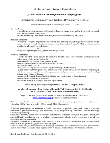 Międzynarodowy Konkurs Fotograficzny „Dzieła mistrzów inspiracją współczesnej fotografii” organizator: Dzielnicowy Dom Kultury „Bronowice” w Lublinie konkurs adresowany jest do młodzieży w wieku 12 – 25 lat Cele konkursu: - pogłębienie wiedzy na temat twórczości wybranego artysty oraz analiza jego dzieła w sposób zindywidualizowany i kreatywny; - rozwijanie kultury i wrażliwości wizualnej oraz aktywności twórczej młodzieży. Realizacja zadania: - wykonanie fotografii inspirowanej dziełem mistrza uznanego za wybitnego przedstawiciela swojej epoki w dziedzinie sztuk wizualnych (malarstwo, grafika, rzeźba, fotografia, film) z wykorzystaniem współczesnych modeli i przedmiotów; lub - fotografia wybranego dzieła i jej obróbka komputerowa; Warunki konkursu: - każdy uczestnik może zgłosić do konkursu dowolną ilość prac wcześniej niepublikowanych i niezgłaszanych do innych konkursów; - praca musi być wykonana przez jednego autora; - prace zbiorowe nie będą zakwalifikowane do konkursu; - format nie mniejszy niż A5; - fotografie prosimy przesłać w formie wydrukowanej i elektronicznej - prace należy czytelnie opisać: imię i nazwisko, wiek autora, adres, telefon placówki patronującej, imię i nazwisko nauczyciela prowadzącego, adres e- mail , nazwisko twórcy oraz tytuł dzieła według którego praca została wykonana; - prosimy o dołączenie fotografii dzieła, którego było inspiracją do wykonania pracy; - prosimy o dołączenie karty zgłoszenia - nadesłane prace przechodzą na własność organizatora. Prace należy dostarczyć do organizatora : do dnia 7 listopada 2016 r. na adres : Dzielnicowy Dom Kultury „Bronowice” ul. Krańcowa 106, 20 – 320 Lublin tel. 81 7441638, e- mail : sekretariat @ddkbronowice.pl Wyniki konkursu zamieszczone zostaną na stronie internetowej DDK „Bronowice“ www.ddkbronowice.pl; w zakładce Konkursy/Wyniki Podsumowanie konkursu, wręczenie nagród oraz wernisaż wystawy pokonkursowej odbędzie się 10 grudnia 2016 r. ( sobota ), godz. 12.00, w salach DDK „Bronowice”. W ramach przystąpienia do konkursu uczestnik oświadcza, że posiada zgodę osób, których wizerunek utrwalono na pracy konkursowej i jest uprawniony do wykorzystania tego wizerunku , opublikowania go i publicznej prezentacji. Organizator zastrzega sobie prawo wykonania dokumentacji w formie katalogów, fotografii i biuletynów oraz publikacji nadesłanych prac w mediach internetowych, telewizyjnych, prasowych i innych bez uiszczania autorom honorariów. Fotografie zgłaszane na konkurs nie mogą naruszać prawa, w tym w szczególności dóbr osobistych osób trzecich, a także ogólnie przyjętych norm obyczajowych. Udział w konkursie jest równoznaczny z akceptacją regulaminu oraz wyrażeniem zgody na przetwarzanie danych osobowych uczestnika przez organizatorów w zakresie niezbędnym do prowadzenia konkursu. Koordynator konkursu : Ewa Rejmak, tel. 81 4440016 KARTA ZGŁOSZENIA Międzynarodowy Konkurs Fotograficzny „Dzieła mistrzów inspiracją współczesnej fotografii” organizator: Dzielnicowy Dom Kultury „Bronowice” w Lublinie grudzień 2016 Prosimy wypełnić drukowanymi literami Imię i nazwisko autora wiek ……………………………………………………………………………… ………………………………………………………………………………………………… Nazwa i adres placówki, szkoły ……………………………………………………………………… ……………………………………………………………………… ……………………………………………………………………… ……………………………………………………………………… Imię i nazwisko nauczyciela, instruktora e- mail ………………………………………………………….. ………………………………………………………………………………………………. tytuł pracy …………………………………………………………………………………………… ……………………………………………………………………………………………. ……………………………………………………………………………………………. data ……………………. podpis nauczyciela/ instruktora……………………. KARTA ZGŁOSZENIA ZGŁOSZENIE INDYWIDUALNE II Międzynarodowy Konkurs Fotograficzny „Dzieła mistrzów inspiracją współczesnej fotografii” organizator : Dzielnicowy Dom Kultury „Bronowice” w Lublinie grudzień 2016 Prosimy wypełnić drukowanymi literami Imię i nazwisko autora wiek ……………………………………………………………………………… ………………………………………………………………………………………………… Adres, telefon ………………………………………………………………………………… ………………………………………………………………………………… ………………………………………………………………………………… ………………………………………………………………………………… e- mail ………………………………………………………………………………………………. tytuł pracy …………………………………………………………………………………………… ……………………………………………………………………………………………. ……………………………………………………………………………………………. data ……………………. podpis autora / rodzica………………………..
