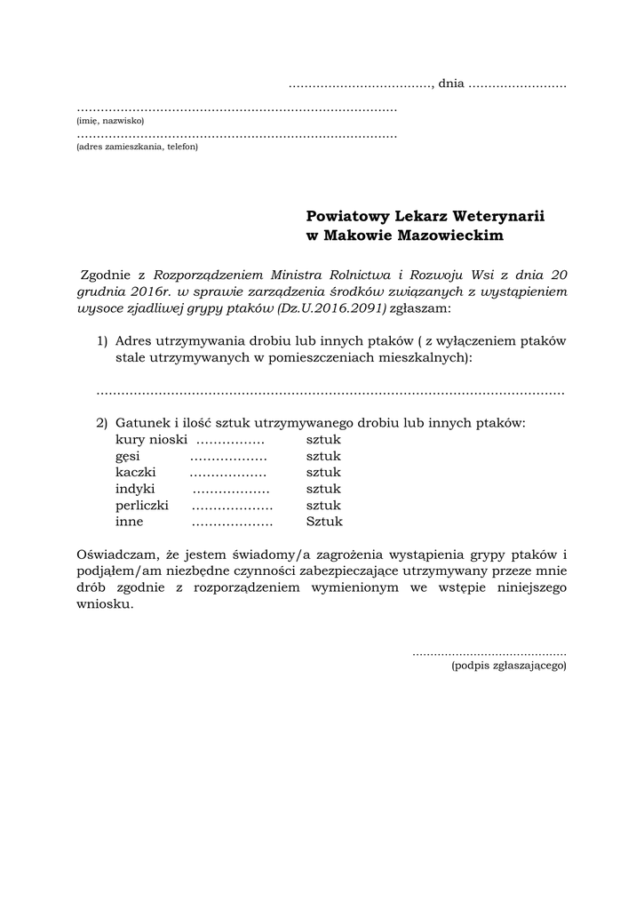 ………………………………, dnia ……………………. ……………………………………………………………………… (imię, nazwisko) ……………………………………………………………………… (adres zamieszkania, telefon) Powiatowy Lekarz Weterynarii w Makowie Mazowieckim Zgodnie z Rozporządzeniem Ministra Rolnictwa i Rozwoju Wsi z dnia 20 grudnia 2016r. w sprawie zarządzenia środków związanych z wystąpieniem wysoce zjadliwej grypy ptaków (Dz.U.2016.2091) zgłaszam: 1) Adres utrzymywania drobiu lub innych ptaków ( z wyłączeniem ptaków stale utrzymywanych w pomieszczeniach mieszkalnych): ................................................................................................................. 2) Gatunek i ilość sztuk utrzymywanego drobiu lub innych ptaków: kury nioski ……………. sztuk gęsi ……………… sztuk kaczki ……………… sztuk indyki ……………… sztuk perliczki ………………. sztuk inne ………………. Sztuk Oświadczam, że jestem świadomy/a zagrożenia wystąpienia grypy ptaków i podjąłem/am niezbędne czynności zabezpieczające utrzymywany przeze mnie drób zgodnie z rozporządzeniem wymienionym we wstępie niniejszego wniosku. ……………………………………. (podpis zgłaszającego)
