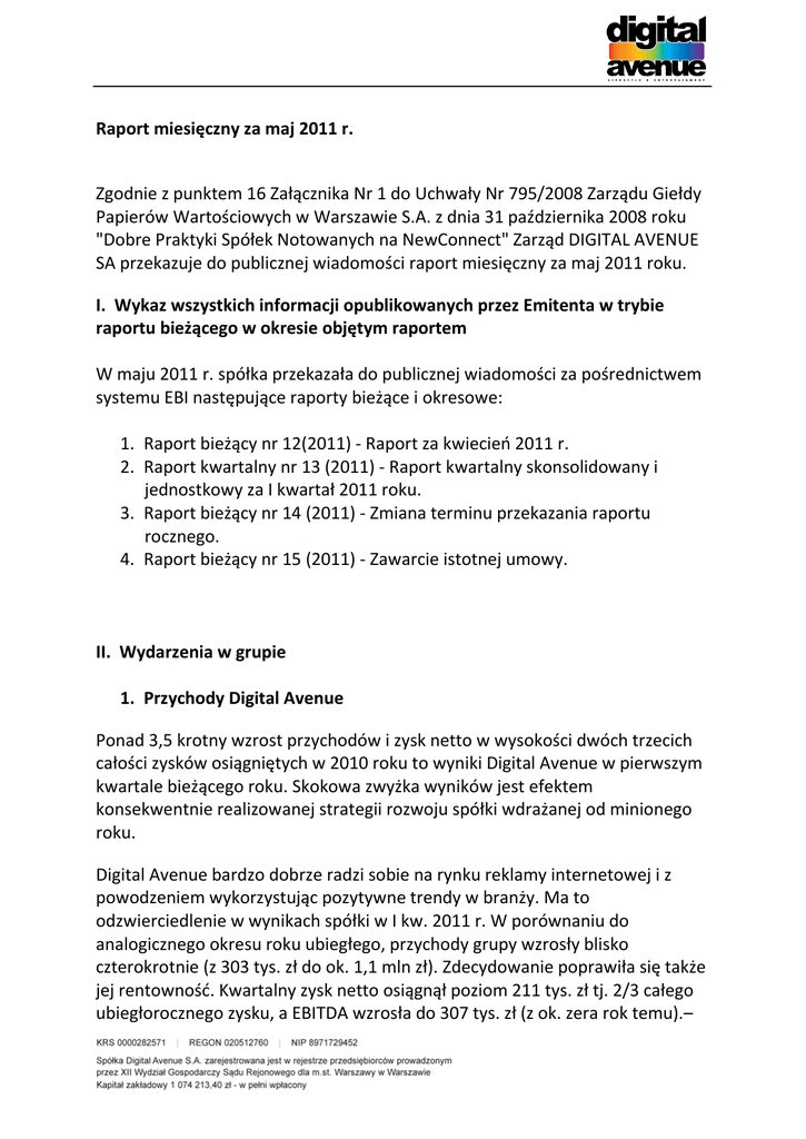 Raport miesięczny za maj 2011 r. Zgodnie z punktem 16 Załącznika Nr 1 do Uchwały Nr 795/2008 Zarządu Giełdy Papierów Wartościowych w Warszawie S.A. z dnia 31 października 2008 roku "Dobre Praktyki Spółek Notowanych na NewConnect" Zarząd DIGITAL AVENUE SA przekazuje do publicznej wiadomości raport miesięczny za maj 2011 roku. I. Wykaz wszystkich informacji opublikowanych przez Emitenta w trybie raportu bieżącego w okresie objętym raportem W maju 2011 r. spółka przekazała do publicznej wiadomości za pośrednictwem systemu EBI następujące raporty bieżące i okresowe: 1. Raport bieżący nr 12(2011) - Raport za kwiecieo 2011 r. 2. Raport kwartalny nr 13 (2011) - Raport kwartalny skonsolidowany i jednostkowy za I kwartał 2011 roku. 3. Raport bieżący nr 14 (2011) - Zmiana terminu przekazania raportu rocznego. 4. Raport bieżący nr 15 (2011) - Zawarcie istotnej umowy. II. Wydarzenia w grupie 1. Przychody Digital Avenue Ponad 3,5 krotny wzrost przychodów i zysk netto w wysokości dwóch trzecich całości zysków osiągniętych w 2010 roku to wyniki Digital Avenue w pierwszym kwartale bieżącego roku. Skokowa zwyżka wyników jest efektem konsekwentnie realizowanej strategii rozwoju spółki wdrażanej od minionego roku. Digital Avenue bardzo dobrze radzi sobie na rynku reklamy internetowej i z powodzeniem wykorzystując pozytywne trendy w branży. Ma to odzwierciedlenie w wynikach spółki w I kw. 2011 r. W porównaniu do analogicznego okresu roku ubiegłego, przychody grupy wzrosły blisko czterokrotnie (z 303 tys. zł do ok. 1,1 mln zł). Zdecydowanie poprawiła się także jej rentownośd. Kwartalny zysk netto osiągnął poziom 211 tys. zł tj. 2/3 całego ubiegłorocznego zysku, a EBITDA wzrosła do 307 tys. zł (z ok. zera rok temu).– Według raportu The Boston Consulting Group, wartośd polskiego rynku internetowego sięgnęła niespełna 37 mld zł czyli 2,7% PKB. Autorzy opracowania prognozują, że wartośd polskiego internetu podwoi się w kilka najbliższych lat. Roczny wzrost będzie dwukrotnie większy niż wzrost PKB i sięgnie 15%. Digital Avenue już wykorzystuje te trendy i zamierza wzrastad szybciej niż rynek- zapowiada Piotr Wąsowski, prezes zarządu Digital Avenue. Narastające wyniki finansowe za cztery ostatnie kwartały (Q2 2010 – Q1 2001) obejmujące już w całości wyniki skonsolidowane całej Grupy Digital Avenue powiększonej o Styl.Media i kolejne akwizycje wynoszą ok. 5 mln zł przychodów ze sprzedaży i 1 mln zł zysku EBITDA – „ten rezultat pokazuje skok jakościowy dokonany w ostatnim czasie oraz potencjał rozwoju jaki nadal posiada Spółka” – dodaje Piotr Wąsowski – prezes zarządu Digital Avenue. Poprawa wyników finansowych grupy jest efektem trzech tendencji: - poprawy rentowności i jakości działania portali internetowych znajdujących się w portfolio Digital Avenue, a zwłaszcza skoku jakościowego jakiego dokonał serwis Fotosik.pl i zarządzająca tym portalem spółka Medousa. - akwizycji przedsięwzięd komplementarnych do już prowadzonej działalności. W wynikach pierwszego kwartału br. zostały ujęte wyniki przejętego w II kw. 2010 r. portalu Styl.fm i spółki Styl.Media. Nie były one zawarte w wynikach analogicznego okresu roku poprzedniego. - wzrostu rynku reklamy internetowej, który jest najszybciej rosnącym segmentem rynku reklamowego w Polsce. Według specjalistów z domu mediowego MPG, przy wzroście całego rynku reklamy w Polsce o ok. 6,9%, rynek reklamy internetowej wzrósł o ponad 17%. Z kolei tempo wzrostu Digital Avenue jest kilkukrotnie wyższe niż całego rynku reklamy internetowej. 2. Dwa nowe serwisy w Grupie Styl.fm Zarząd Spółki Digital Avenue S.A., z siedzibą w Warszawie informuje o zawarciu z firmą MCS Studios umowy, której przedmiotem jest zarządzanie przez Emitenta powierzchnią reklamową portali Tik-tak.pl i Naobcasach.pl. W konsekwencji przedmiotowej umowy do grupy Styl.fm zarządzanej przez Digital Avenue S.A. wchodzą dwa kolejne serwisy –portal parentingowy tik-tak.pl i magazyn dla kobiet naobcasach.pl. Tik-tak.pl i na obcasach.pl, które dołączyły do grupy Styl.fm, rozwiną i poszerzą portfolio tematyczne grupy oraz umocnią pozycję Digital Avenue w segmencie Styl życia. Współpraca obejmuje zarządzanie powierzchnią reklamową portali oraz rozwój nowych, wspólnych projektów internetowych. Tik-tak.pl - pierwszy serwis, który dołączył do grupy to strona dla rodziców zawierająca cenne porady o tematyce parentingowej, w serwisie dostępne jest bardzo aktywne forum o ciąży, antykoncepcji oraz macierzyostwie. Drugi z portali, który zasili grupę Styl.fm to magazyn dla kobiet naobcasach.pl bogate źródło informacji o urodzie, modzie i dzieciach. Serwis posiada aktywne forum o tematyce parentingowej. Na bieżąco informuje o nowościach kosmetycznych, inicjuje dyskusje na ważne kobiece tematy, promuje ciekawe wydarzenia. Głównym celem portalu jest przekazywanie profesjonalnych porad oraz uzupełnianie i rozwijanie wiedzy kobiet. Portale są idealnym miejscem dla kobiet przedsiębiorczych, aktywnych, odważnych, inteligentnych i ambitnych, przyszłych rodziców. Służą jako platforma do wymiany wiedzy, doświadczeo oraz nawiązywania kontaktów. 3. Prawie 900 tys. użytkowników Styl.fm W marcu 2011, zarządzany przez Digital Avenue, magazyn Styl.fm odwiedziło blisko 900 000 realnych użytkowników, którzy wygenerowali ponad 17 milionów odsłon, co daje ok. 5% zasięgu w polskim internecie. Źródło: raport Megapanel PBI/Gemius za marzec 2011, kategoria Styl Życia. 4. Ponad 2 mln użytkowników Fotosik.pl Fotosik.pl zarządzany przez spółkę Medousa w publikowanym przez Megapanel PBI/Gemius raporcie za marzec 2011 osiągnął w kategorii Kultura i Rozrywka następujące wyniki: ponad 2 miliony realnych użytkowników, blisko 24 milionów odsłon, co daje 11% zasięg w polskim internecie. III. Otoczenie rynkowe, trendy Oko