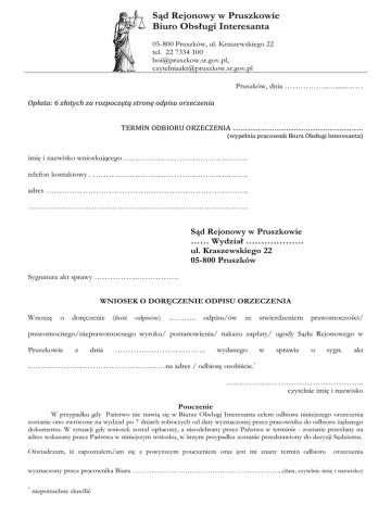 Sąd Rejonowy w Pruszkowie Biuro Obsługi Interesanta 05-800 Pruszków, ul. Kraszewskiego 22 tel. 22 7334 100 [email protected], [email protected] Pruszków, dnia ……………..….......…… Opłata: 6 złotych za rozpoczętą stronę odpisu orzeczenia TERMIN ODBIORU ORZECZENIA ………………………………………………………… (wypełnia pracownik Biura Obsługi Interesanta) imię i nazwisko wnioskującego………………………………………… telefon kontaktowy . ……………………………………………..……. adres …………………………………………………………….…….. ………………………………………………………………………… Sąd Rejonowy w Pruszkowie …… Wydział ………………. ul. Kraszewskiego 22 05-800 Pruszków Sygnatura akt sprawy ……………..……………. WNIOSEK O DORĘCZENIE ODPISU ORZECZENIA Wnoszę o doręczenie (ilość odpisów) ……….. odpisu/ów ze stwierdzeniem prawomocności/ prawomocnego/nieprawomocnego wyroku/ postanowienia/ nakazu zapłaty/ ugody Sądu Rejonowego w Pruszkowie z dnia …………………………….. wydanego w sprawie o sygn. akt .…………………………………….………na adres / odbiorę osobiście.* …………………………………………….. czytelnie imię i nazwisko Pouczenie W przypadku gdy Państwo nie stawią się w Biurze Obsługi Interesanta celem odbioru niniejszego orzeczenia zostanie ono zwrócone na wydział po 7 dniach roboczych od daty wyznaczonej przez pracownika do odbioru żądanego dokumentu. W sytuacji gdy wniosek został opłacony, a nieodebrany przez Państwa w terminie - zostanie przesłany na adres wskazany przez Państwa w niniejszym wniosku, w innym przypadku zostanie przedstawiony do decyzji Sędziemu. Oświadczam, iż zapoznałem/am się z powyższym pouczeniem oraz jest mi znany termin odbioru orzeczenia wyznaczony przez pracownika Biura ……………………..……………..………………...(data, czytelnie imię i nazwisko) * niepotrzebne skreślić Wypełnia pracownik Biura Obsługi Interesanta: Skasowano znaki opłaty sądowej w kwocie……..………………... …………………………………. Data, imię i nazwisko/pieczątka imienna Dnia………..……. wydano …………odpisy prawomocnego postanowienia/wyrok Potwierdza się tożsamość ………………………………………………………… seria i nr dow. osobistego/legitymacji …………………………………………….. wydanego przez …………………………………………………………………... …………………………………………………………………………………….. (data i podpis pracownika) Otrzymałem(am) (proszę wpisać ilość)……..….. odpisów orzeczenia zgodnie z moim wnioskiem. ………………………………………………………………………………………….…………………… (data, czytelnie imię i nazwisko wnioskującego)
