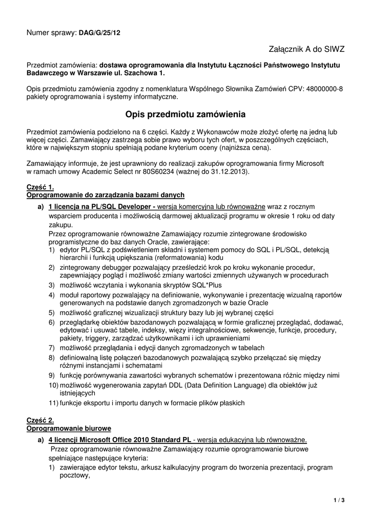 Numer sprawy: DAG/G/25/12 Załącznik A do SIWZ Przedmiot zamówienia: dostawa oprogramowania dla Instytutu Łączności Państwowego Instytutu Badawczego w Warszawie ul. Szachowa 1. Opis przedmiotu zamówienia zgodny z nomenklatura Wspólnego Słownika Zamówień CPV: 48000000-8 pakiety oprogramowania i systemy informatyczne. Opis przedmiotu zamówienia Przedmiot zamówienia podzielono na 6 części. Każdy z Wykonawców może złożyć ofertę na jedną lub więcej części. Zamawiający zastrzega sobie prawo wyboru tych ofert, w poszczególnych częściach, które w największym stopniu spełniają podane kryterium oceny (najniższa cena). Zamawiający informuje, że jest uprawniony do realizacji zakupów oprogramowania firmy Microsoft w ramach umowy Academic Select nr 80S60234 (ważnej do 31.12.2013). Część 1. Oprogramowanie do zarządzania bazami danych a) 1 licencja na PL/SQL Developer - wersja komercyjna lub równoważne wraz z rocznym wsparciem producenta i możliwością darmowej aktualizacji programu w okresie 1 roku od daty zakupu. Przez oprogramowanie równoważne Zamawiający rozumie zintegrowane środowisko programistyczne do baz danych Oracle, zawierające: 1) edytor PL/SQL z podświetleniem składni i systemem pomocy do SQL i PL/SQL, detekcją hierarchii i funkcją upiększania (reformatowania) kodu 2) zintegrowany debugger pozwalający prześledzić krok po kroku wykonanie procedur, zapewniający pogląd i możliwość zmiany wartości zmiennych używanych w procedurach 3) możliwość wczytania i wykonania skryptów SQL*Plus 4) moduł raportowy pozwalający na definiowanie, wykonywanie i prezentację wizualną raportów generowanych na podstawie danych zgromadzonych w bazie Oracle 5) możliwość graficznej wizualizacji struktury bazy lub jej wybranej części 6) przeglądarkę obiektów bazodanowych pozwalającą w formie graficznej przeglądać, dodawać, edytować i usuwać tabele, indeksy, więzy integralnościowe, sekwencje, funkcje, procedury, pakiety, triggery, zarządzać użytkownikami i ich uprawnieniami 7) możliwość przeglądania i edycji danych zgromadzonych w tabelach 8) definiowalną listę połączeń bazodanowych pozwalającą szybko przełączać się między różnymi instancjami i schematami 9) funkcję porównywania zawartości wybranych schematów i prezentowana różnic między nimi 10) możliwość wygenerowania zapytań DDL (Data Definition Language) dla obiektów już istniejących 11) funkcje eksportu i importu danych w formacie plików płaskich Część 2. Oprogramowanie biurowe a) 4 licencji Microsoft Office 2010 Standard PL - wersja edukacyjna lub równoważne. Przez oprogramowanie równoważne Zamawiający rozumie oprogramowanie biurowe spełniające następujące kryteria: 1) zawierające edytor tekstu, arkusz kalkulacyjny program do tworzenia prezentacji, program pocztowy, 1/3 2) poszczególne komponenty oprogramowania muszą zapewniać pełną kompatybilność przy wymianie dokumentów z posiadanym przez zamawiającego oprogramowaniem MS Office 2007/2010, w tym obsługę makr zagnieżdżonych w dokumentach, 3) arkusz kalkulacyjny ma zapewniać obsługę arkuszy stworzonych w MS Office 2007 zawierających tabele przestawne pobierające dane z zewnętrznej bazy danych MS SQL Server 2005/2008 z użyciem uwierzytelnienia opartego o Active Directory, 4) klient pocztowy będący częścią pakietu ma zapewniać pełną integrację z posiadanym przez Zamawiającego MS Exchange 2007, 5) interfejs użytkownika w języku polskim. b) 3 licencje Microsoft Office 2010 Professional PL - wersja edukacyjna lub równoważne. Przez oprogramowanie równoważne Zamawiający rozumie oprogramowanie biurowe spełniające wszystkie kryteria wymienione w podpunkcie a) i zawierające ponadto relacyjną bazę danych. Część 3. Środowiska programistyczne a) 2 licencje C++Builder XE2 Professional - wersja komercyjna lub równoważne. Przez oprogramowanie równoważne Zamawiający rozumie oprogramowanie graficzne spełniające następujące kryteria: 1) zapewnia możliwośc wykorzystania platformy FireMonkey; 2) zawiera bibliotekę VCL; 3) posiada komponenty i moduły bazodanowe; 4) umożliwia tworzenie interfejsów w wysokiej jakości HD oraz 3D wykorzystujących możliwości procesora kart graficznych (GPU), skalowalne grafiki wektorowe, programowalne animacje oraz zaawansowane efekty obróbki obrazów. 5) ma możliwość pracy w chmurze z danymi na różnych platformach, w różnej architekturze, stworzonych w różnych językach i działających na wielu urządzeniach. b) 1 licencja Microsoft Visual Studio Professional with MSDN (subskrypcja) - wersja edukacyjna lub równoważne. Przez oprogramowanie równoważne Zamawiający rozumie zintegrowane środowisko programistyczne spełniające następujące kryteria: 1) umożliwia tworzenie rozwiązań w językach C++ oraz C# i .NET, dla systemów z rodziny Windows (od Windows XP po Windows 8 oraz Windows Server). 2) posiada kompilatory umożliwiające generowanie kodu wykonywalnego zarówno dla systemów 64 jak i 32 bitowych. 3) ma możliwość bezpośredniego wykorzystania w tworzonych rozwiązaniach zewnętrznych bibliotek w formacie Microsoft'u (Microsoft Library Format). 4) zawiera licencje na wszystkie systemy z rodziny Windows (począwszy od Windows XP) umożliwiające testowanie tworzonych rozwiązań w środowisku wirtualnym oraz na fizycznych maszynach. Część 4. Aktualizacja systemu operacyjnego MS Windows XP a) aktualizacja 9 szt. (posiadanych) licencji systemu operacyjnego Microsoft Windows XP Professional do wersji Windows 7 Professional (64-bit) - wersja edukacyjna Część 5. Narzędzia do zarządzania projektem a) 2 licencje Microsoft Project 2010 Professional PL - wersja edukacyjna lub równoważne. Przez oprogramowanie równoważne Zamawiający rozumie zintegrowane środowisko programistyczne spełniające następujące kryteria: 2/3 1) zapewniające narzędzia do graficznego obrazowania 