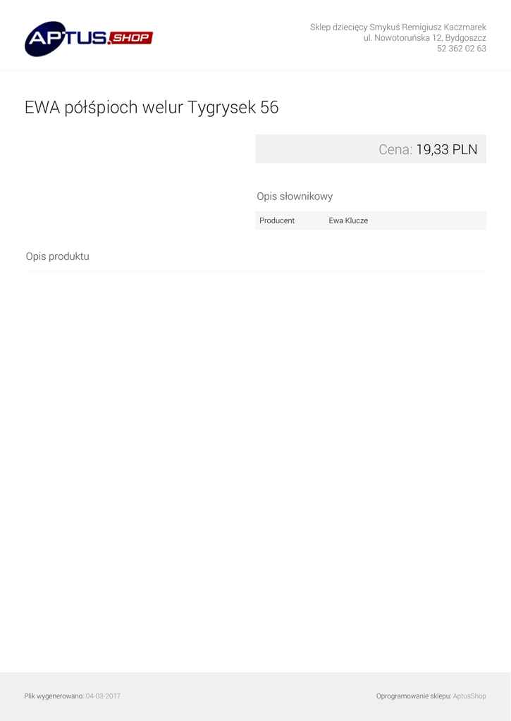 Sklep dziecięcy Smykuś Remigiusz Kaczmarek ul. Nowotoruńska 12, Bydgoszcz 52 362 02 63 EWA półśpioch welur Tygrysek 56 Cena: 19,33 PLN Opis słownikowy Producent Ewa Klucze Opis produktu Plik wygenerowano: 04-03-2017 Powered by TCPDF (www.tcpdf.org) Oprogramowanie sklepu: AptusShop