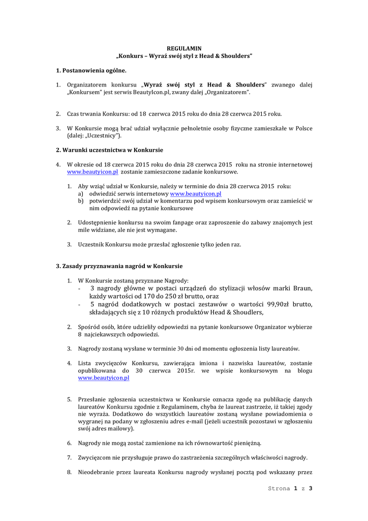 REGULAMIN „Konkurs – Wyraź swój styl z Head & Shoulders” 1. Postanowienia ogólne. 1. Organizatorem konkursu „Wyraź swój styl z Head & Shoulders” zwanego dalej „Konkursem” jest serwis BeautyIcon.pl, zwany dalej „Organizatorem”. 2. Czas trwania Konkursu: od 18 czerwca 2015 roku do dnia 28 czerwca 2015 roku. 3. W Konkursie mogą brać udział wyłącznie pełnoletnie osoby fizyczne zamieszkałe w Polsce (dalej: „Uczestnicy”). 2. Warunki uczestnictwa w Konkursie 4. W okresie od 18 czerwca 2015 roku do dnia 28 czerwca 2015 roku na stronie internetowej www.beautyicon.pl zostanie zamieszczone zadanie konkursowe. 1. Aby wziąć udział w Konkursie, należy w terminie do dnia 28 czerwca 2015 roku: a) odwiedzić serwis internetowy www.beautyicon.pl b) potwierdzić swój udział w komentarzu pod wpisem konkursowym oraz zamieścić w nim odpowiedź na pytanie konkursowe 2. Udostępnienie konkursu na swoim fanpage oraz zaproszenie do zabawy znajomych jest mile widziane, ale nie jest wymagane. 3. Uczestnik Konkursu może przesłać zgłoszenie tylko jeden raz. 3. Zasady przyznawania nagród w Konkursie 1. W Konkursie zostaną przyznane Nagrody: 3 nagrody główne w postaci urządzeń do stylizacji włosów marki Braun, 2. 3. każdy wartości od 170 do 250 zł brutto, oraz 5 nagród dodatkowych w postaci zestawów o wartości 99,90zł brutto, składających się z 10 różnych produktów Head & Shoudlers, Spośród osób, które udzieliły odpowiedzi na pytanie konkursowe Organizator wybierze 8 najciekawszych odpowiedzi. Nagrody zostaną wysłane w terminie 30 dni od momentu ogłoszenia listy laureatów. 4. 5. 6. Lista zwycięzców Konkursu, zawierająca imiona i nazwiska laureatów, zostanie opublikowana do 30 czerwca 2015r. we wpisie konkursowym na blogu www.beautyicon.pl Przesłanie zgłoszenia uczestnictwa w Konkursie oznacza zgodę na publikację danych laureatów Konkursu zgodnie z Regulaminem, chyba że laureat zastrzeże, iż takiej zgody nie wyraża. Dodatkowo do wszystkich laureatów zostaną wysłane powiadomienia o wygranej na podany w zgłoszeniu adres e-‐mail (jeżeli uczestnik pozostawi w zgłoszeniu swój adres mailowy). Nagrody nie mogą zostać zamienione na ich równowartość pieniężną. 7. 8. Zwycięzcom nie przysługuje prawo do zastrzeżenia szczególnych właściwości nagrody. Nieodebranie przez laureata Konkursu nagrody wysłanej pocztą pod wskazany przez Strona 1 z 3 niego adres, powoduje wygaśnięcie prawa do tej nagrody i skutkuje wygaśnięciem wszelkich roszczeń z tego tytułu wobec Organizatora. Organizator nie jest zobowiązany do przekazania nagrody innemu Uczestnikowi. 4. Tryb składania i rozpatrywania reklamacji 1. Reklamacje związane z uczestnictwem w Konkursie mogą być zgłaszane najpóźniej w terminie 14 dni od ogłoszenia zwycięzcy Konkursu, na adres mailowy Organizacota: [email protected], z dopiskiem „Konkurs – Wyraź swój styl”. 2. Reklamacja otrzymana przez Organizatora po terminie nie zostanie rozpatrzona. O zachowaniu terminu do wniesienia reklamacji decyduje data doręczenia reklamacji Organizatorowi. 3. Rozpatrzeniu podlegają wyłącznie reklamacje zgłoszone w formie mailowej. 4. Postępowanie reklamacyjne trwa 30 dni roboczych, włączając w to zawiadomienie Uczestnika Konkursu o wyniku reklamacji listem poleconym wysłanym w powyższym terminie (liczy się data nadania listu). Po wyczerpaniu postępowania reklamacyjnego Uczestnikowi przysługuje prawo do dochodzenia nieuwzględnionych roszczeń w sądzie. 5. Postanowienia końcowe 1. Regulamin Konkursu jest dostępny na blogu Organizatora w okresie trwania Konkursu. 2. Udział Uczestnika w Konkursie oznacza akceptację zasad Konkursu zawartych w Regulaminie. 3. Udział w Konkursie jest jednoznaczny z udzieleniem prawa Organizatorowi oraz właścicielowi marki Head & Shoulders do nieodpłatnego wykorzystywania przesłanej odpowiedzi. 4. Organizator nie odpowiada za jakąkolwiek szkodę majątkową lub niemajątkową, poniesioną przez Uczestnika w wyniku jego udziału w Konkursie. 5. Organizator nie odpowiada za opóźnienia w doręczeniu wygranych zawinione przez Pocztę Polską. 6. Dane osobowe Uczestników przetwarzane będą przy zachowaniu zasad określonych w ustawie z dnia 29 sierpnia 1997 roku o ochronie danych osobowych (Dz.U. z 2002 roku, Nr 101, poz. 926 z późn. zm.) oraz w ustawie z dnia 18 lipca 2002 roku o świadczeniu usług drogą elektroniczną (Dz.U. Nr. 144, poz. 1204 ze zm.). Administratorem danych jest Dax Cosmetics Sp. z o. o. z siedzibą w Duchnowie przy ul. Spacerowej 18, 05-‐ 462 Wiązowna. Podanie danych ma charakter dobrowolny. Osobom udostępniającym dane przysługuje prawo do wglądu do swoich danych oraz możliwość ich poprawiania lub żądania ich usunięcia. Przetwarzanie danych osobowych Uczestników Konkursu będzie prowadzone w celach i w zakresie związanym z organizacją i przeprowadzeniem Konkursu. 7. Organizator zastrzega sobie prawo zmiany niniejszego Regulaminu i warunków lub zasad Konkursu, z tym, że zmiany te nie mogą naruszać praw już nabytych przez Uczestników Konkursu. 8. We wszystkich sprawach dotyczących Konkursu, a nieuregulowanych Regulaminem mają zastosowanie przepisy prawa polskiego, w szczególności przepisy Kodeksu Cywilnego. Strona 2 z 3 9. Skierowanie sprawy na drogę sądową może nastąpić wyłącznie po wyczerpaniu drogi postępowania reklamacyjnego. 10. Wszelkie spory dotyczące Konkursu, które nie znajdą rozwiązania w trybie reklamacyjnym będą rozstrzygane przez sąd właściwy dla siedziby Organizatora. Organizator – www.beautyicon.pl Strona 3 z 3