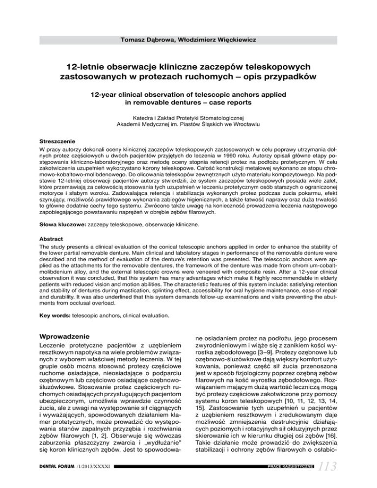 Tomasz Dąbrowa, Włodzimierz Więckiewicz 12-letnie obserwacje kliniczne zaczepów teleskopowych zastosowanych w protezach ruchomych – opis przypadków 12-year clinical observation of telescopic anchors applied in removable dentures – case reports Katedra i Zakład Protetyki Stomatologicznej Akademii Medycznej im. Piastów Śląskich we Wrocławiu Streszczenie W pracy autorzy dokonali oceny klinicznej zaczepów teleskopowych zastosowanych w celu poprawy utrzymania dolnych protez częściowych u dwóch pacjentów przyjętych do leczenia w 1990 roku. Autorzy opisali główne etapy postępowania kliniczno-laboratoryjnego oraz metodę oceny stopnia retencji protez na podłożu protetycznym. W celu zakotwiczenia uzupełnień wykorzystano korony teleskopowe. Całość konstrukcji metalowej wykonano ze stopu chromowo-kobaltowo-molibdenowego. Do olicowania teleskopów zewnętrznych użyto materiału kompozytowego. Na podstawie 12-letniej obserwacji pacjentów autorzy stwierdzili, że system zaczepów teleskopowych posiada wiele zalet, które przemawiają za celowością stosowania tych uzupełnień w leczeniu protetycznym osób starszych o ograniczonej motoryce i słabym wzroku. Zadowalająca retencja i stabilizacja wykonanych protez podczas żucia pokarmu, efekt szynujący, możliwość prawidłowego wykonania zabiegów higienicznych, a także łatwość naprawy oraz duża trwałość to główne dodatnie cechy tego systemu. Zwrócono także uwagę na konieczność prowadzenia leczenia następowego zapobiegającego powstawaniu naprężeń w obrębie zębów filarowych. Słowa kluczowe: zaczepy teleskopowe, obserwacje kliniczne. Abstract The study presents a clinical evaluation of the conical telescopic anchors applied in order to enhance the stability of the lower partial removable denture. Main clinical and labolatory stages in performance of the removable denture were described and the method of evaluation of the denture’s retention was presented. The telescopic anchors were applied as the attachments for the removable dentures, the framework of the denture was made from chromium-cobaltmolibdenium alloy, and the external telescopic crowns were veneered with composite resin. After a 12-year clinical observation it was concluded, that this system has many advantages which make it highly recommendable in elderly patients with reduced vision and motion abilities. The characteristic features of this system include: satisfying retention and stability of dentures during mastication, splinting effect, accessibility for oral hygiene maintenance, ease of repair and durability. It was also underlined that this system demands follow-up examinations and visits preventing the abutments from occlusal overload. Key words: telescopic anchors, clinical evaluation. Wprowadzenie Leczenie protetyczne pacjentów z uzębieniem resztkowym napotyka na wiele problemów związanych z wyborem właściwej metody leczenia. W tej grupie osób można stosować protezy częściowe ruchome osiadające, nieosiadające o podparciu ozębnowym lub częściowo osiadające ozębnowośluzówkowe. Stosowanie protez częściowych ruchomych osiadających przysługujących pacjentom ubezpieczonym, umożliwia wprawdzie czynność żucia, ale z uwagi na występowanie sił ciągnących i wyważających, spowodowanych działaniem klamer protetycznych, może prowadzić do występowania stanów zapalnych przyzębia i rozchwiania zębów filarowych [1, 2]. Obserwuje się wówczas zaburzenia płaszczyzny zwarcia i „wydłużanie” się koron klinicznych zębów. Jest to spowodowaDENTAL FORUM /1/2013/XXXXI ne osiadaniem protez na podłożu, jego procesem zwyrodnieniowym i wiąże się z zanikiem kości wyrostka zębodołowego [3–9]. Protezy ozębnowe lub ozębnowo-śluzówkowe dają większy komfort użytkowania, ponieważ część sił żucia przenoszona jest w sposób fizjologiczny poprzez ozębną zębów filarowych na kość wyrostka zębodołowego. Rozwiązaniem mającym dużą wartość leczniczą mogą być protezy częściowe zakotwiczone przy pomocy systemu koron teleskopowych [10, 11, 12, 13, 14, 15]. Zastosowanie tych uzupełnień u pacjentów z uzębieniem resztkowym i zredukowanym daje możliwość zmniejszenia destrukcyjnie działających poziomych i rotacyjnych sił okluzyjnych przez skierowanie ich w kierunku długiej osi zębów [16]. Takie działanie może prowadzić do zwiększenia stabilizacji i ochrony zębów filarowych o osłabioPRACE KAZUISTYCZNE 113 Tomasz Dąbrowa, Włodzimierz Więckiewicz nym przyzębiu, wpływając korzystnie na poprawę efektu czynnościowego. Korona teleskopowa stanowi zespół składający się z dwóch elementów. Jest to korona wewnętrzna, zwana patrycą lub koroną pierwotną, oraz korona zewnętrzna określana mianem matrycy lub korony wtórnej. Patryca jest osadzona na stałe na zębie filarowym, zaś matryca jest połączona z konstrukcją protezy. Matryca ma kształt zbliżony do zęba naturalnego [17–20]. Głównym celem artykułu jest kliniczna ocena opisywanych zaczepów po 12-letnim okresie obserwacji użytkowania dolnych protez częściowych z koronami teleskopowymi przez dwóch pacjentów przyjętych do leczenia w 1998 roku. Pacjentka H.B., lat 72, numer historii choroby 499/1999, została skierowana z przychodni rejonowej do Zakładu Protetyki Stomatologicznej AM we Wrocławiu w celu leczenia protetycznego. W badaniu klinicznym stwierdzono całkowity brak uzębienia w szczęce i obecność ośmiu zębów w żuchwie, tj. 31, 32, 33, 34, 41, 42, 43, 44 co odpowiada I klasie braków uzębienia według Kennedy’ego. Zęby 31, 32, 41, 42 były w III stopniu rozchwiania wg Entina. Pacjentka użytkowała starą całkowitą protezę górną, która była wielokrotnie naprawiana. Uskarżała się na dolegliwości bólowe, które sprawiała jej poprzednio wykonana proteza częściowa w żuchwie. Na podstawie przeprowadzonego badania ustalono plan leczenia, który polegał na wyk