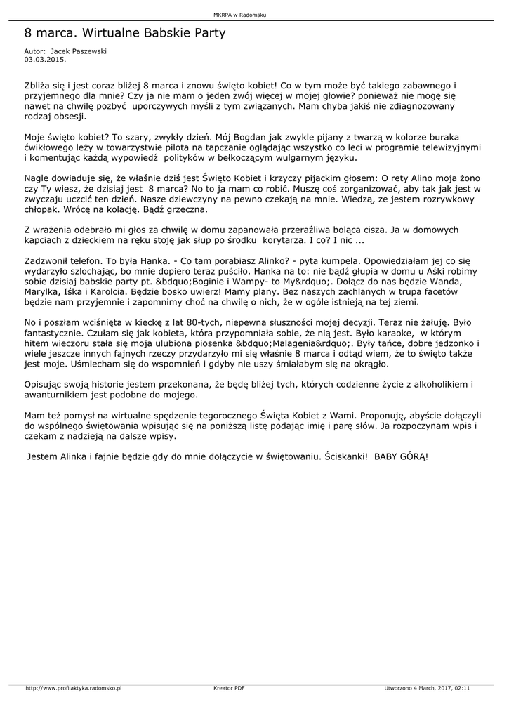 MKRPA w Radomsku 8 marca. Wirtualne Babskie Party Autor: Jacek Paszewski 03.03.2015. Zbliża się i jest coraz bliżej 8 marca i znowu święto kobiet! Co w tym może być takiego zabawnego i przyjemnego dla mnie? Czy ja nie mam o jeden zwój więcej w mojej głowie? ponieważ nie mogę się nawet na chwilę pozbyć uporczywych myśli z tym związanych. Mam chyba jakiś nie zdiagnozowany rodzaj obsesji. Moje święto kobiet? To szary, zwykły dzień. Mój Bogdan jak zwykle pijany z twarzą w kolorze buraka ćwikłowego leży w towarzystwie pilota na tapczanie oglądając wszystko co leci w programie telewizyjnymi i komentując każdą wypowiedź polityków w bełkoczącym wulgarnym języku. Nagle dowiaduje się, że właśnie dziś jest Święto Kobiet i krzyczy pijackim głosem: O rety Alino moja żono czy Ty wiesz, że dzisiaj jest 8 marca? No to ja mam co robić. Muszę coś zorganizować, aby tak jak jest w zwyczaju uczcić ten dzień. Nasze dziewczyny na pewno czekają na mnie. Wiedzą, ze jestem rozrywkowy chłopak. Wrócę na kolację. Bądź grzeczna. Z wrażenia odebrało mi głos za chwilę w domu zapanowała przeraźliwa boląca cisza. Ja w domowych kapciach z dzieckiem na ręku stoję jak słup po środku korytarza. I co? I nic ... Zadzwonił telefon. To była Hanka. - Co tam porabiasz Alinko? - pyta kumpela. Opowiedziałam jej co się wydarzyło szlochając, bo mnie dopiero teraz puściło. Hanka na to: nie bądź głupia w domu u Aśki robimy sobie dzisiaj babskie party pt. „Boginie i Wampy- to My”. Dołącz do nas będzie Wanda, Marylka, Iśka i Karolcia. Będzie bosko uwierz! Mamy plany. Bez naszych zachlanych w trupa facetów będzie nam przyjemnie i zapomnimy choć na chwilę o nich, że w ogóle istnieją na tej ziemi. No i poszłam wciśnięta w kieckę z lat 80-tych, niepewna słuszności mojej decyzji. Teraz nie żałuję. Było fantastycznie. Czułam się jak kobieta, która przypomniała sobie, że nią jest. Było karaoke, w którym hitem wieczoru stała się moja ulubiona piosenka „Malagenia”. Były tańce, dobre jedzonko i wiele jeszcze innych fajnych rzeczy przydarzyło mi się właśnie 8 marca i odtąd wiem, że to święto także jest moje. Uśmiecham się do wspomnień i gdyby nie uszy śmiałabym się na okrągło. Opisując swoją historie jestem przekonana, że będę bliżej tych, których codzienne życie z alkoholikiem i awanturnikiem jest podobne do mojego. Mam też pomysł na wirtualne spędzenie tegorocznego Święta Kobiet z Wami. Proponuję, abyście dołączyli do wspólnego świętowania wpisując się na poniższą listę podając imię i parę słów. Ja rozpoczynam wpis i czekam z nadzieją na dalsze wpisy. Jestem Alinka i fajnie będzie gdy do mnie dołączycie w świętowaniu. Ściskanki! BABY GÓRĄ! http://www.profilaktyka.radomsko.pl Kreator PDF Utworzono 4 March, 2017, 02:11