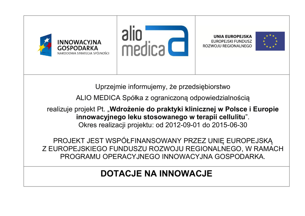 Uprzejmie informujemy, że przedsiębiorstwo ALIO MEDICA Spółka z ograniczoną odpowiedzialnością realizuje projekt Pt. „Wdrożenie do praktyki klinicznej w Polsce i Europie innowacyjnego leku stosowanego w terapii cellulitu”. Okres realizacji projektu: od 2012-09-01 do 2015-06-30 PROJEKT JEST WSPÓŁFINANSOWANY PRZEZ UNIĘ EUROPEJSKĄ Z EUROPEJSKIEGO FUNDUSZU ROZWOJU REGIONALNEGO, W RAMACH PROGRAMU OPERACYJNEGO INNOWACYJNA GOSPODARKA. DOTACJE NA INNOWACJE